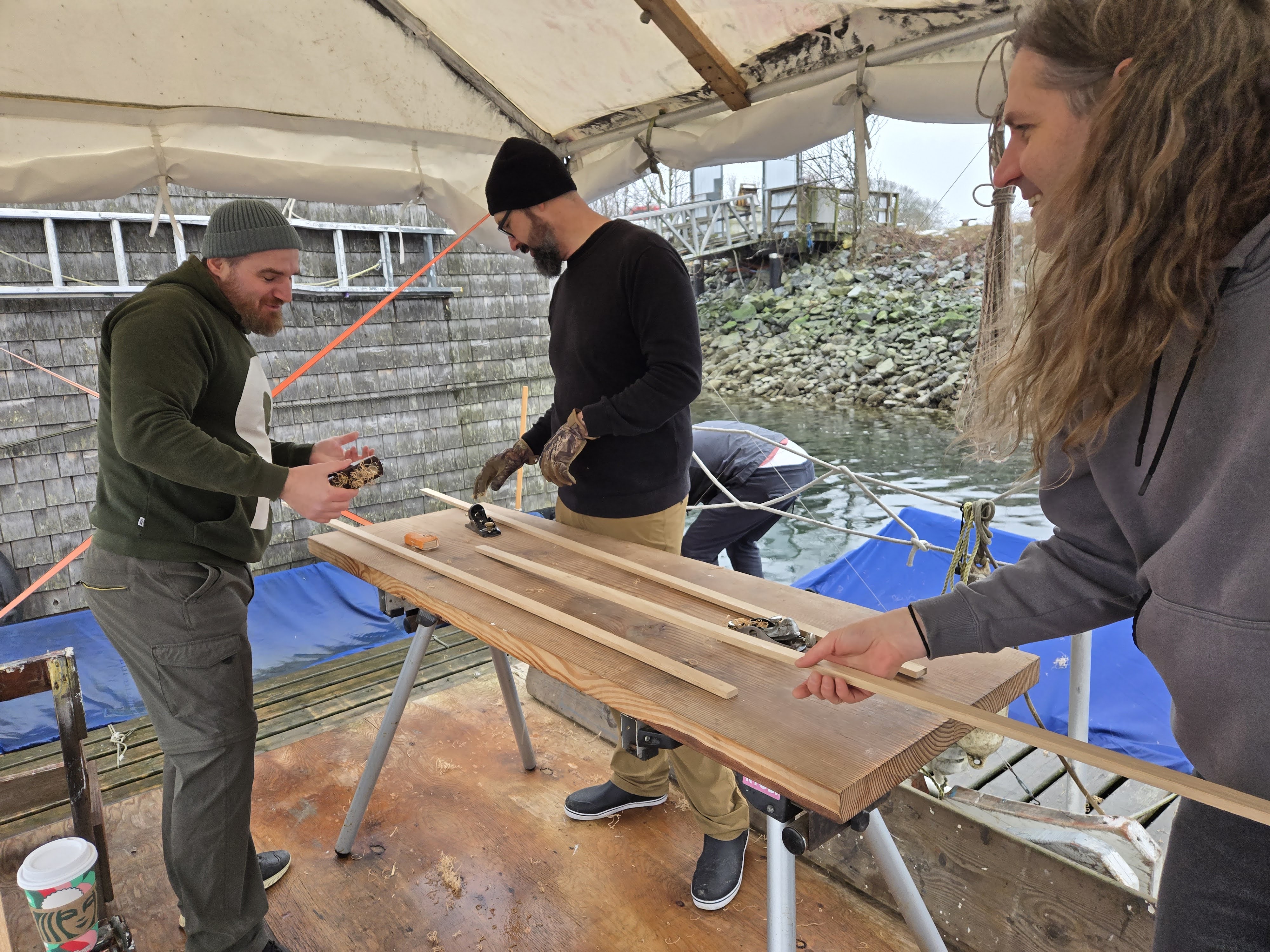 We’ve got (and nearly sold out) a new shipment of t-shirts! And we’ve started on some boat maintenance, beginning with new gaff jaw leathers for Button Swan.
