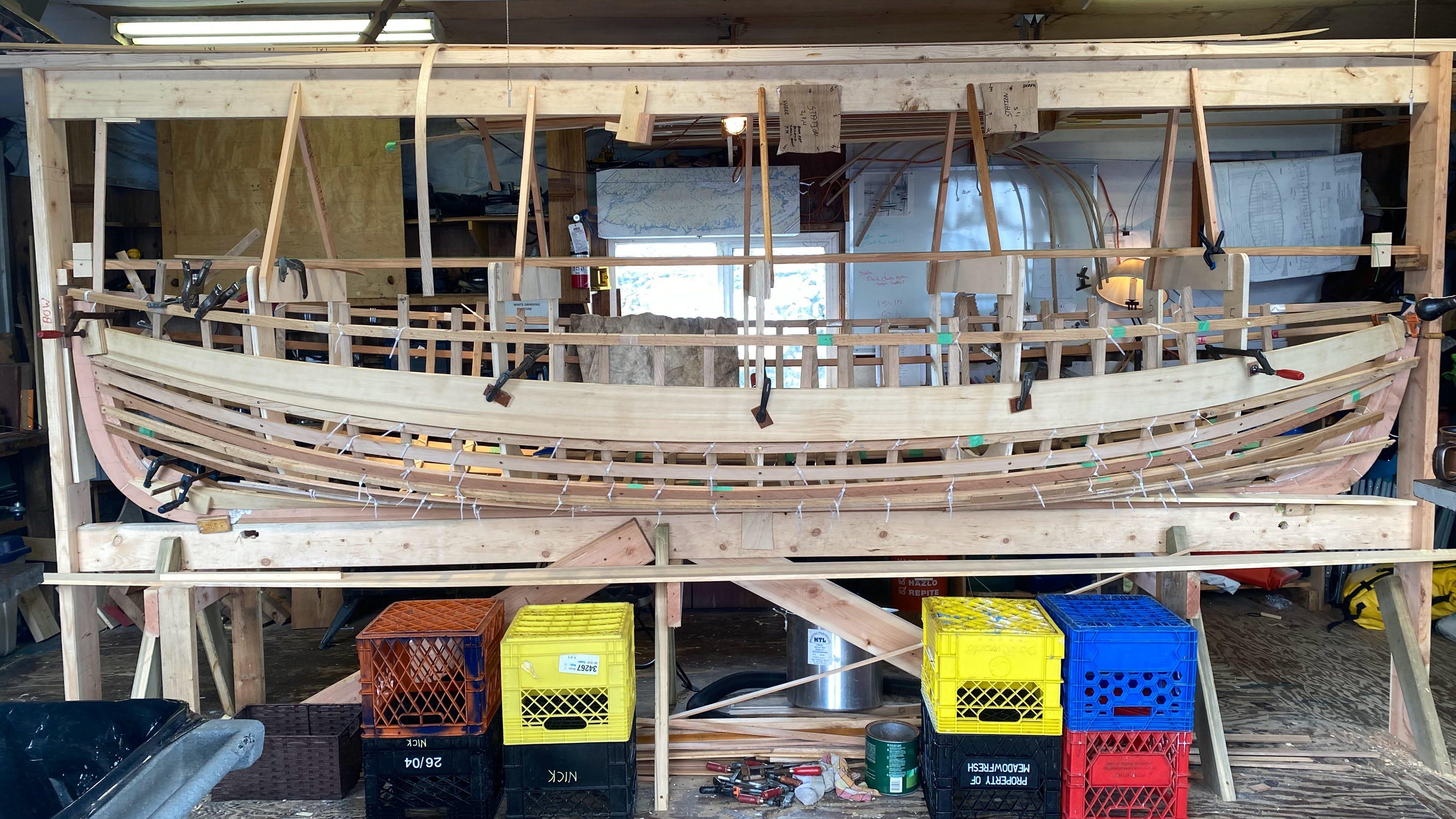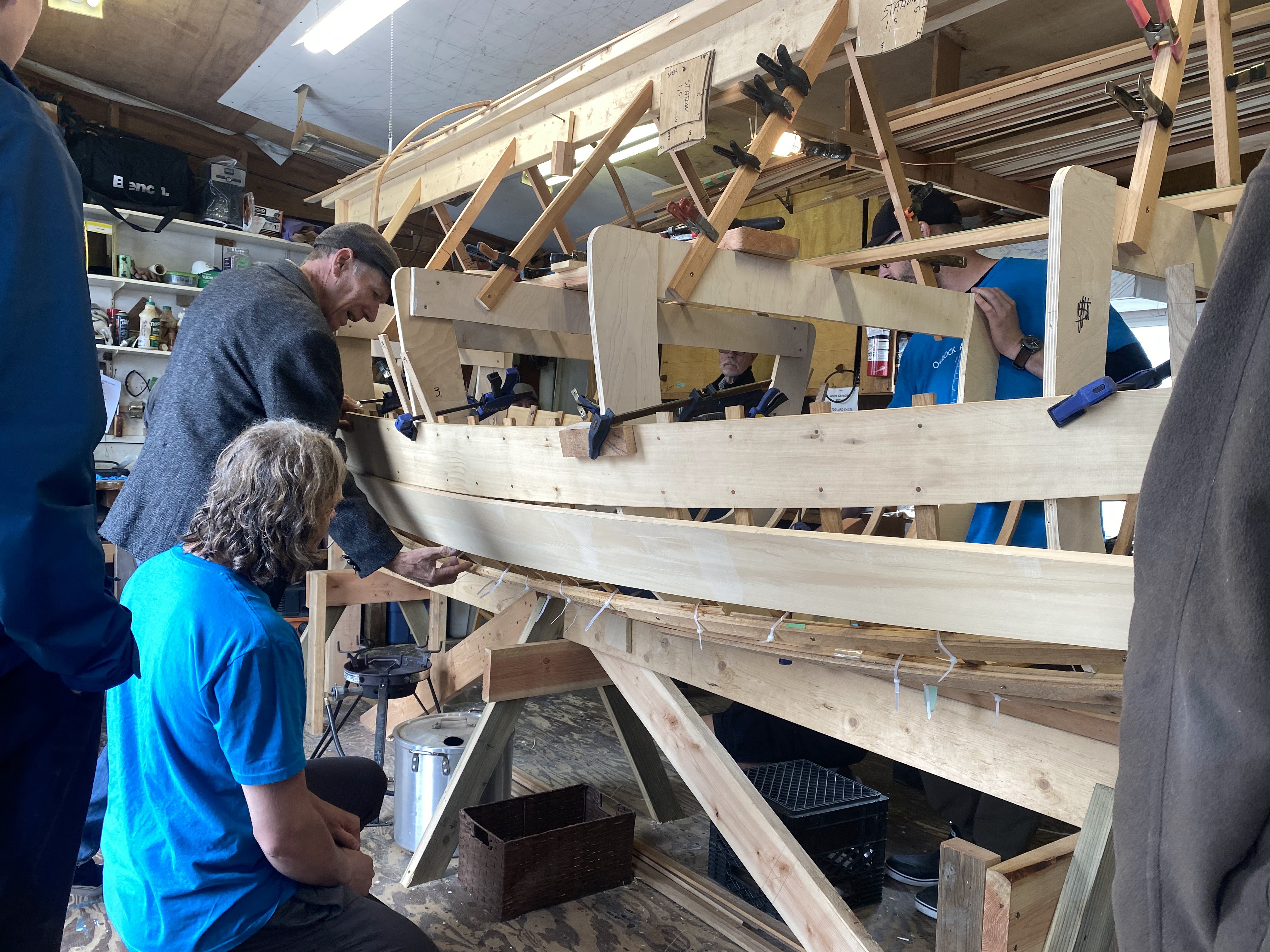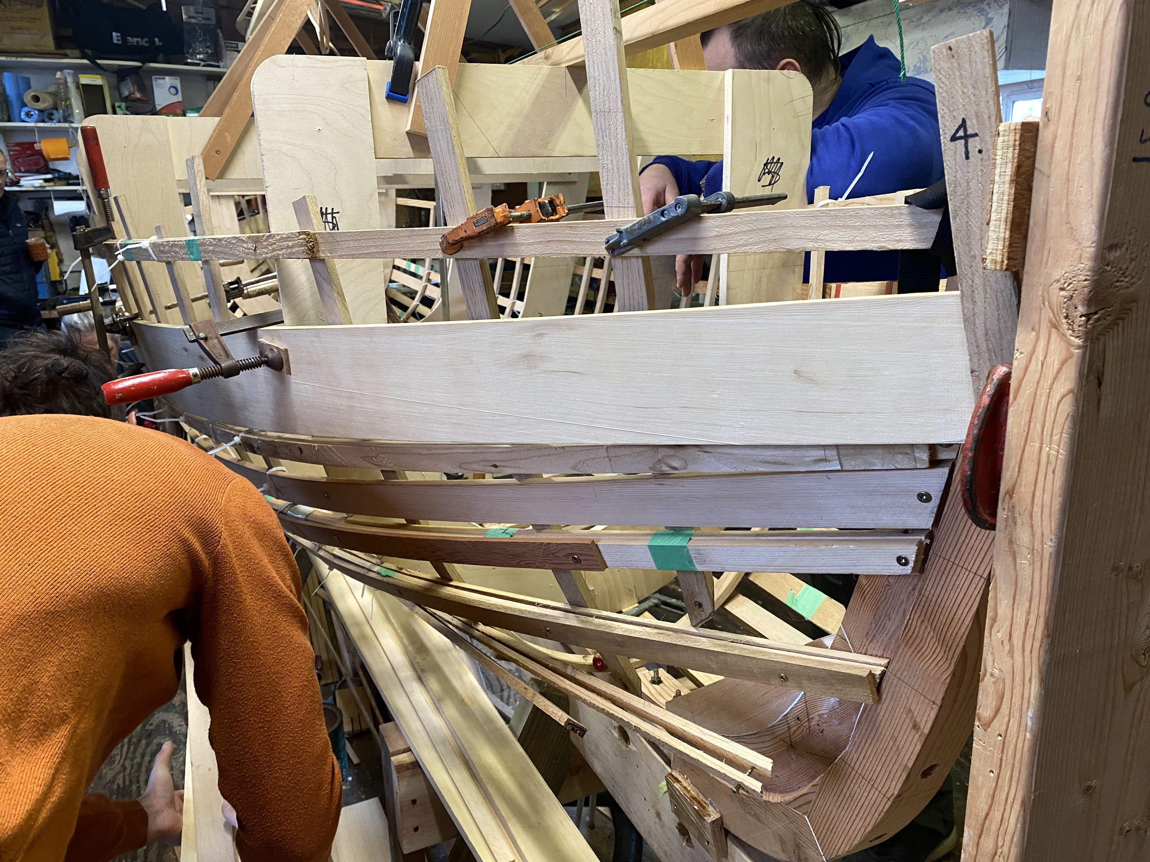 We’ve riveted the first few planks to the boat! The sheer strake and garboard on both sides are in place and fastened. We’re now working on the next sets of planks, and will be working our way up and down on both sides of the gap to meet in the middle.