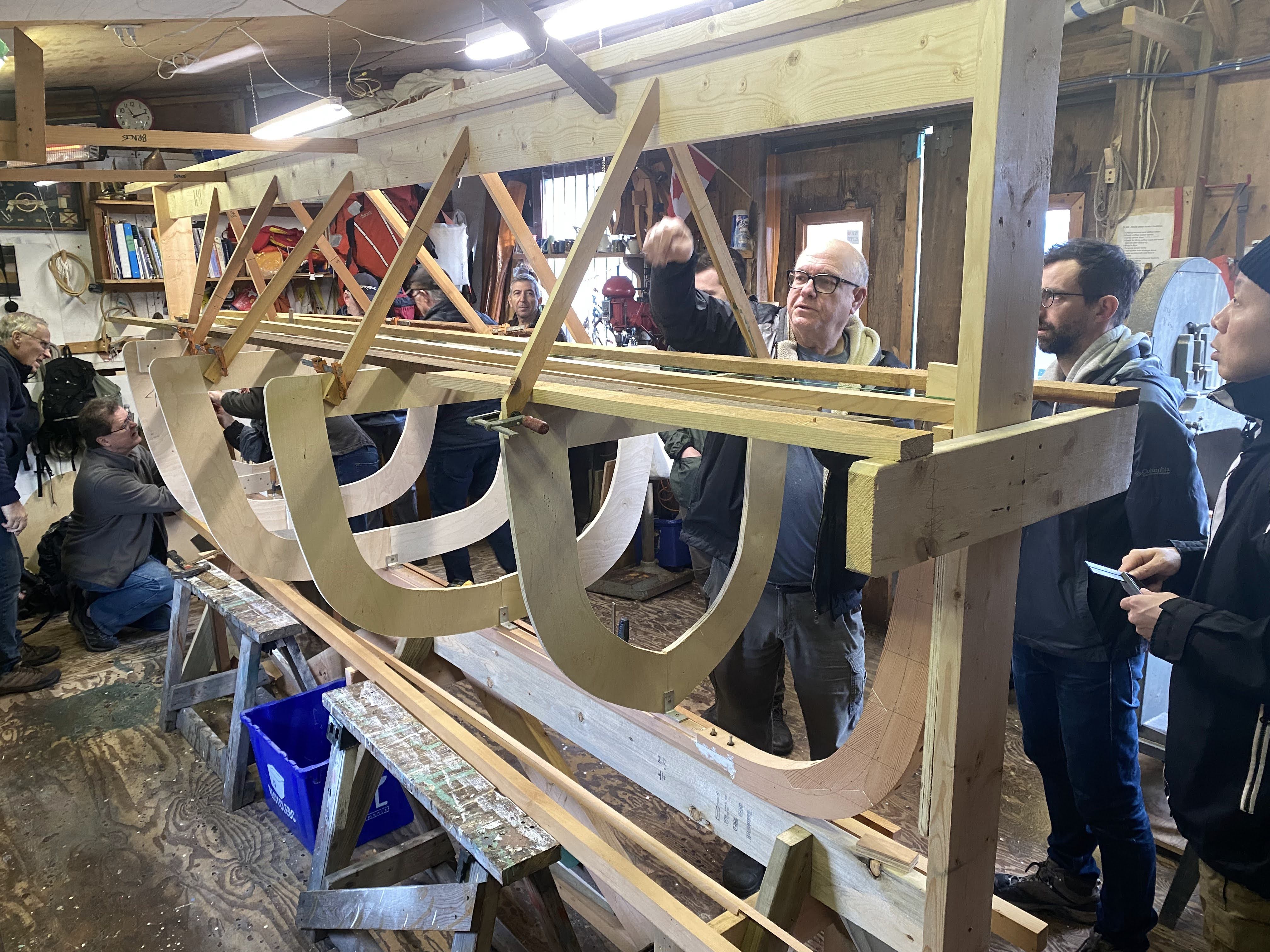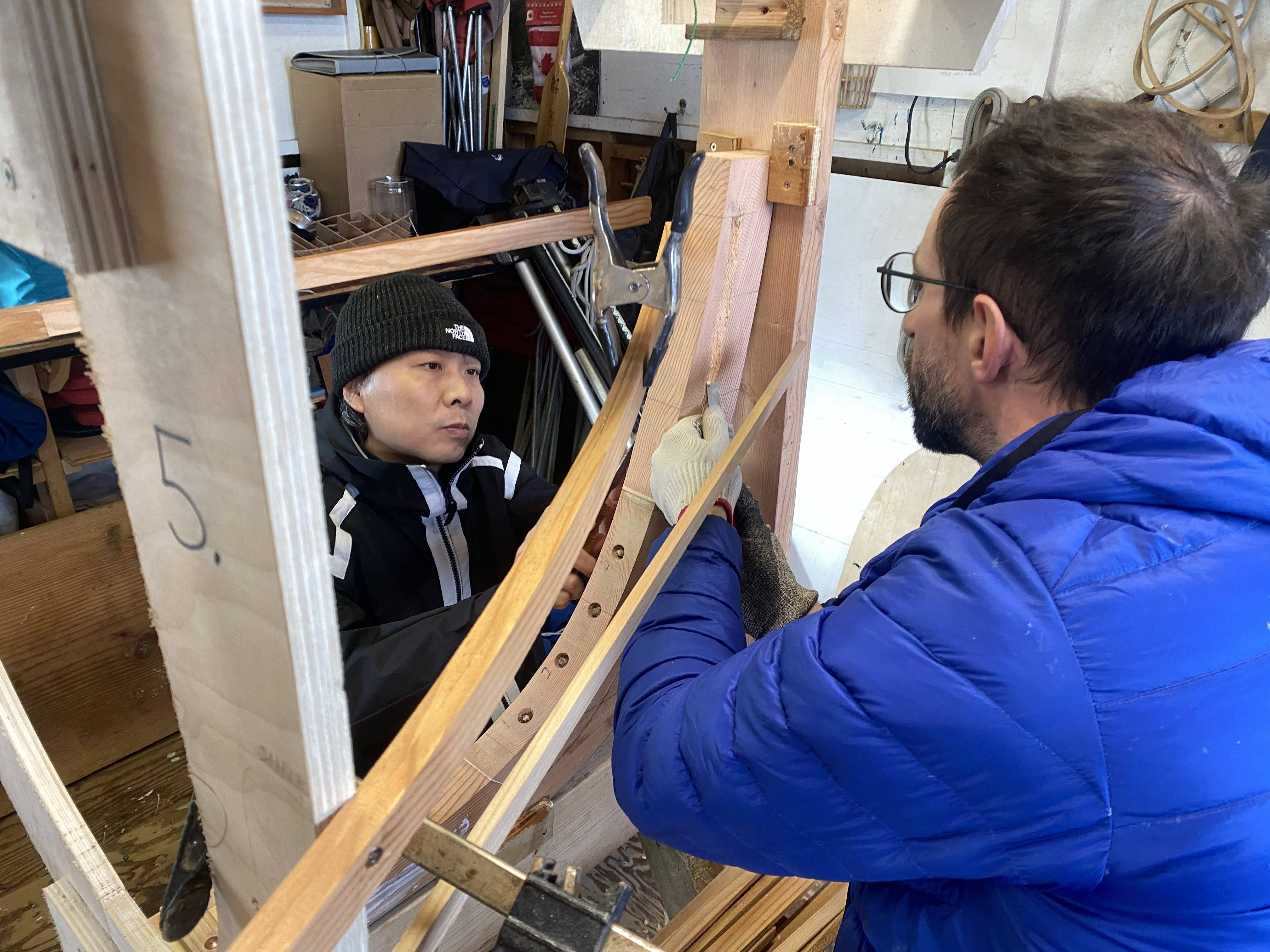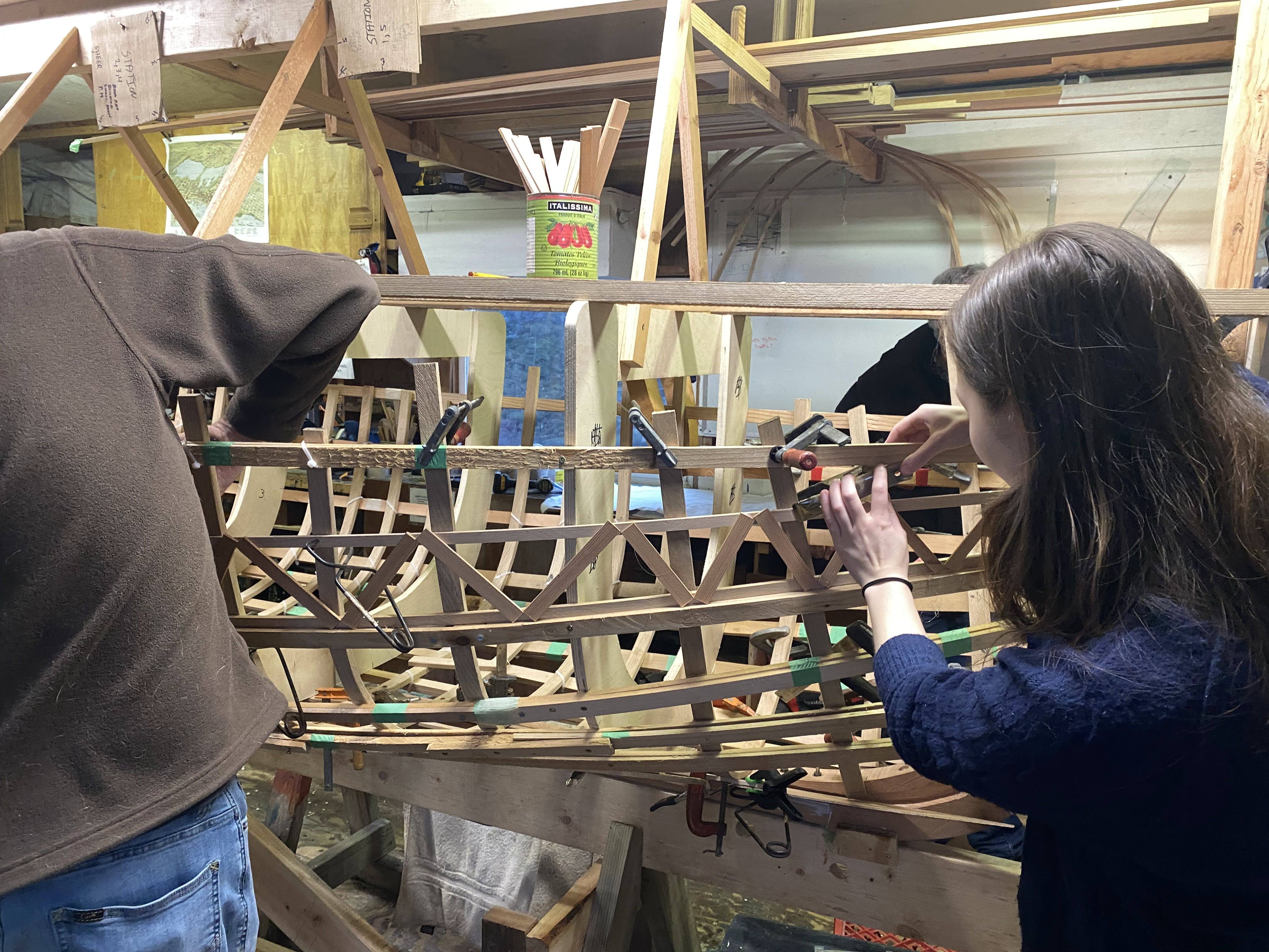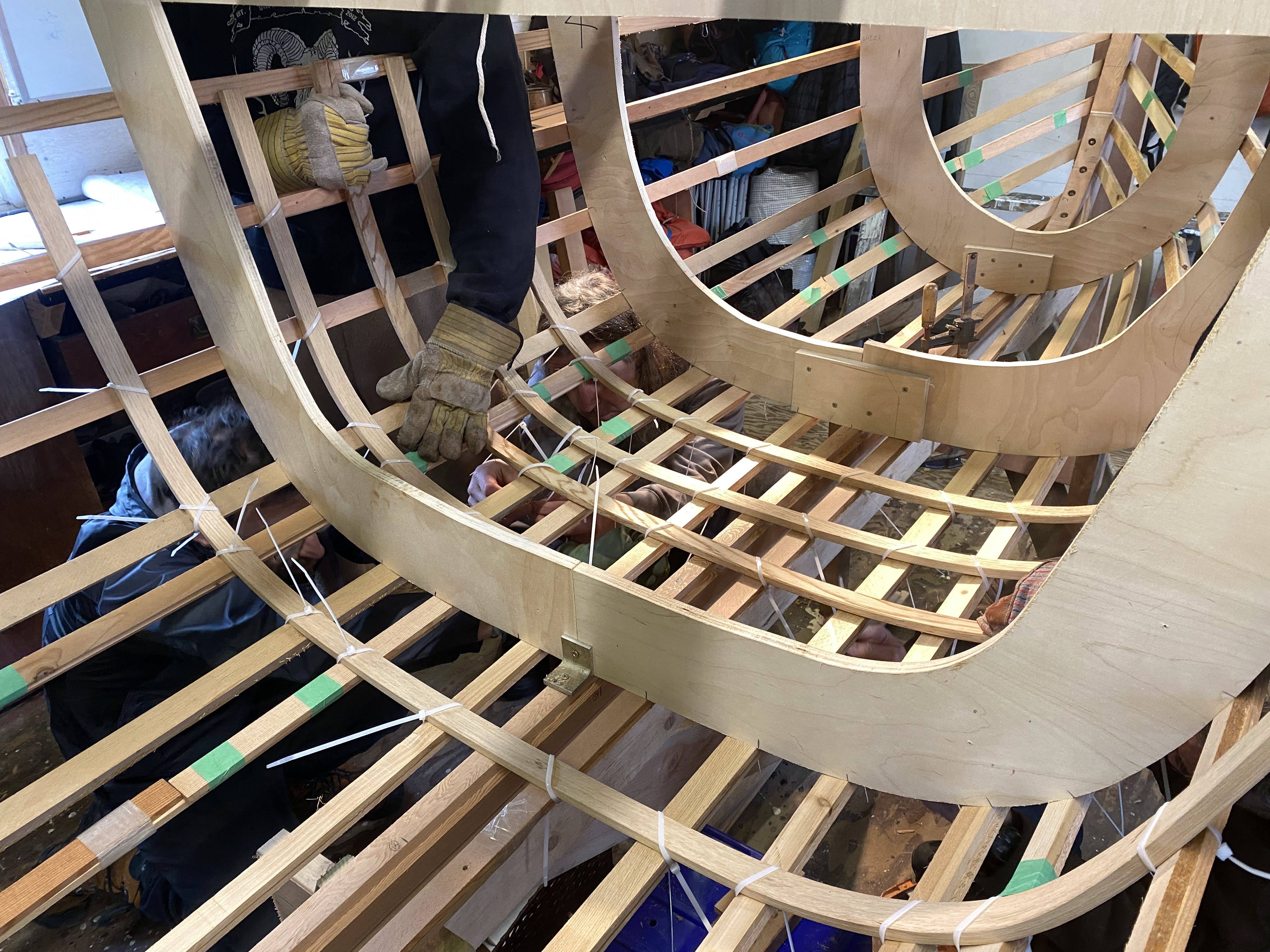 We’ve riveted the first few planks to the boat! The sheer strake and garboard on both sides are in place and fastened. We’re now working on the next sets of planks, and will be working our way up and down on both sides of the gap to meet in the middle.