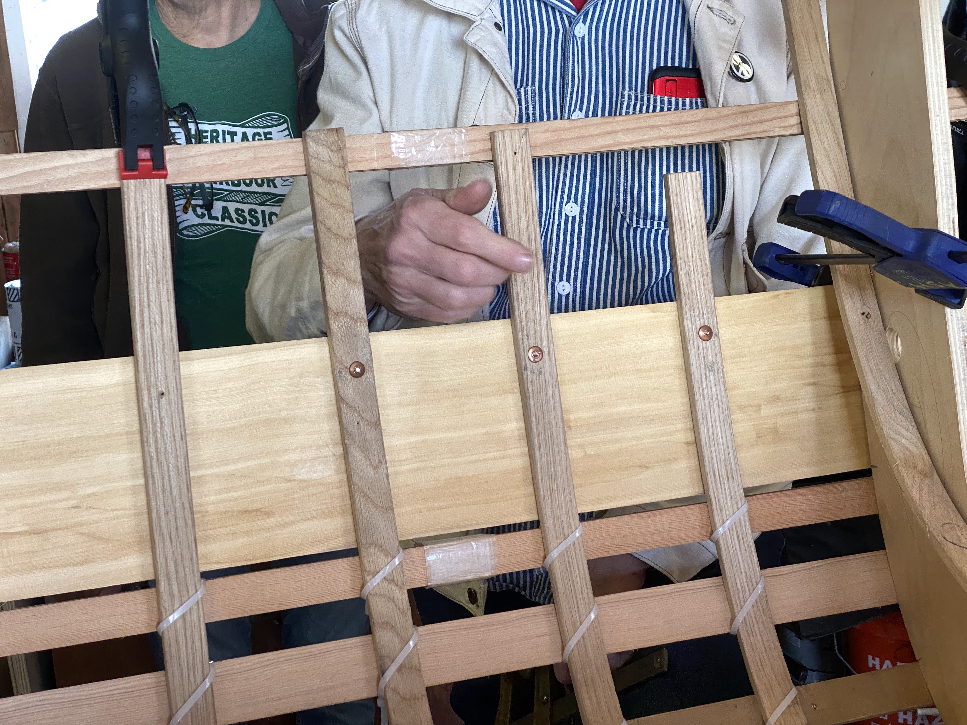 The first boards to be fastened to the boat were the sheer strakes, the uppermost planks on the boat. After shaping the edges of the planks, we had to “back out”, which is rounding out the inner face of the plank, to fit the curve of the frames. We used a hollowing plane with a convex set of gauges to guide us. Once we got them riveted in place, we were free to trim off the excess length of the frames, giving us the first look at the final height of the boat.