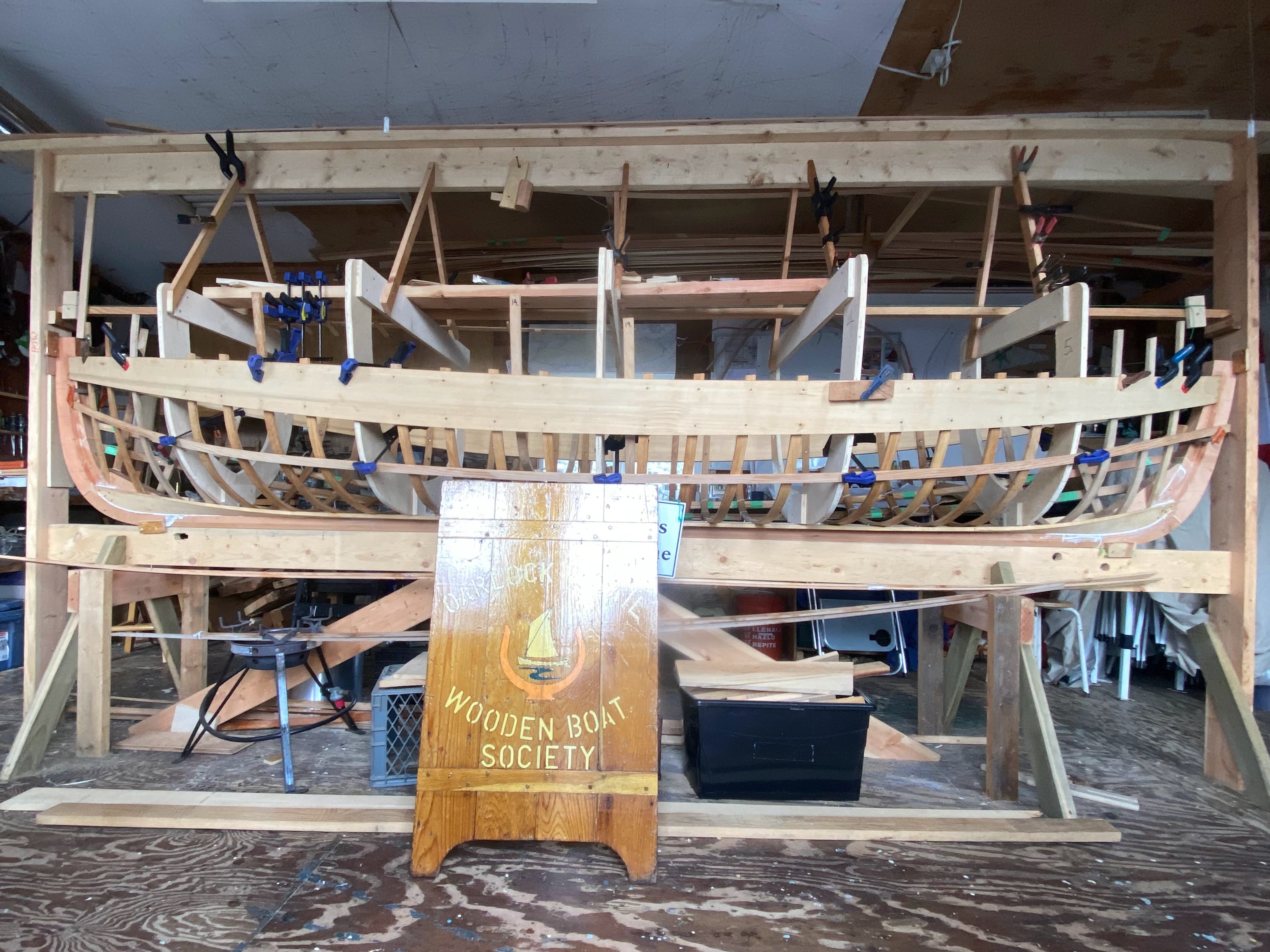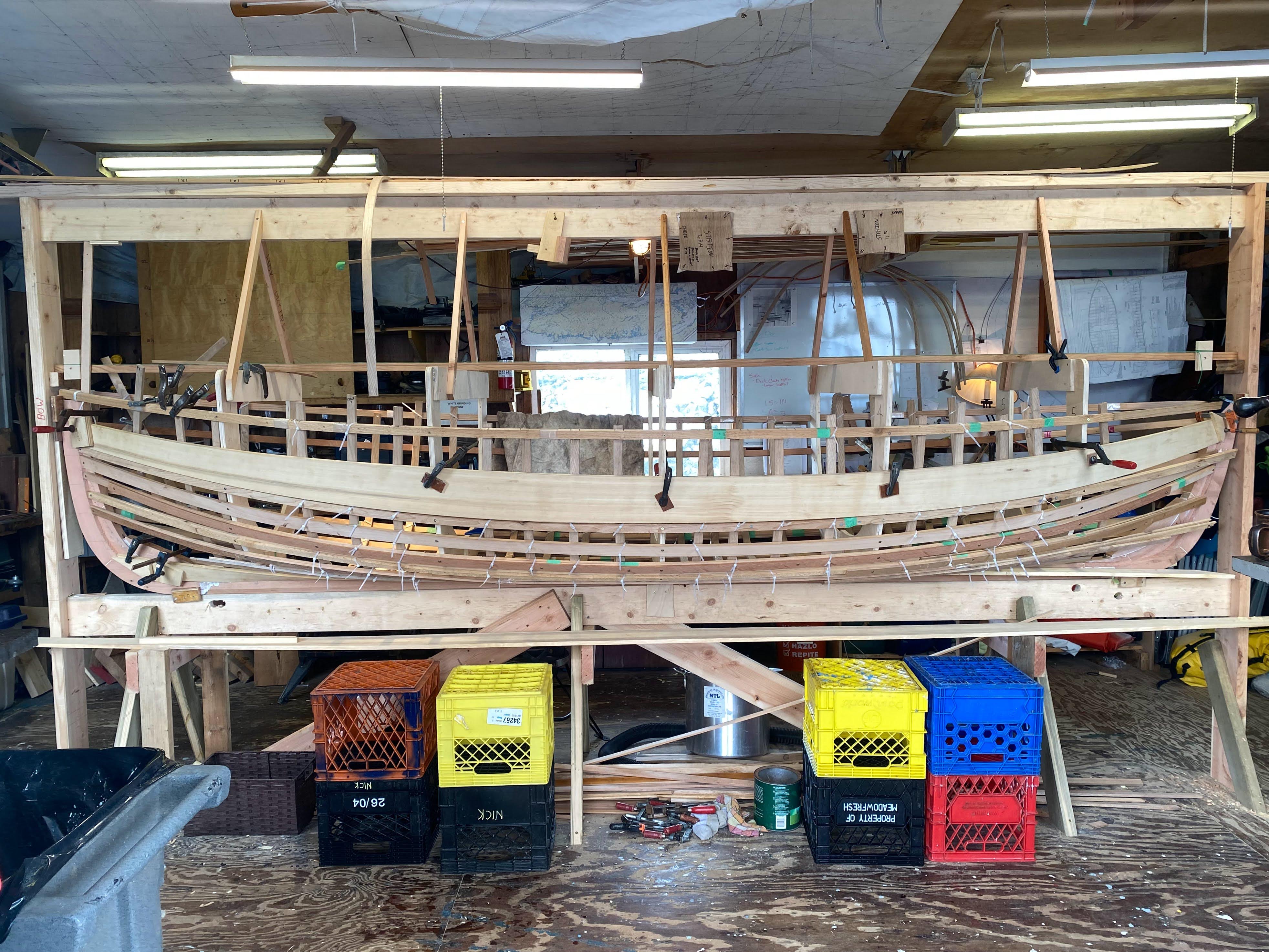 We’ve riveted the first few planks to the boat! The sheer strake and garboard on both sides are in place and fastened. We’re now working on the next sets of planks, and will be working our way up and down on both sides of the gap to meet in the middle.