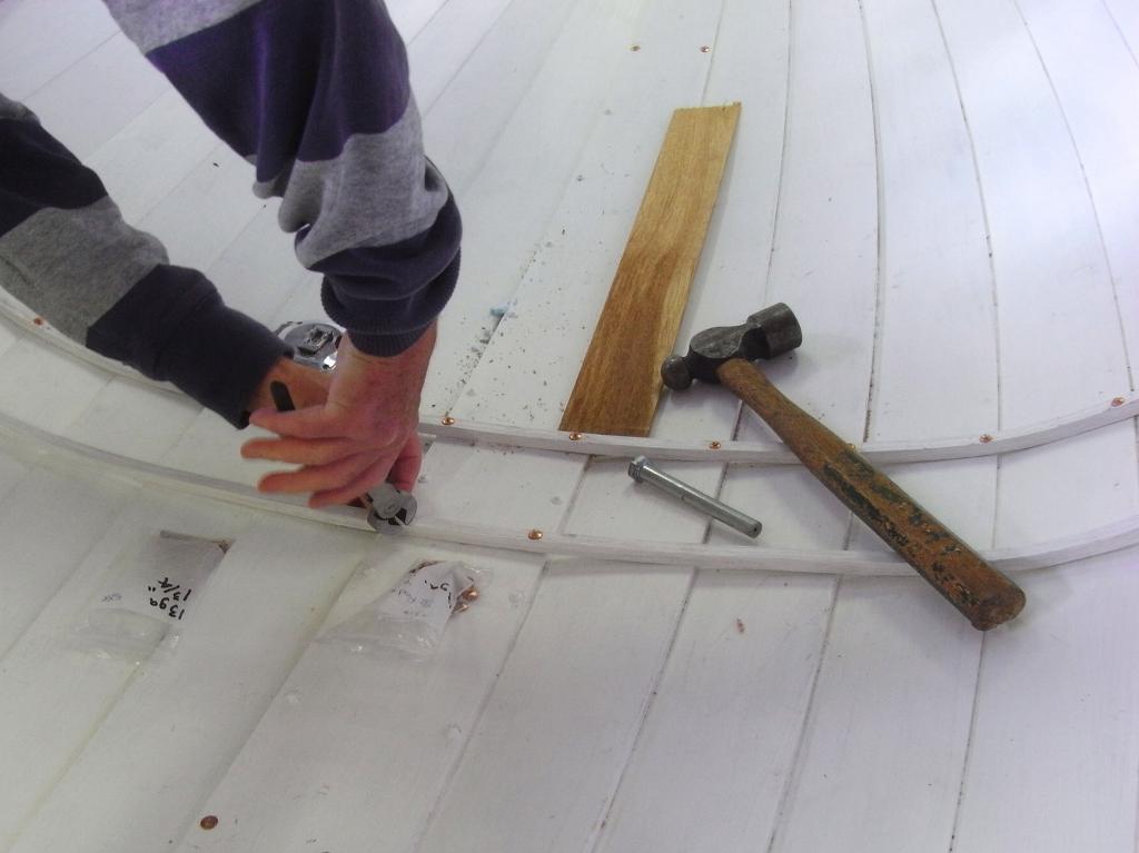 Then, long time member Gerry Stensgaard came down to lead a refresher course on the finer points of creating rivets with copper nails and specialized washers called roves and how to use them to make fast the boat’s frames or ribs, to the planking. Thanks again Gerry!