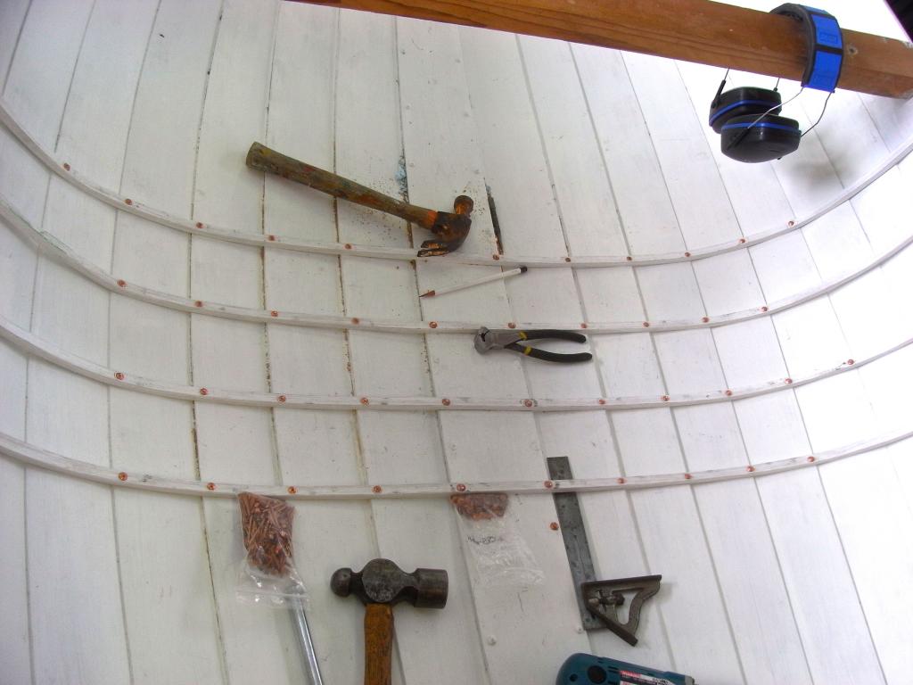 So the pram came back to the shed on the heritage harbour and we started to frame in earnest. Here a club member uses a pair of end nippers to clip off a nail after a rove has been driven home in preparation for peening. This is how a rivet is made.