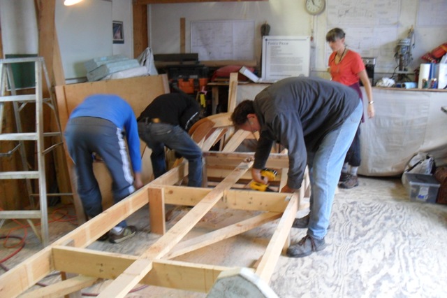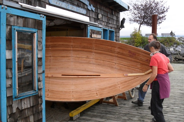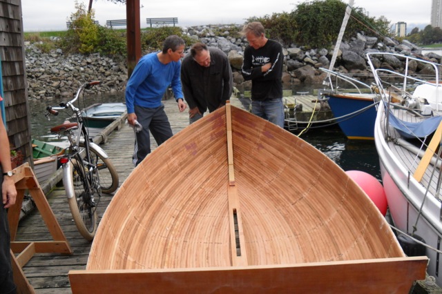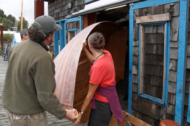 It is made of cedar so very light.A proud crew!Plotting and planning the next steps.This is the mold it was sitting on. Arnt will save those for the next boat similar to this one.New platform built to hold the flipped Riff.Back in the shop.The cradle ready for the next stage.Sanding the inside making it ready for the fibreglass and epoxy.