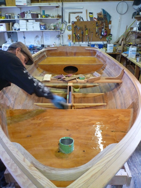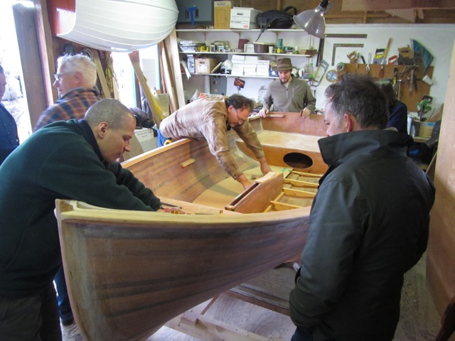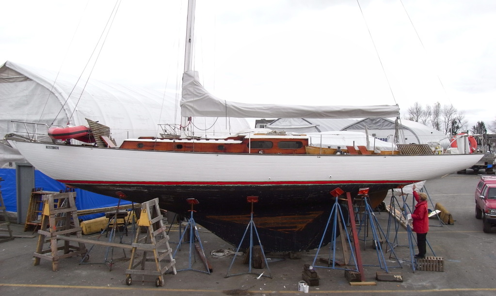 ERN a 37-foot Barkhouse mahogany cutter owned by four of our members Rob, Sharon, Georgina and Tom is moored across from our float house workshop and is getting a new spruce mast. They have set up a very long workbench at Peters shop and are making a tapered 45′ mast.