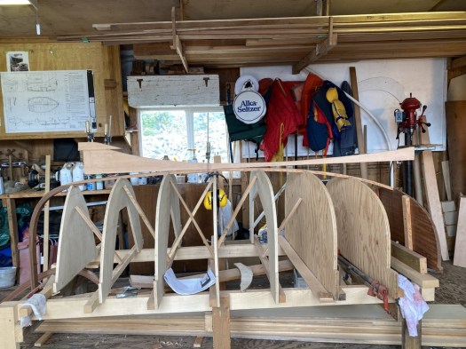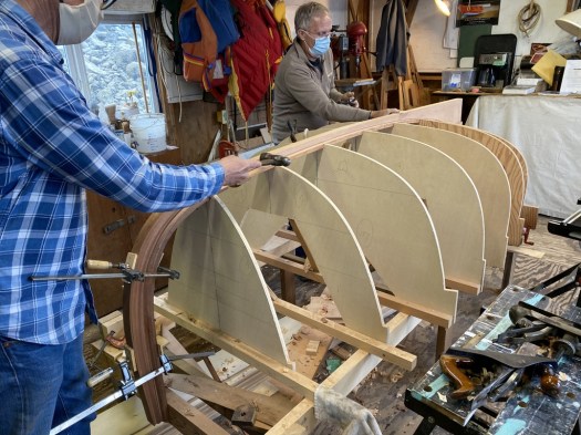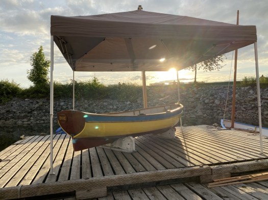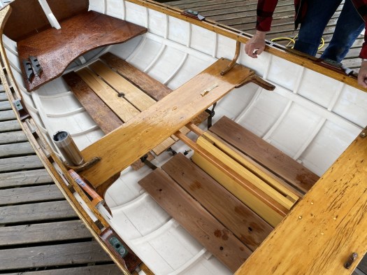 Out on the dock, our other project of Enke refinement is coming along nicely – we’ve got her new floor-boards steam bent in place, and have made cleats to fasten them to, to make them easily removable for cleaning.