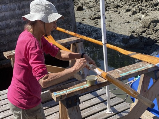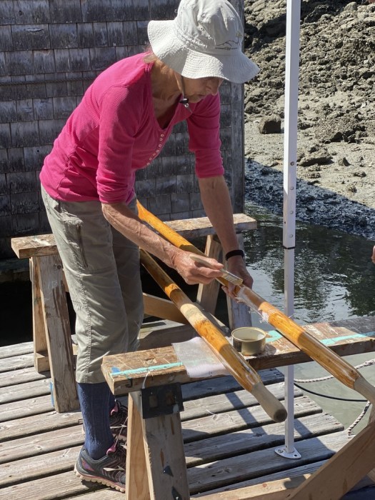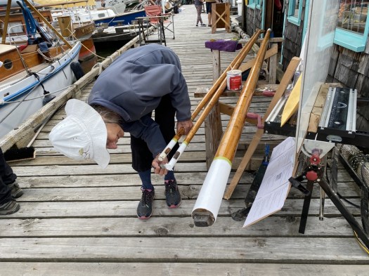 Enke’s oars have been given a layer of fiberglass to repair some wear from the oarlocks, and the spars have the white tips given a bright fresh coat.