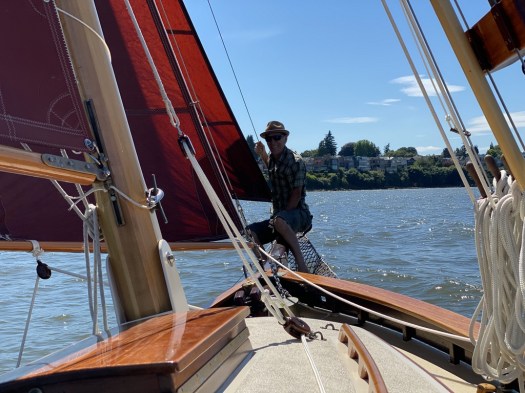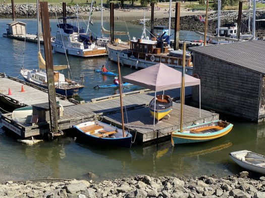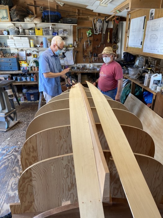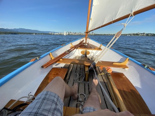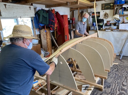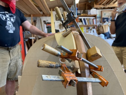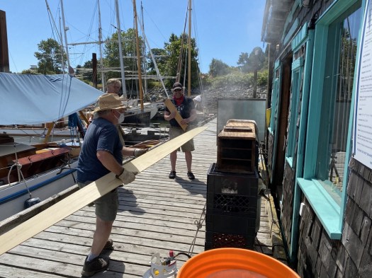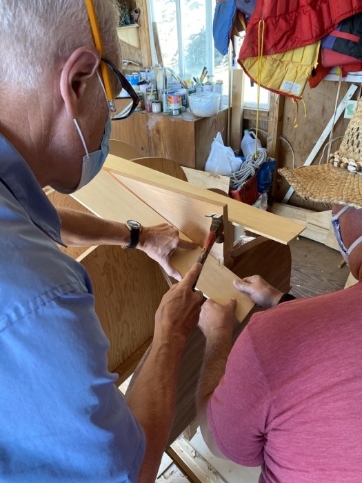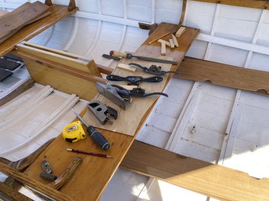 Enke’s floorboards are getting close to completion – some fine-tuning to get the cleats to fit, and we got a start on the toggles to hold them in place. It’s been nice to have the pop-up tent on the dock for shade from the hot sun.