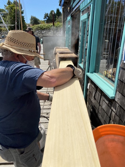 After spiling and shaping the planks the previous week, we set up Nick’s steam box and steamed the forward end of the two garboard planks, then clamped them in place with a tight twist at the stem. It worked nicely – amazing what the steam allows us to do!
