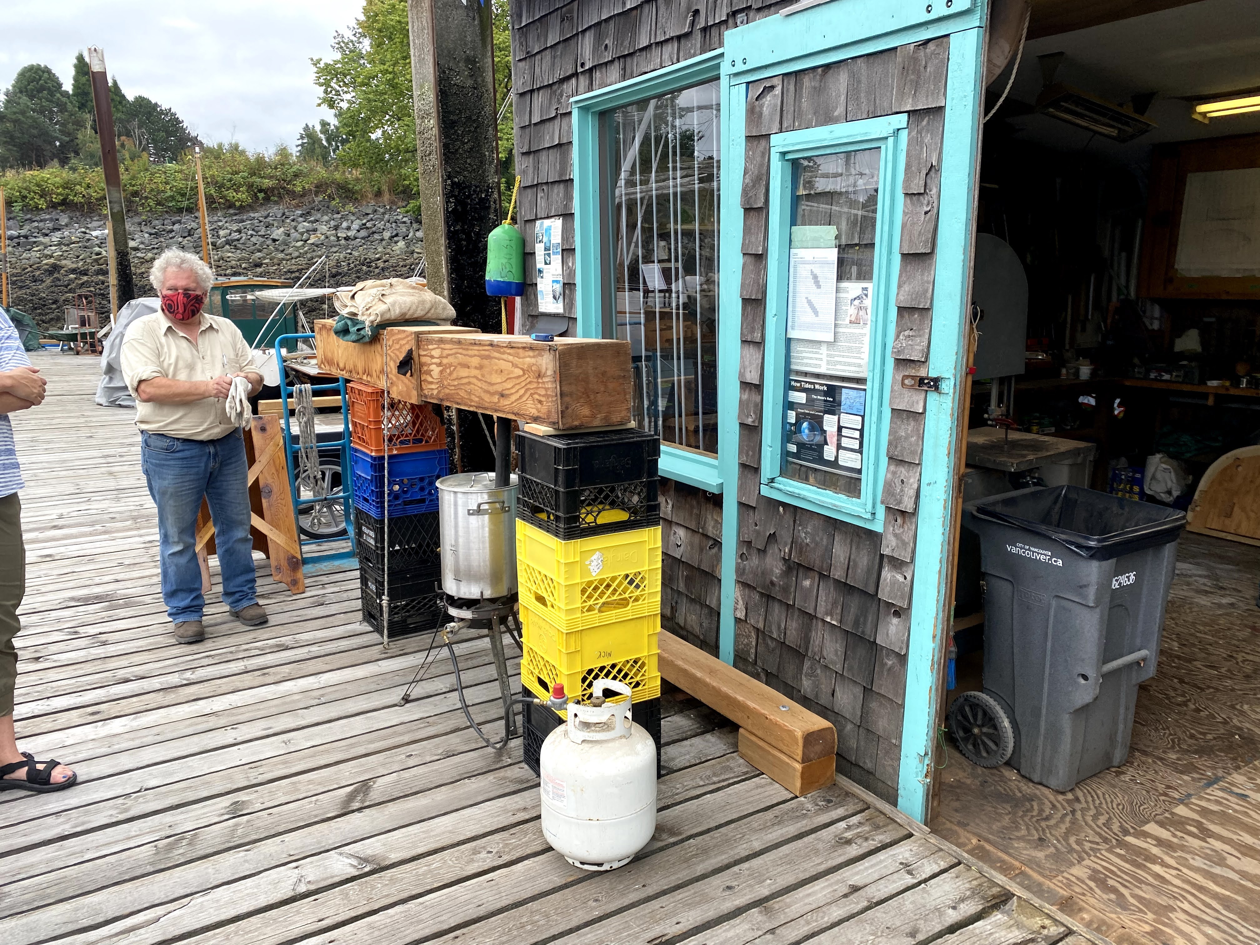 Nick brought his steam box and turkey fryer, and got it fired up. Brent had prepared the stock beforehand, using wood from the same batch as what he used for frames on his big boat, Ricochet. Very appropriate, as this little boat will serve as a tender on Ricochet.