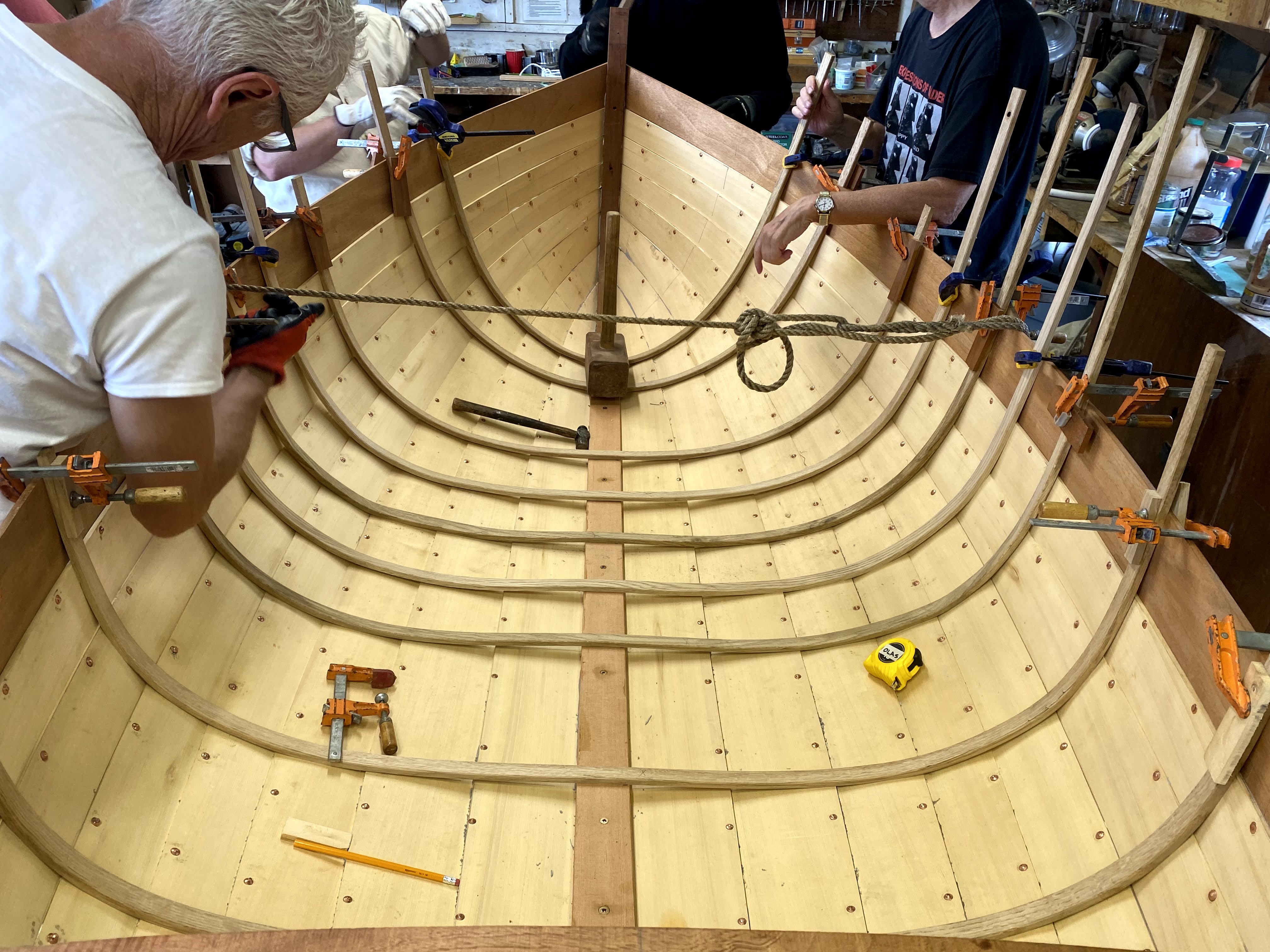 The boat has ribs! Saturday was a very productive day, with all the white oak ribs steamed and bent to shape!