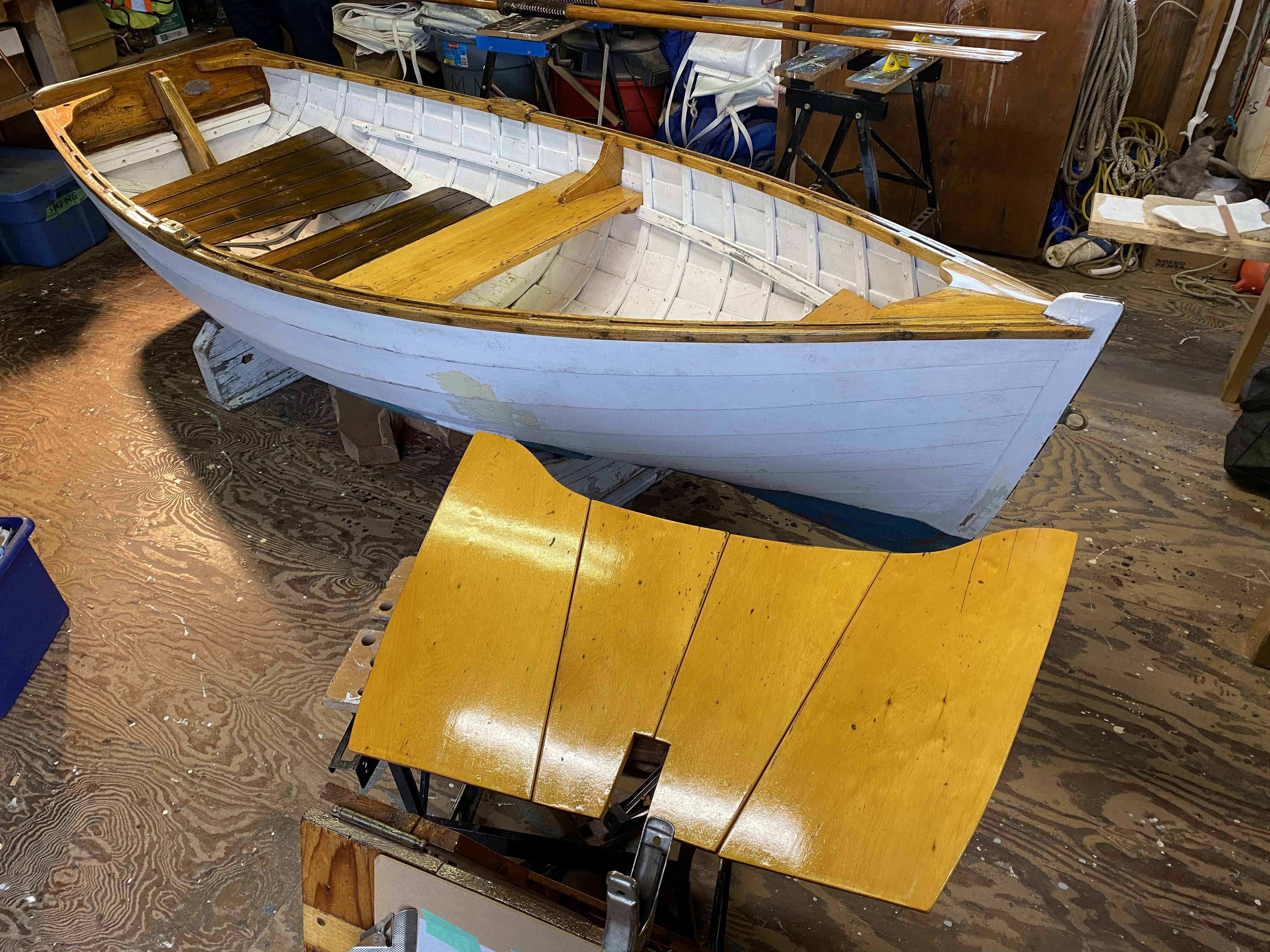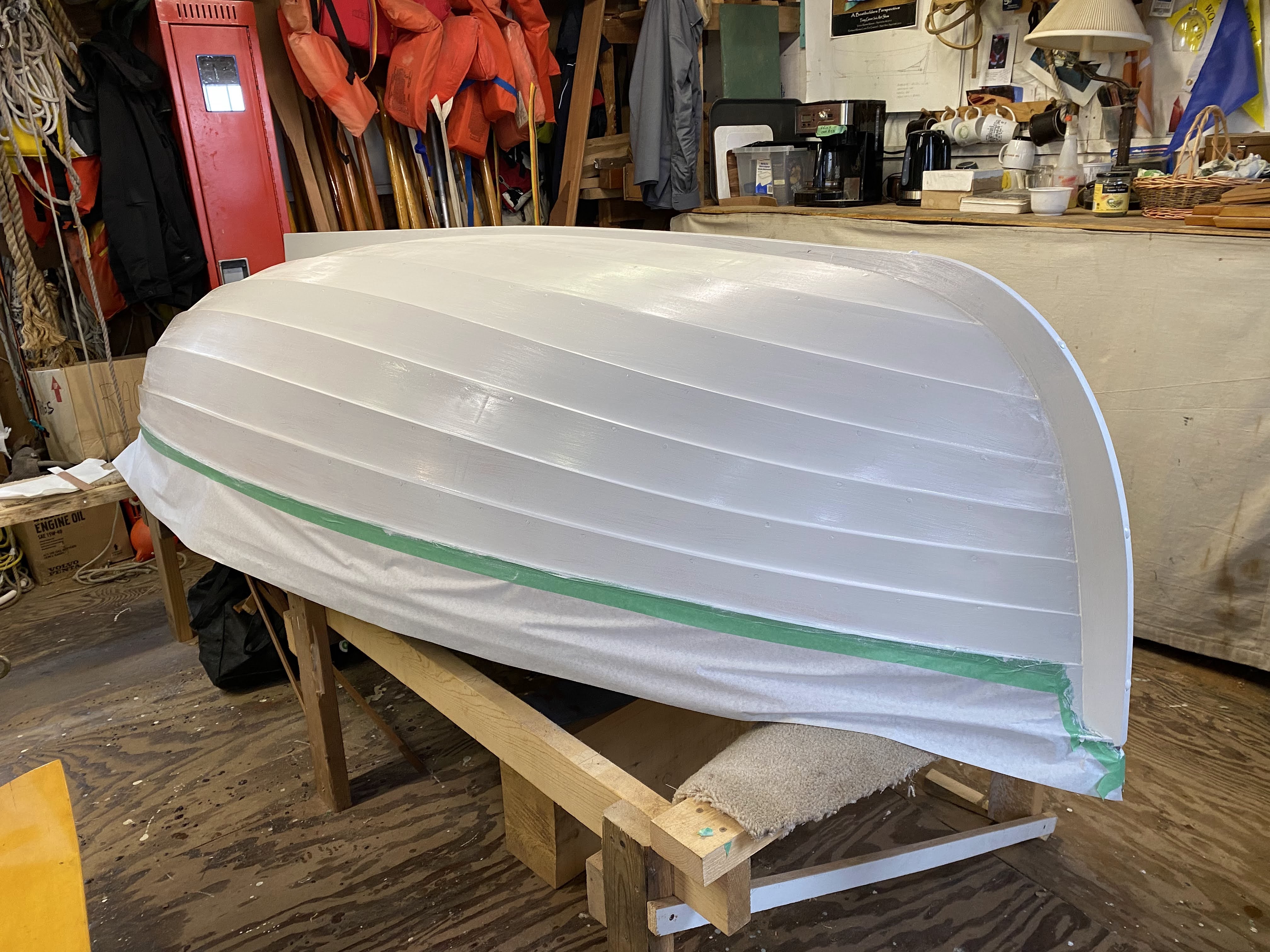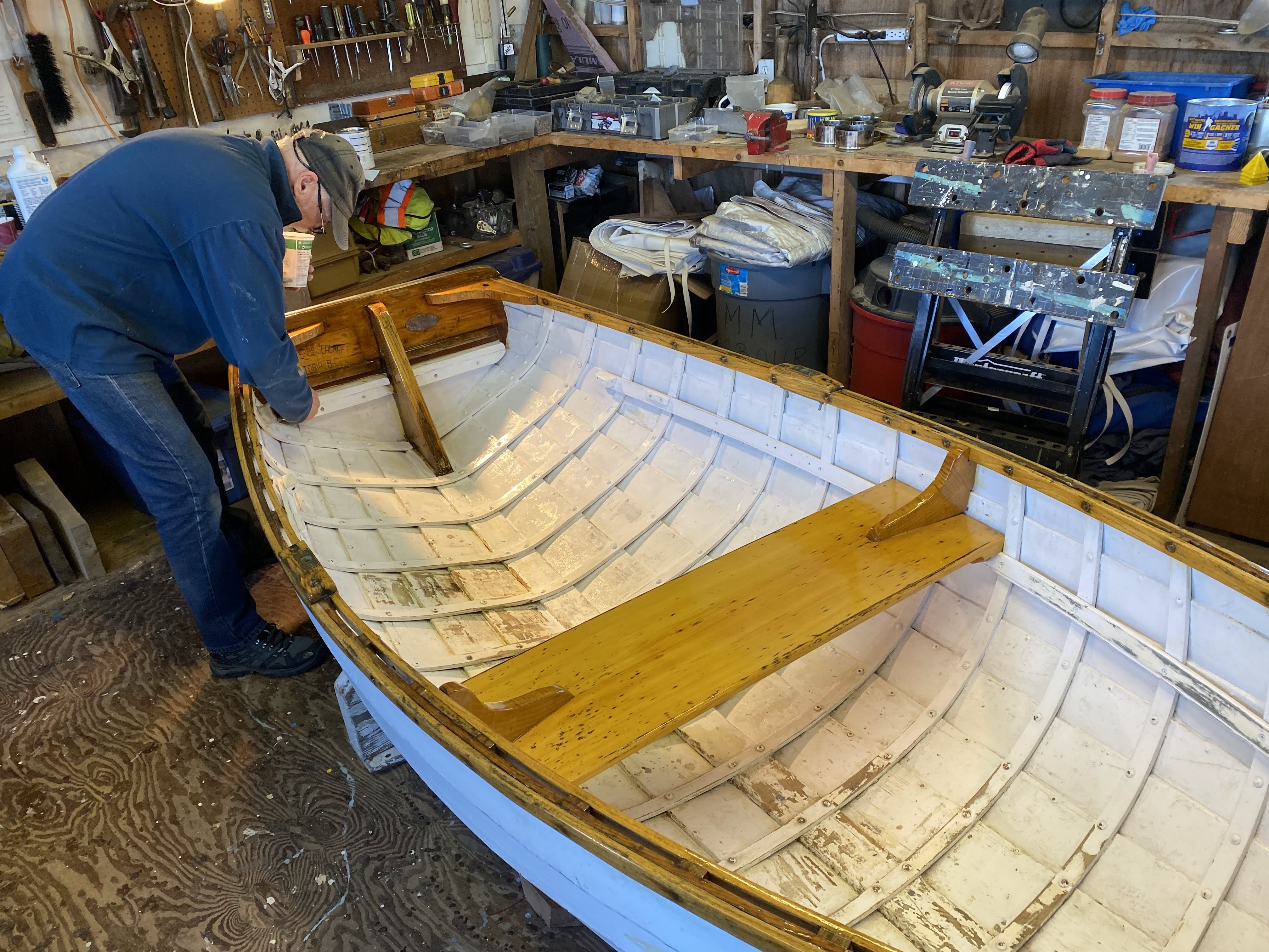 The Vogler has new varnish on the thwarts and gunwales, and we’ve started with paint on the interior.