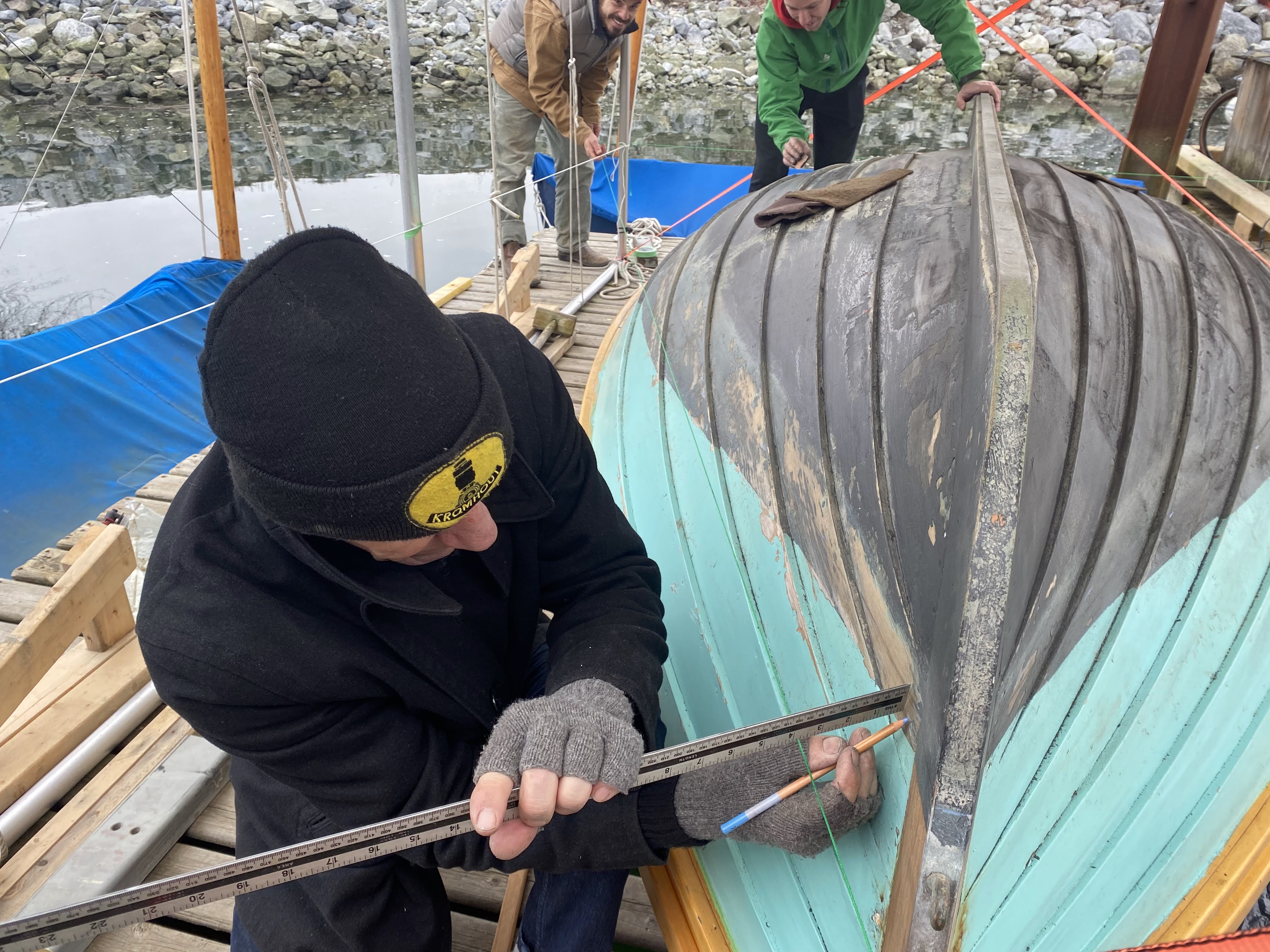 Things were going along quite well until a pandemic of covid arrived in early 2020. Nonetheless a few hardy souls were able, between lockdowns, to slowly continue, overthinking every detail, carefully spiling and shaping yellow cedar planks, and riveting them into a boat-like shape. It turned out that switching from plywood and epoxy to solid cedar and copper rivets was somewhat more complicated than we had anticipated.