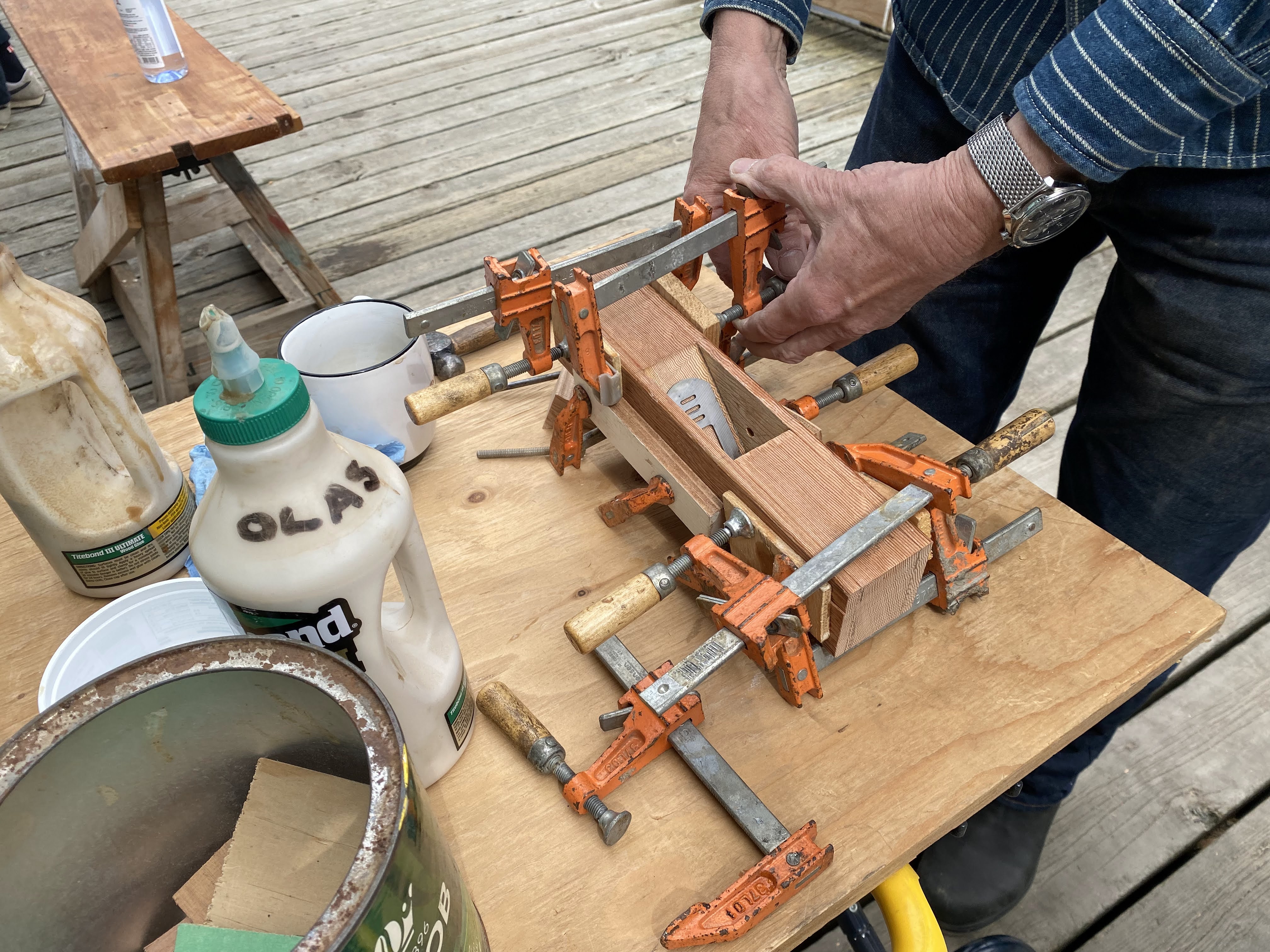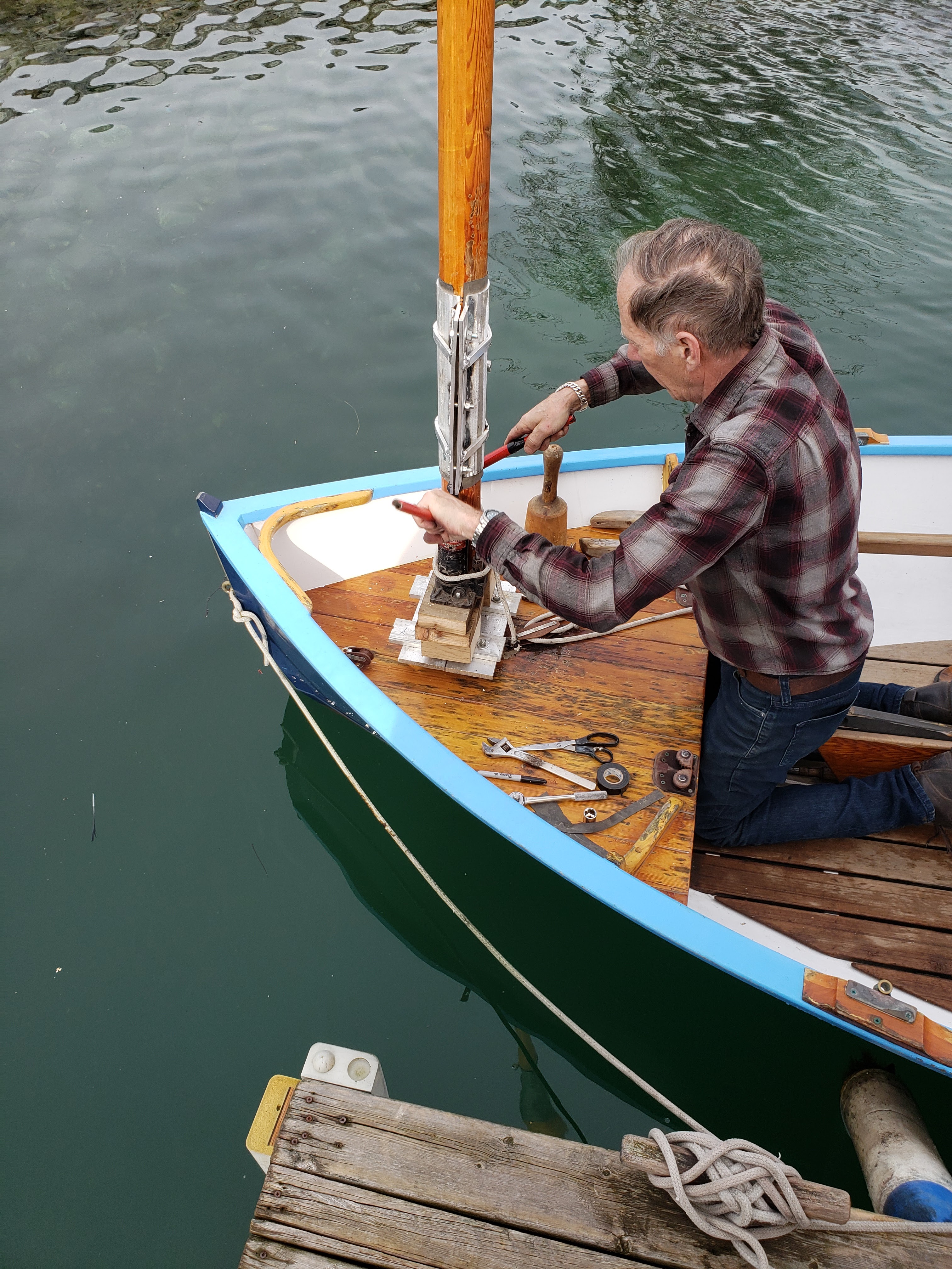 Extracting Ragna’s mast was quite a struggle!! When we built a new mast a few years ago, we didn’t leave quite enough expansion room, and now it was very tight in its sleeve. After a few attempts with ropes and levers, Arnt stepped in and fabricated a clamp and base, and used a couple of hydraulic jacks to pull it out. Still wasn’t exactly easy, but it did the job! We’ve sanded it down a little, and we’ll add a bit of a collar at the top of the sleeve to prevent water getting in again. The mast, spars, oars and rudder will remain varnished.