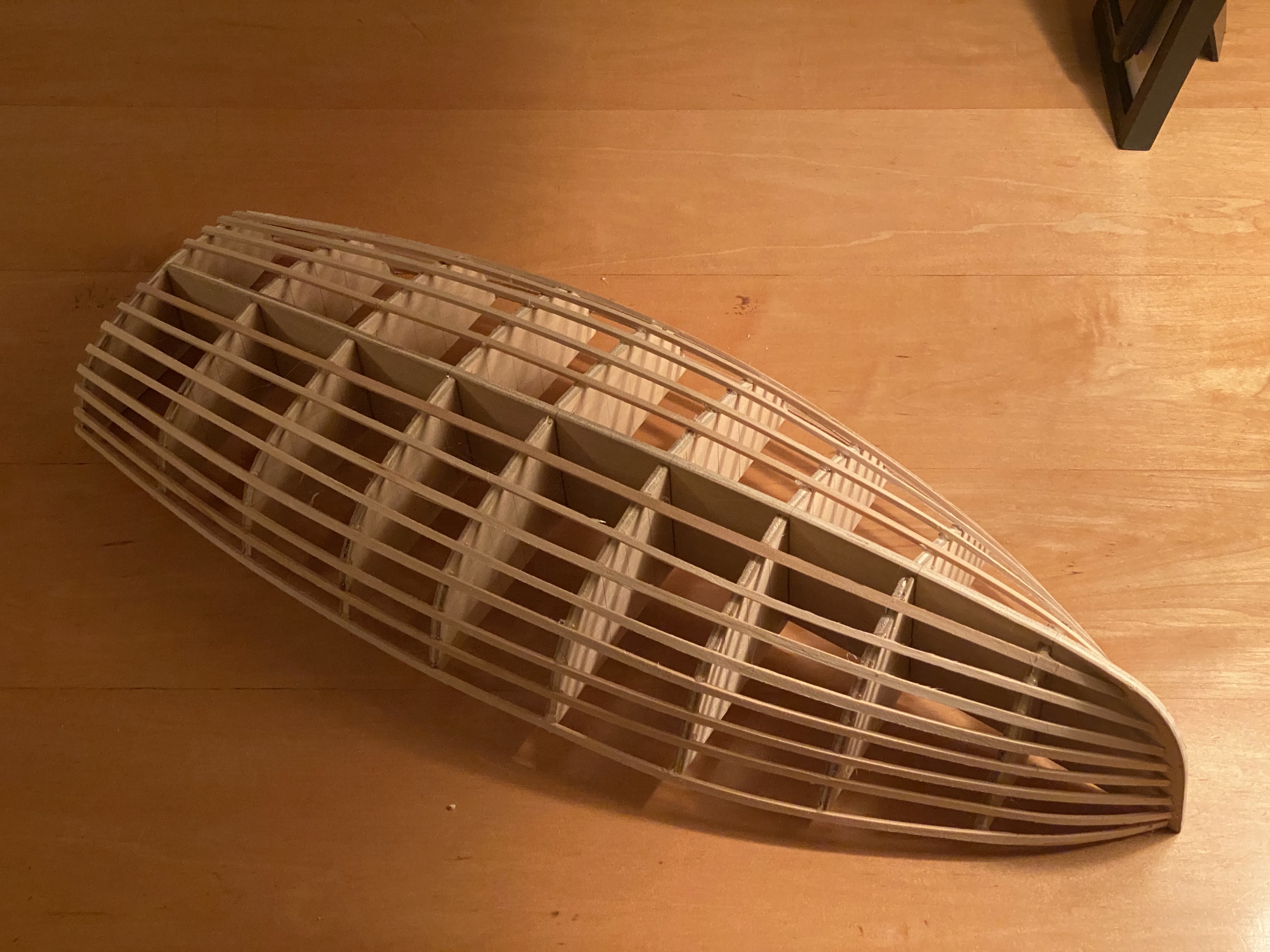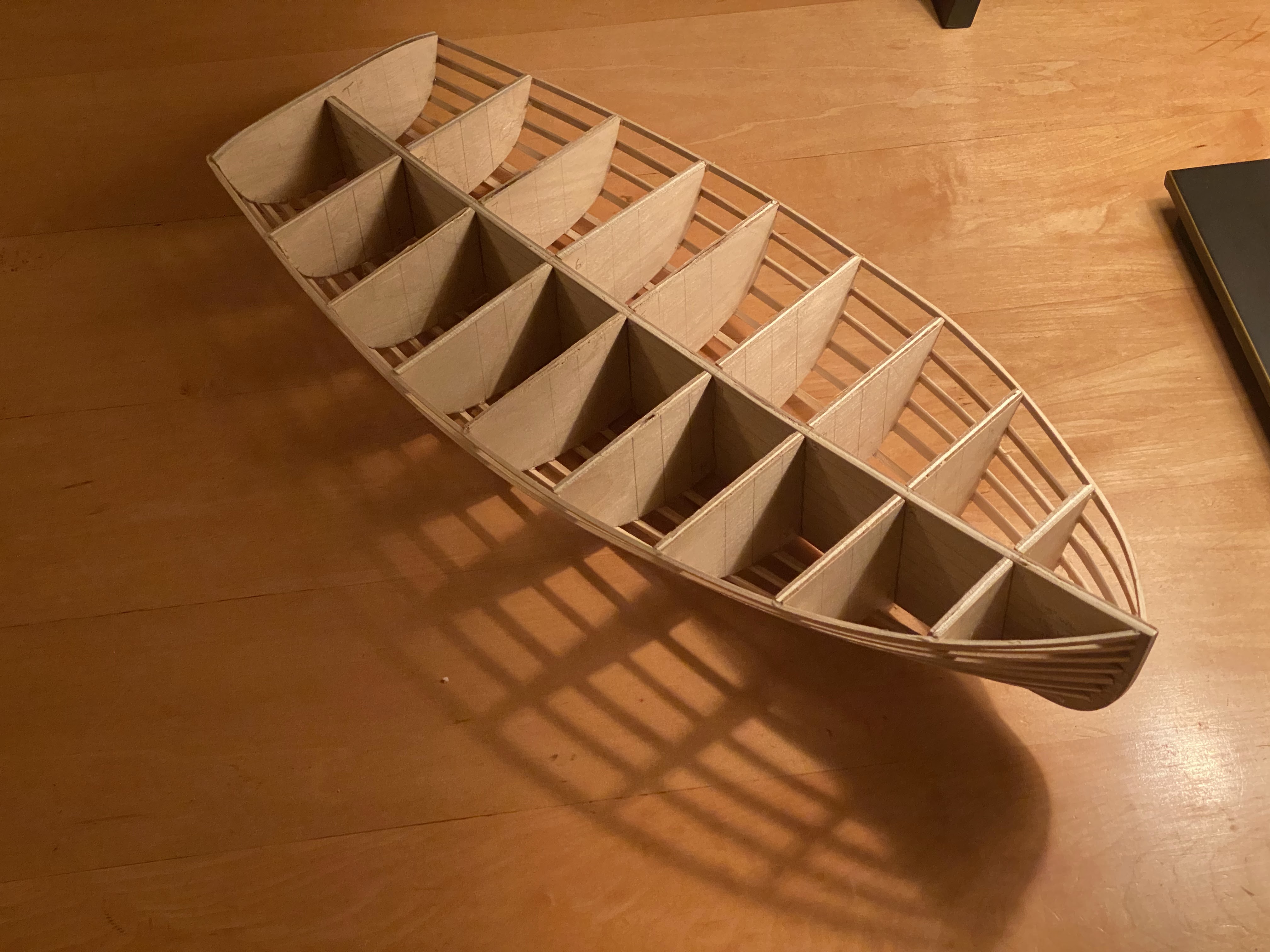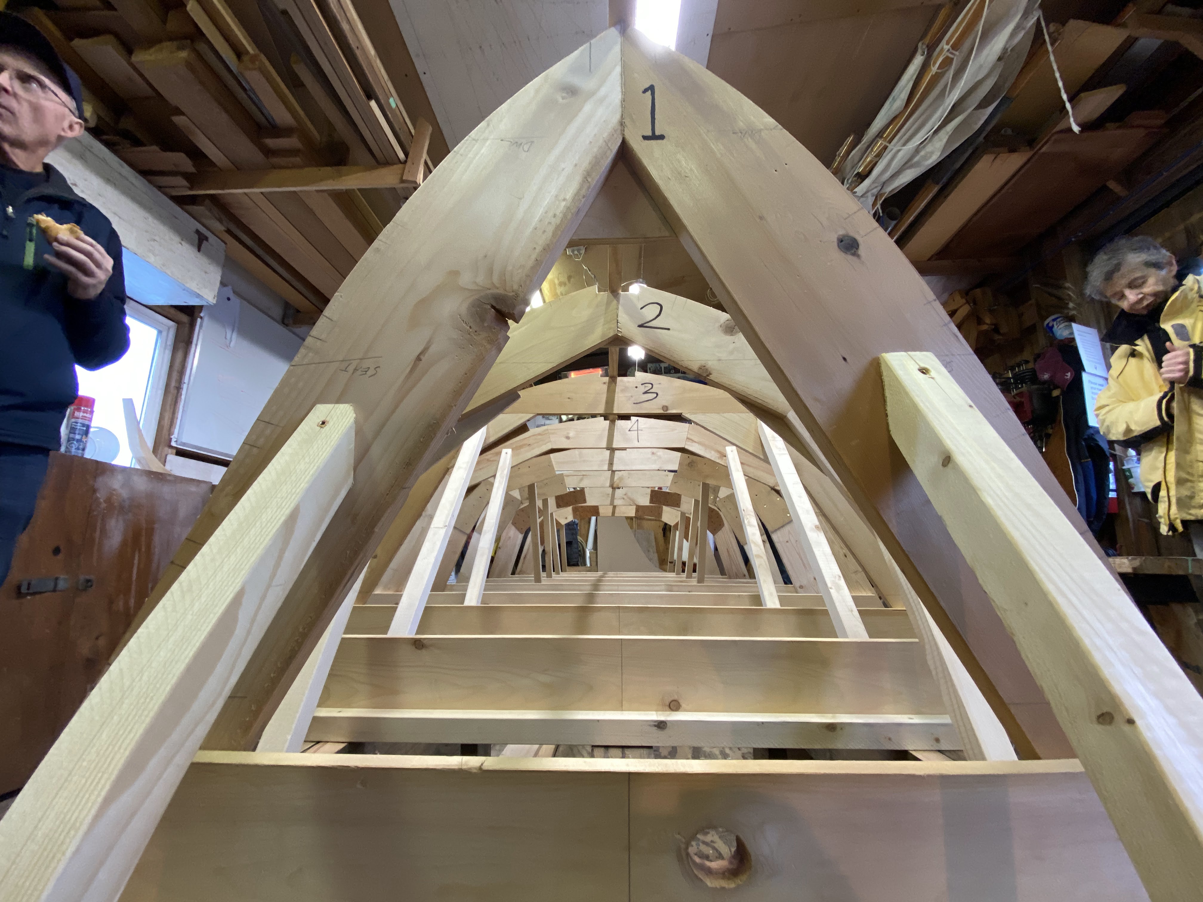 We’ve got a small model built, to get an idea of the shape, and to help describe the process to visitors. It’s also useful in planning the proposed half-decking, and seeing what that will do to the cockpit – we’ve realized that it would become more cramped than we’d like, so we’ll be reducing the amount of decking while maintaining appropriate flotation chambers.