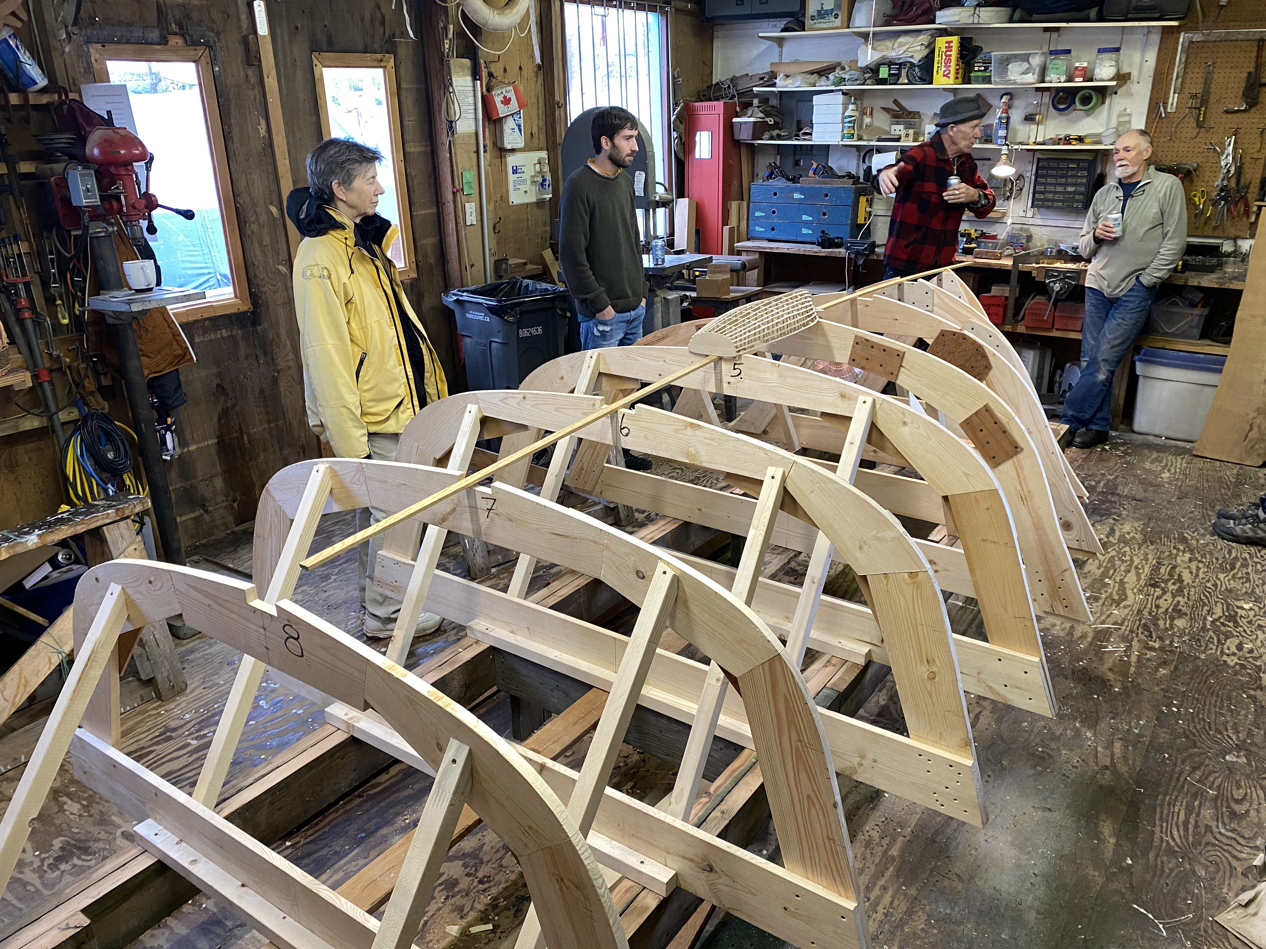 Over the last few weeks, we cut the patterns, and built the 8 molds for the Gannet. There were a few challenges to overcome, but in the end, the molds seem to be quite fair – laying a batten over the molds reveals some minor adjustments needed, but not bad.