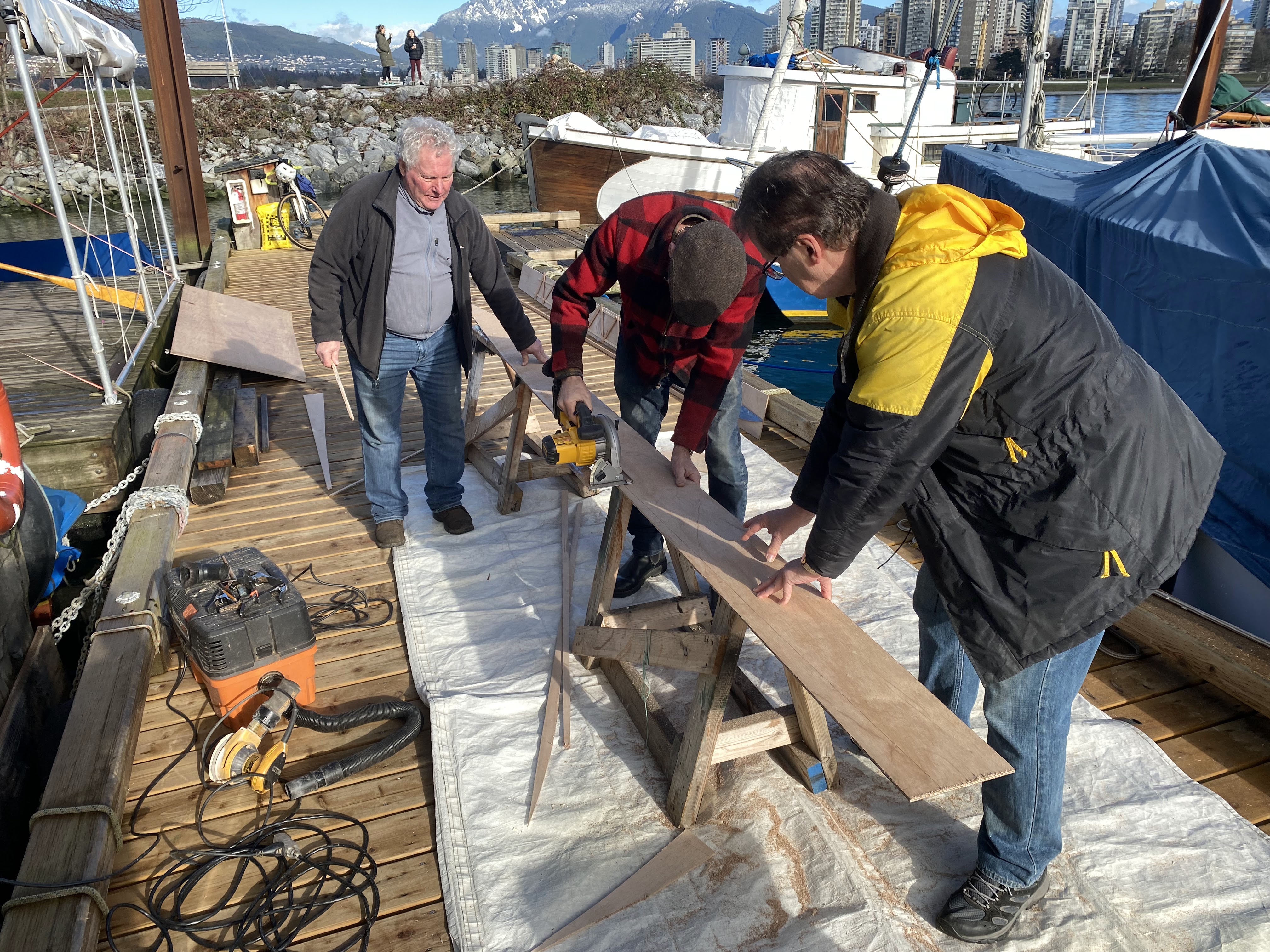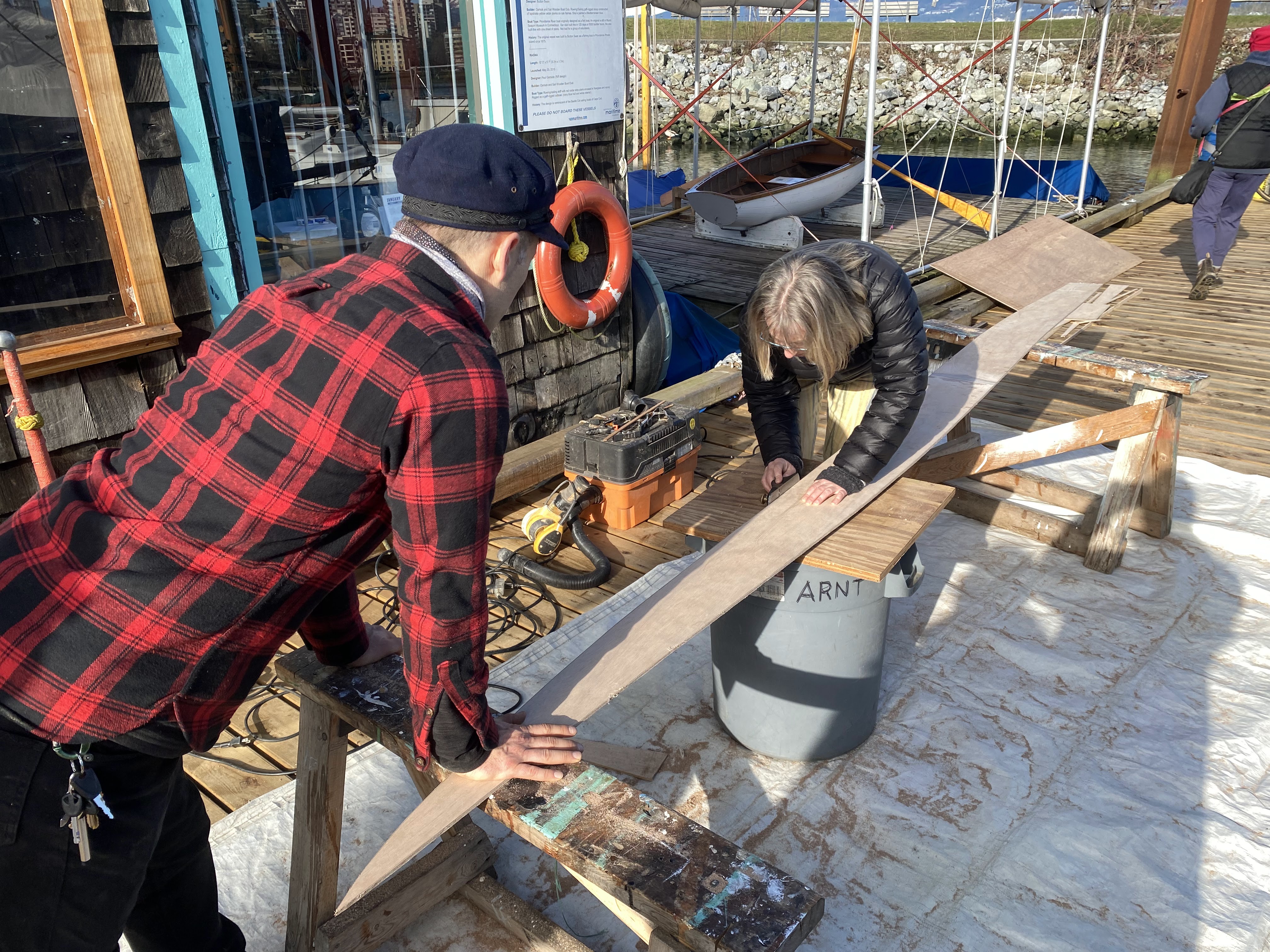 After cleaning the scarf joints (with a lot of elbow grease and mechanical assistance), we laid the pattern on the full length plank blanks, and traced out the two garboard planks, the first planks that fasten to the keelson.