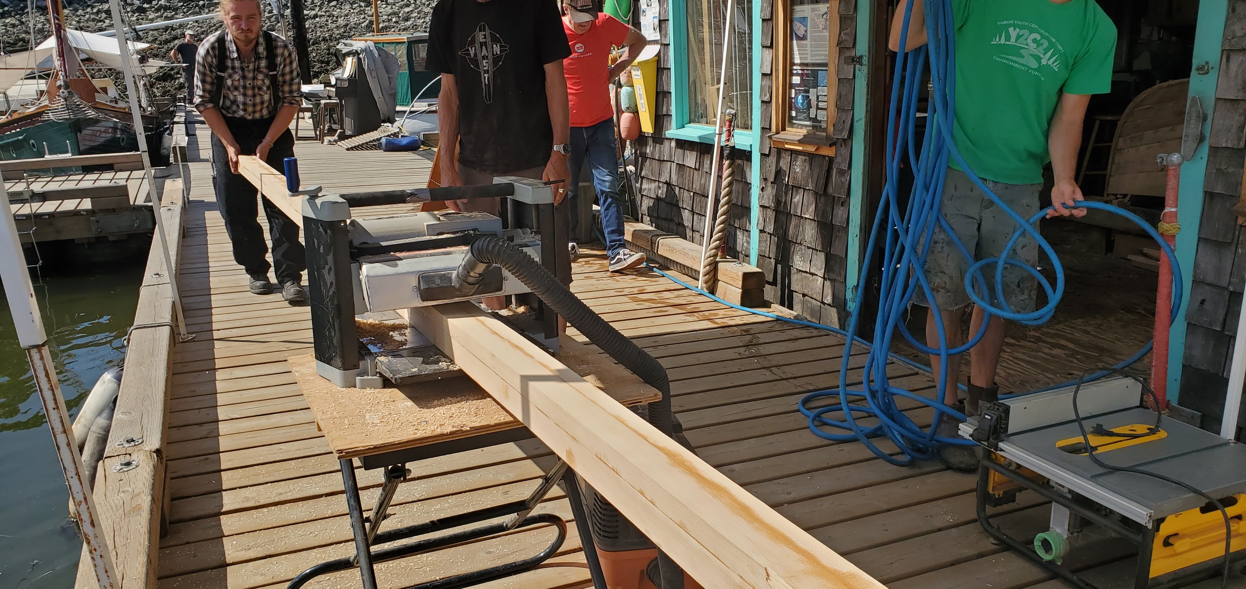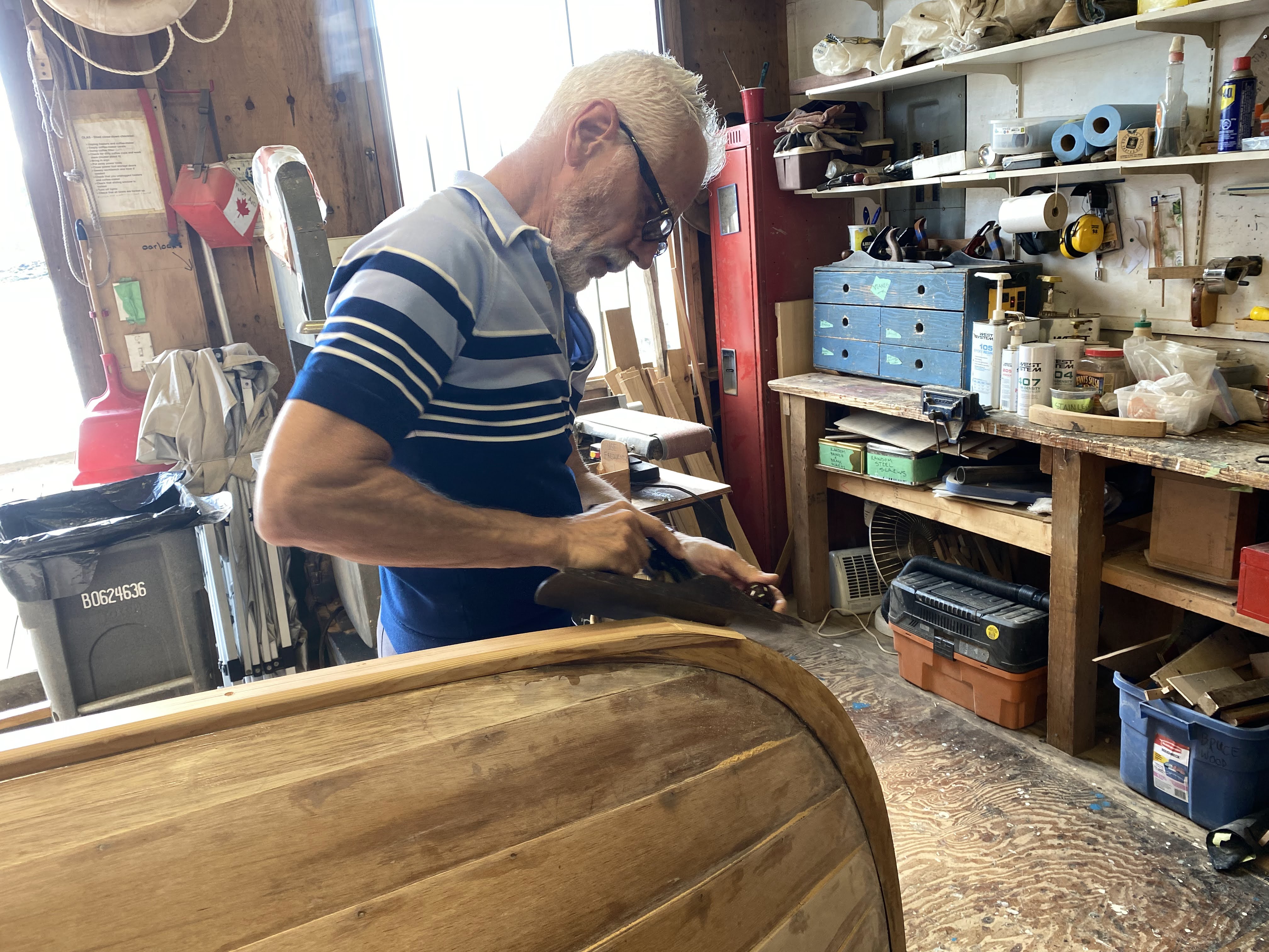 The mast has been glued up and shaped up to the octagonal shape – the last shaping to 16 and 32 sides, and then sanding is still to come. We’ve got some beautiful sitka spruce, and planing that is a dream! The boom is also glued up, and is awaiting its turn on the planing bench.