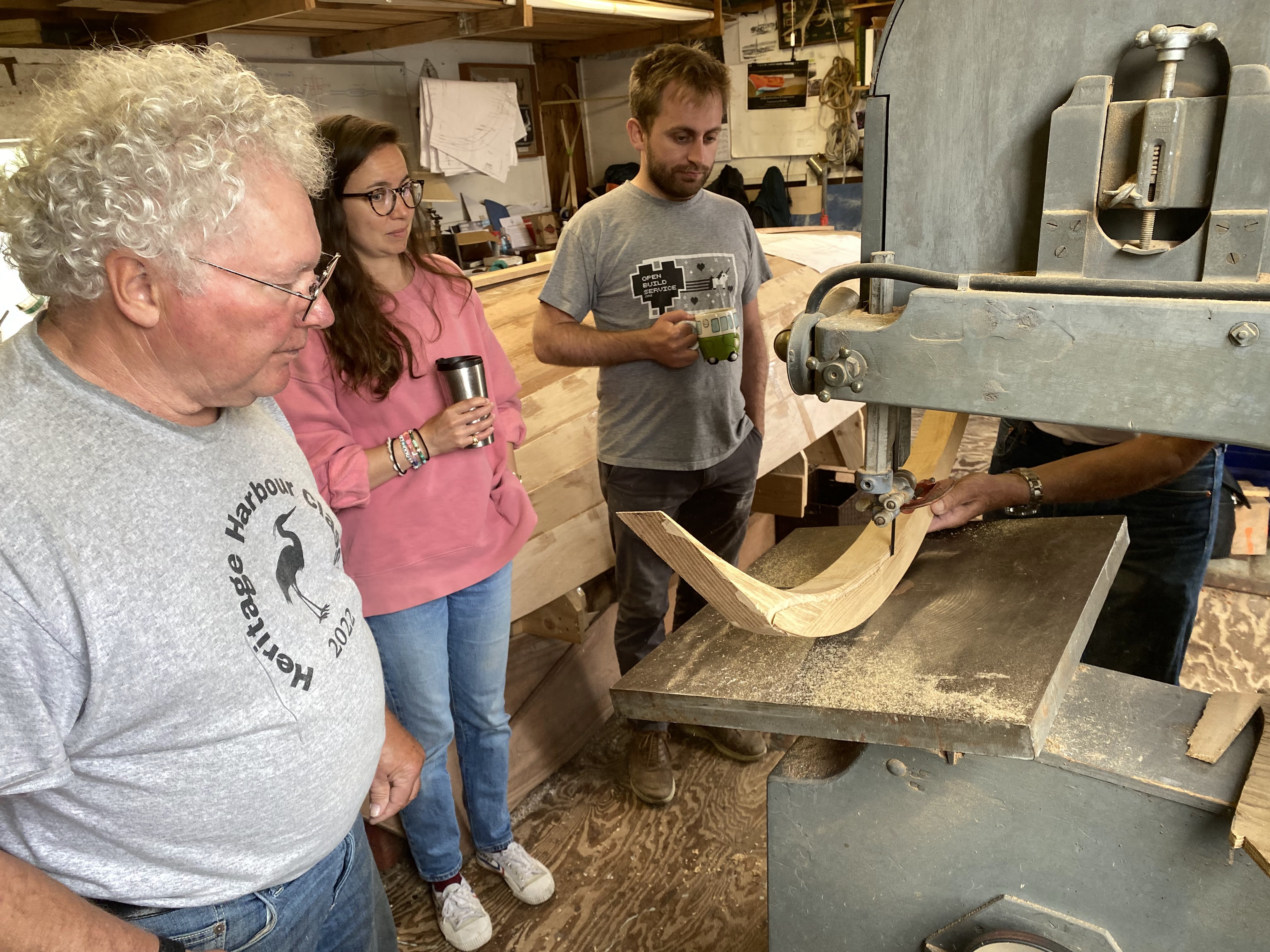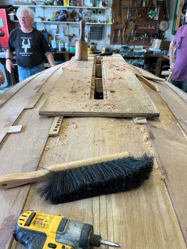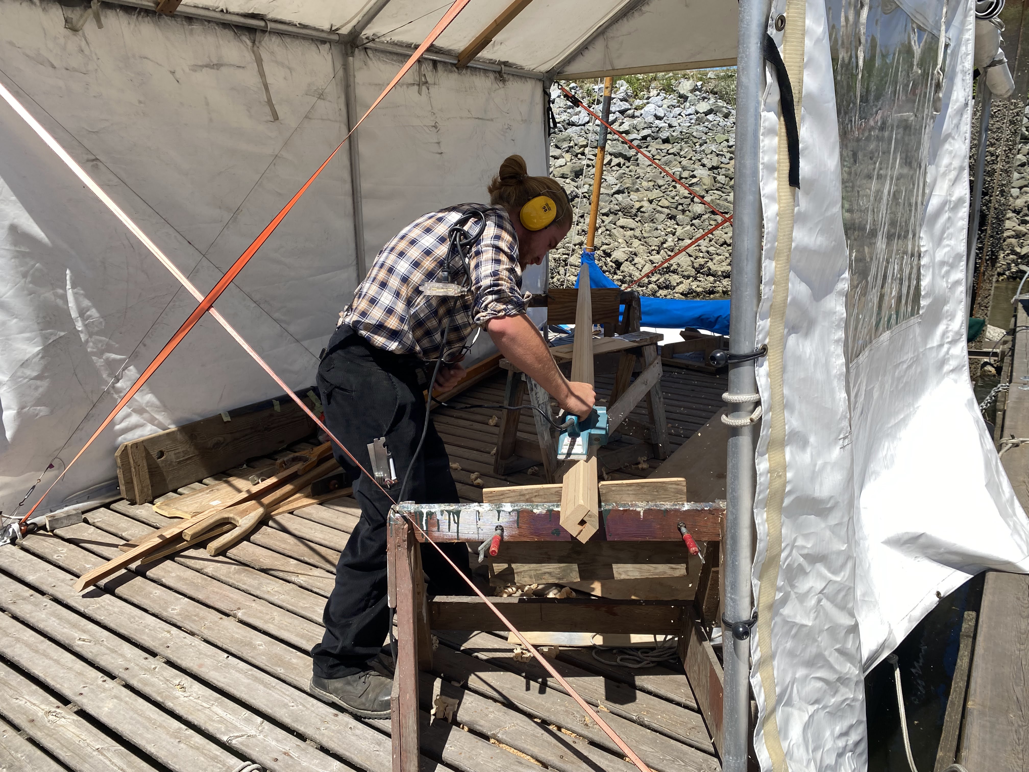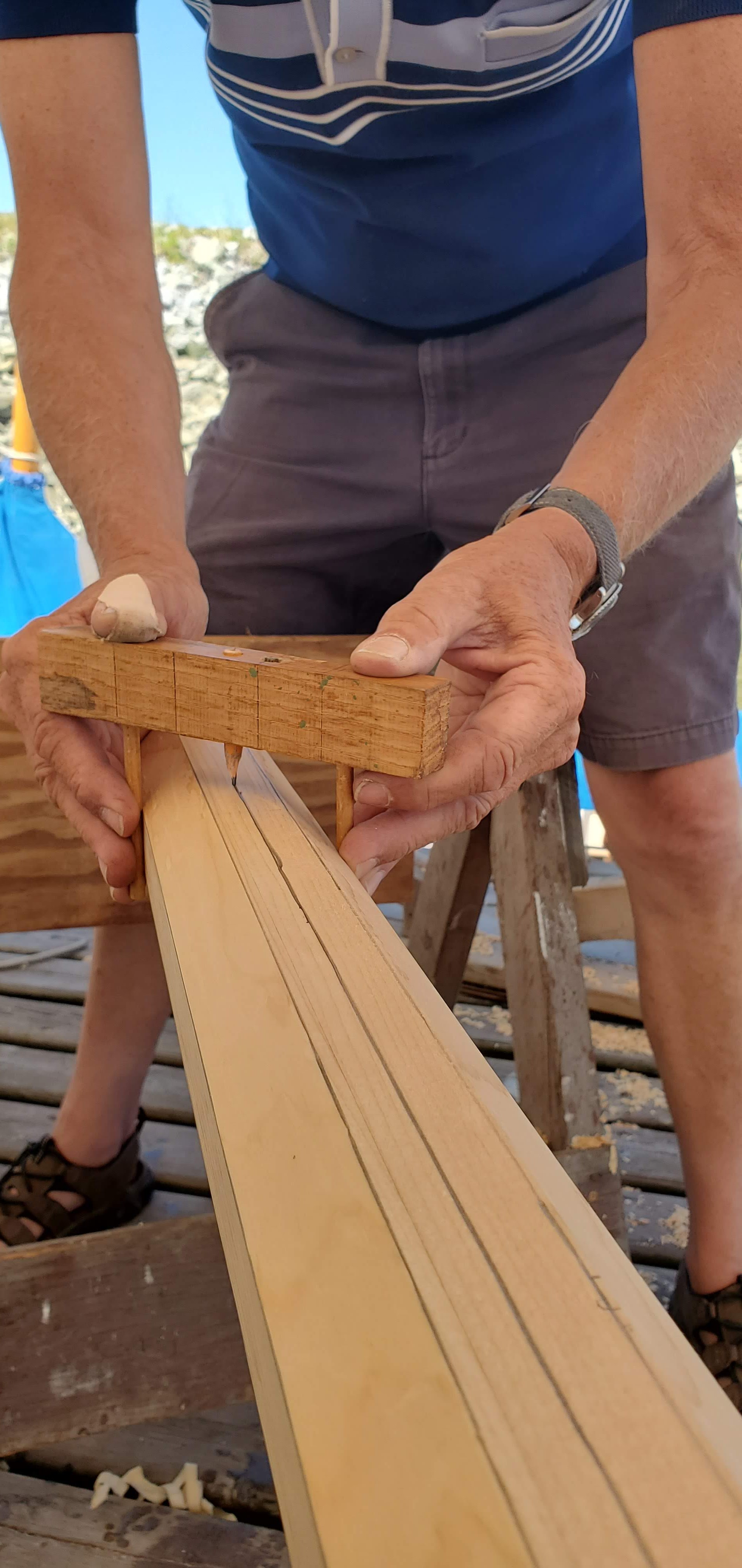 We had roughed out the black locust stem a while ago, and now that we finished the planking, we did the final fitting and shaping before gluing it in place. The top of the stem will be cut to shape after we flip the hull. Several inspectors carefully observed the cutting of the bevel. Thankfully they approved the work, and carried on with the shaping.