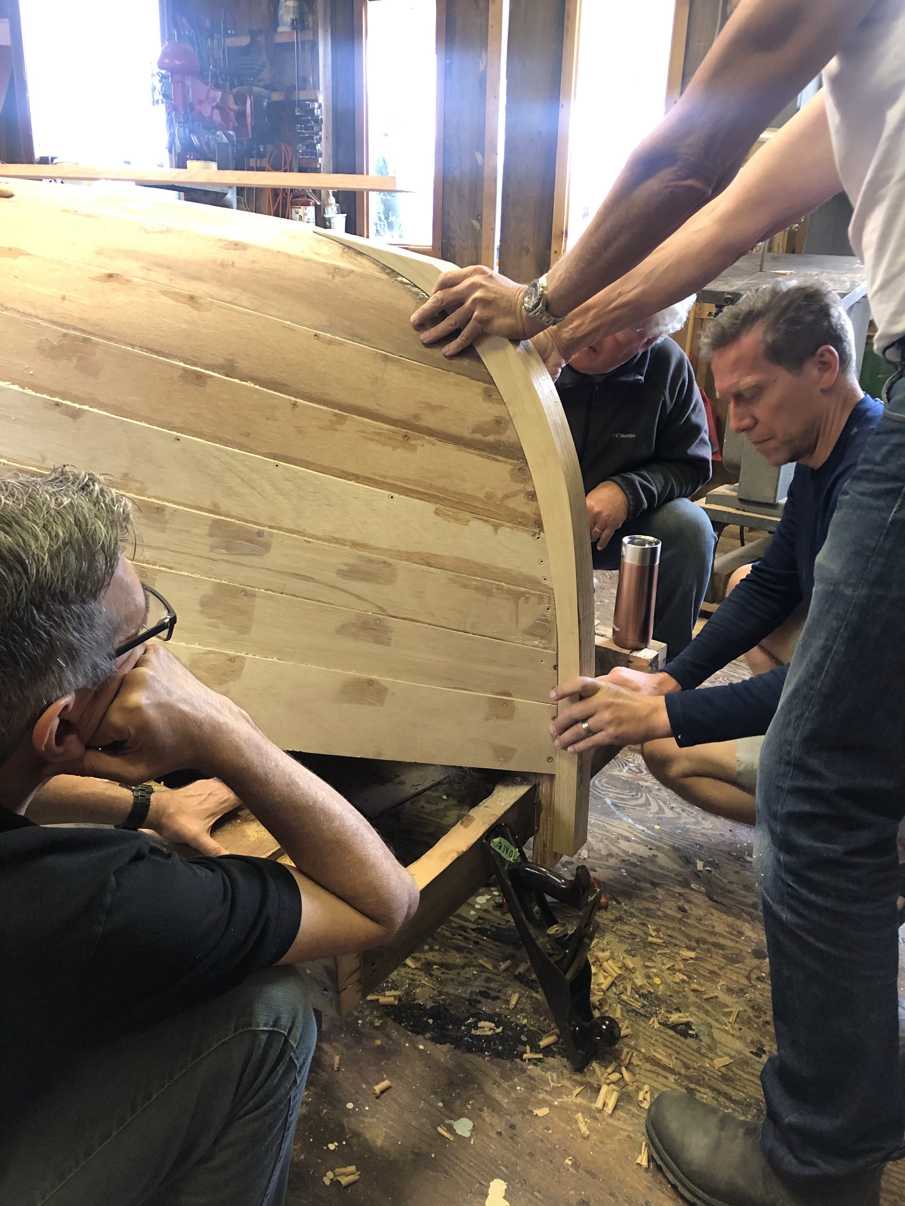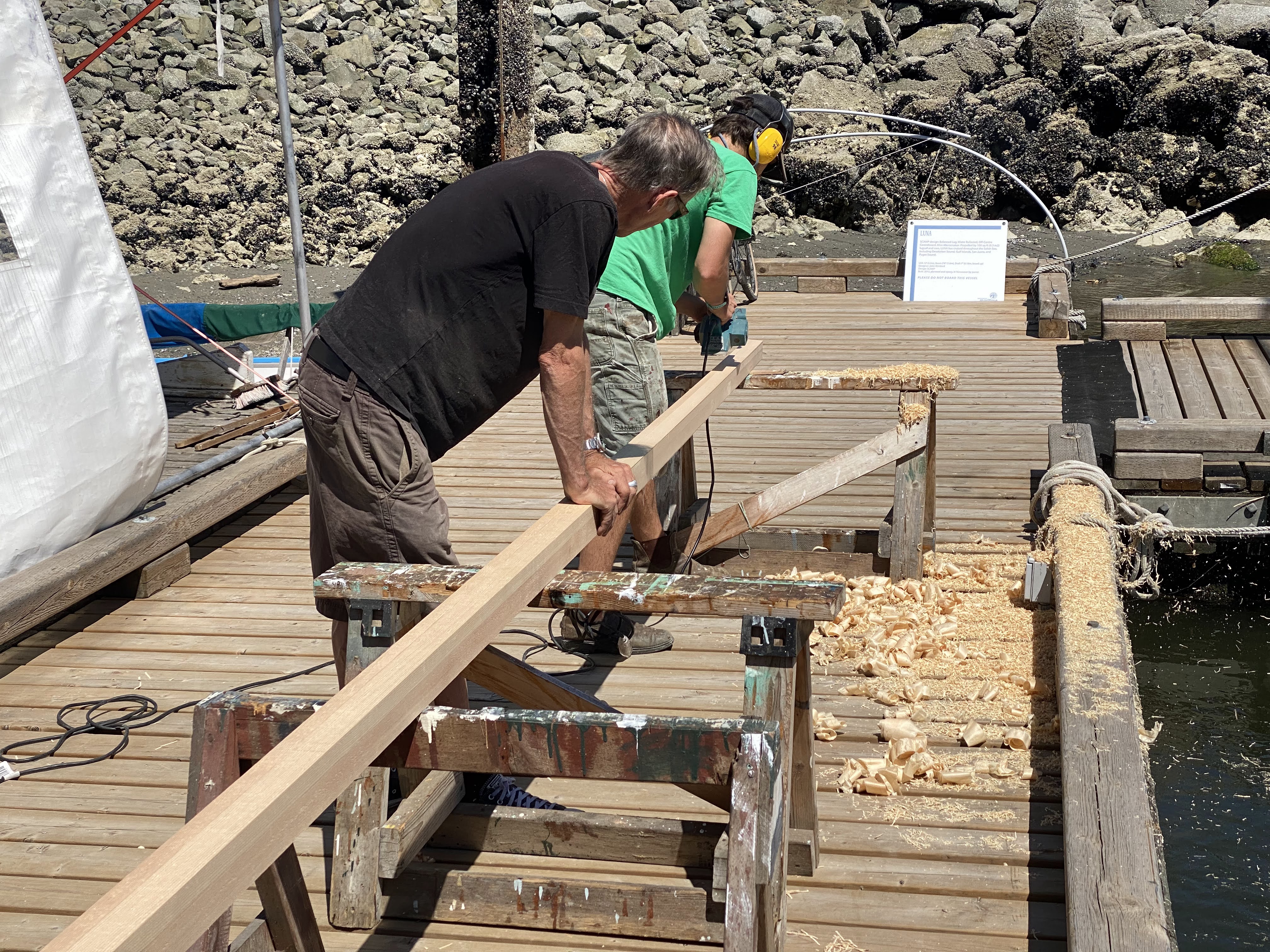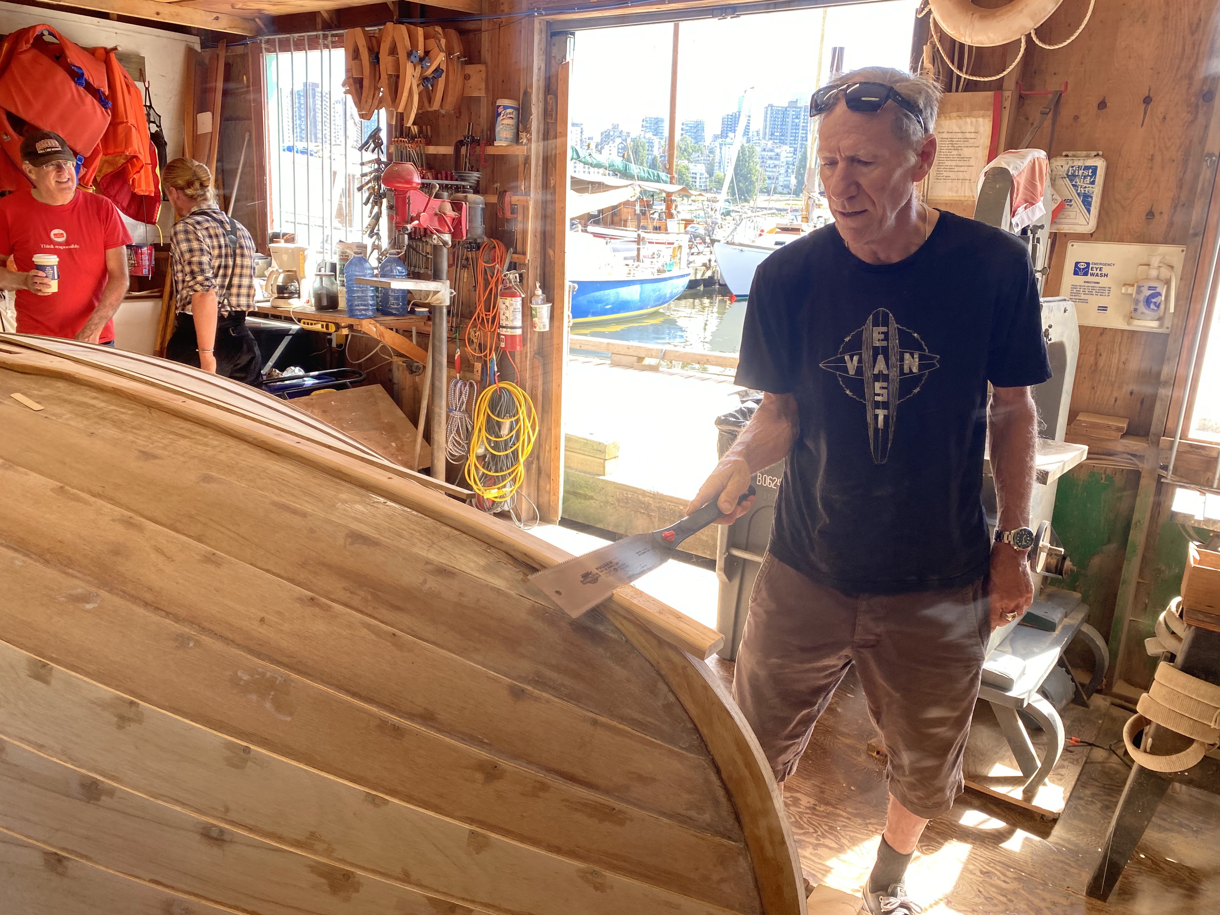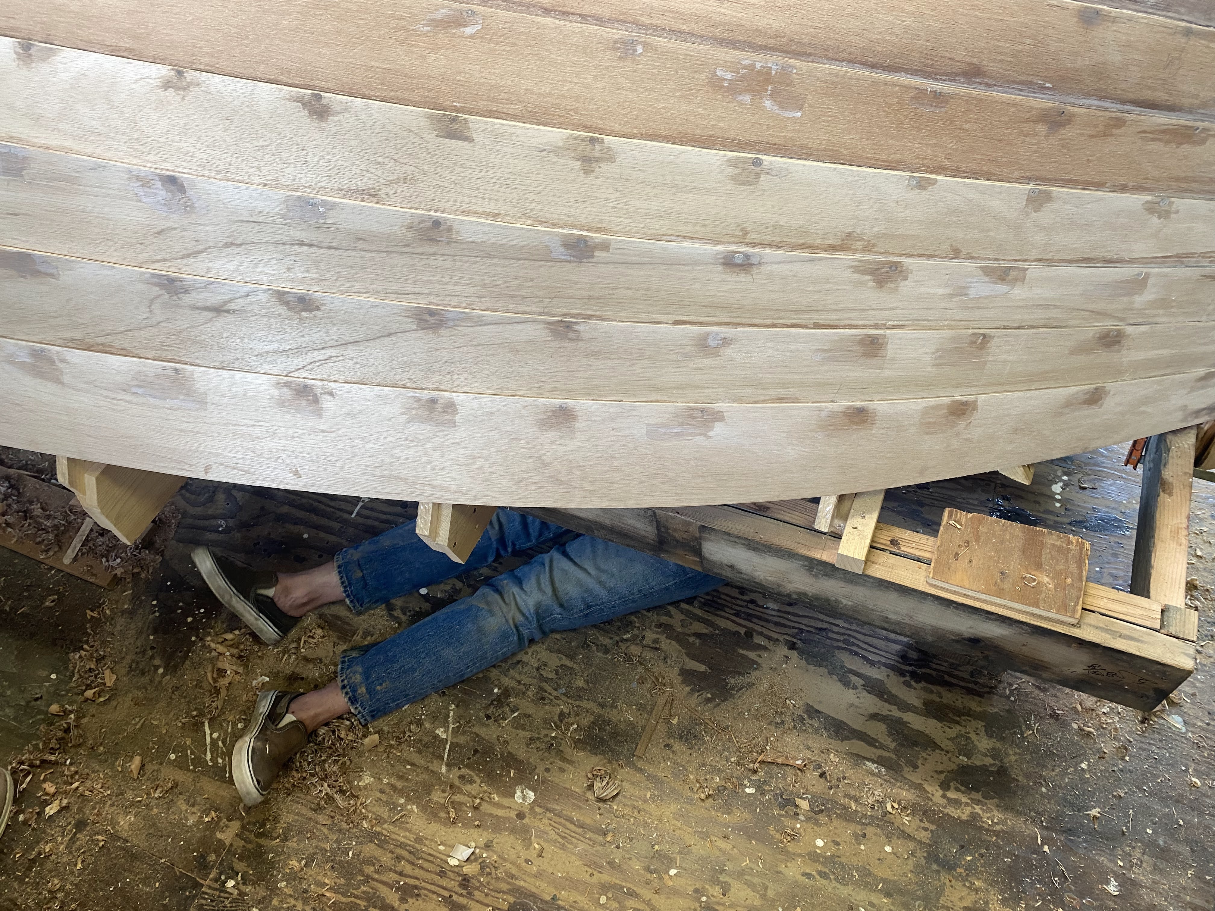 We had roughed out the black locust stem a while ago, and now that we finished the planking, we did the final fitting and shaping before gluing it in place. The top of the stem will be cut to shape after we flip the hull. Several inspectors carefully observed the cutting of the bevel. Thankfully they approved the work, and carried on with the shaping.