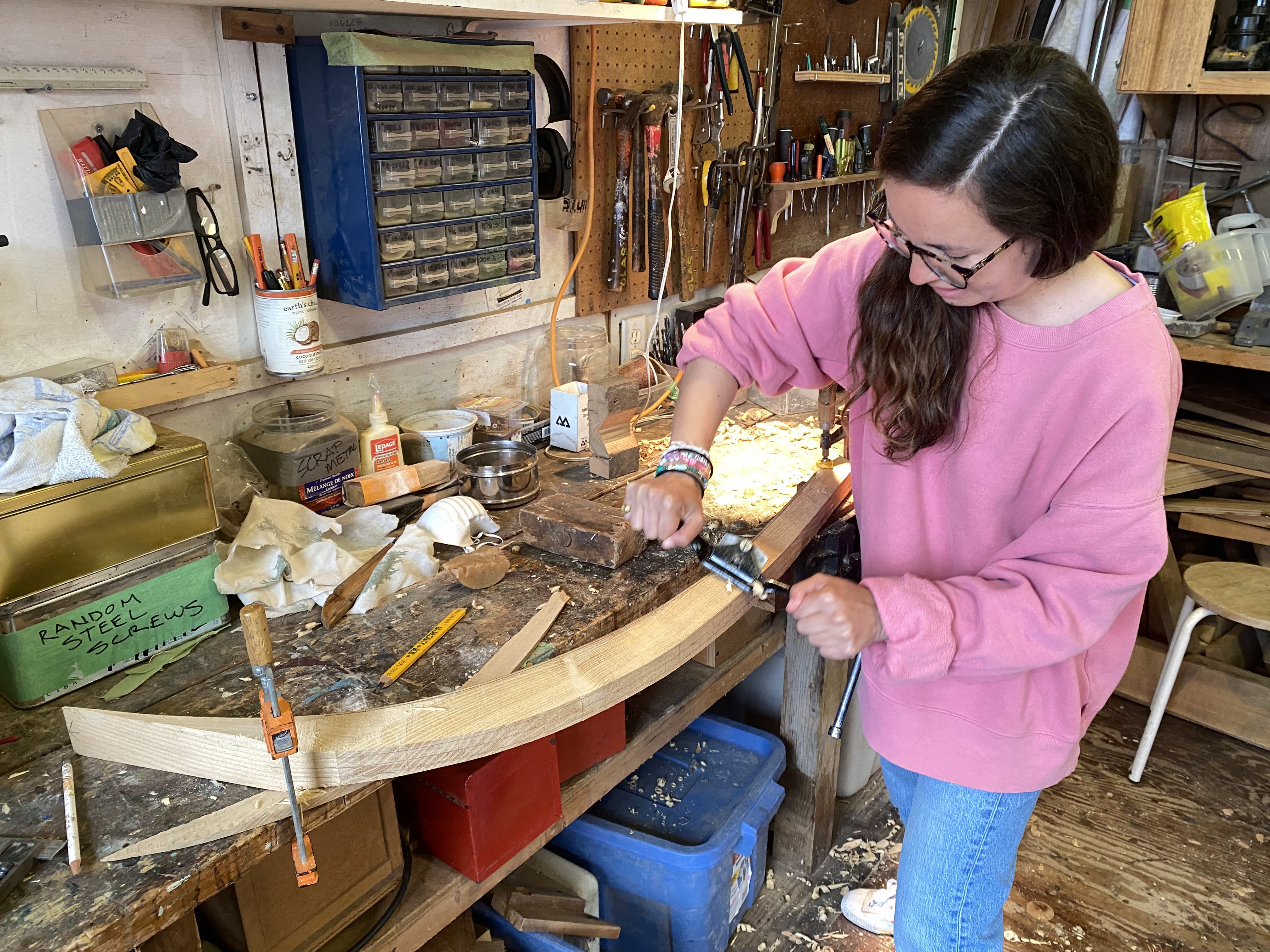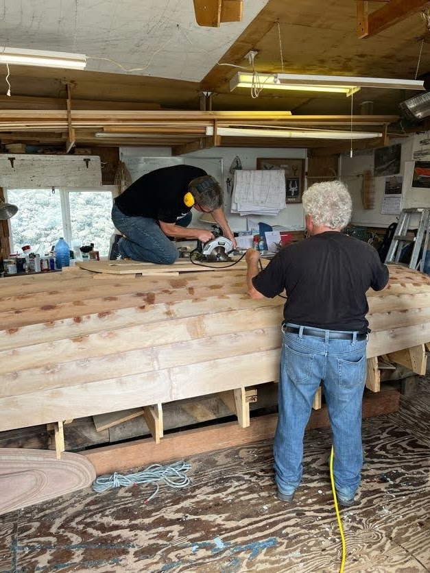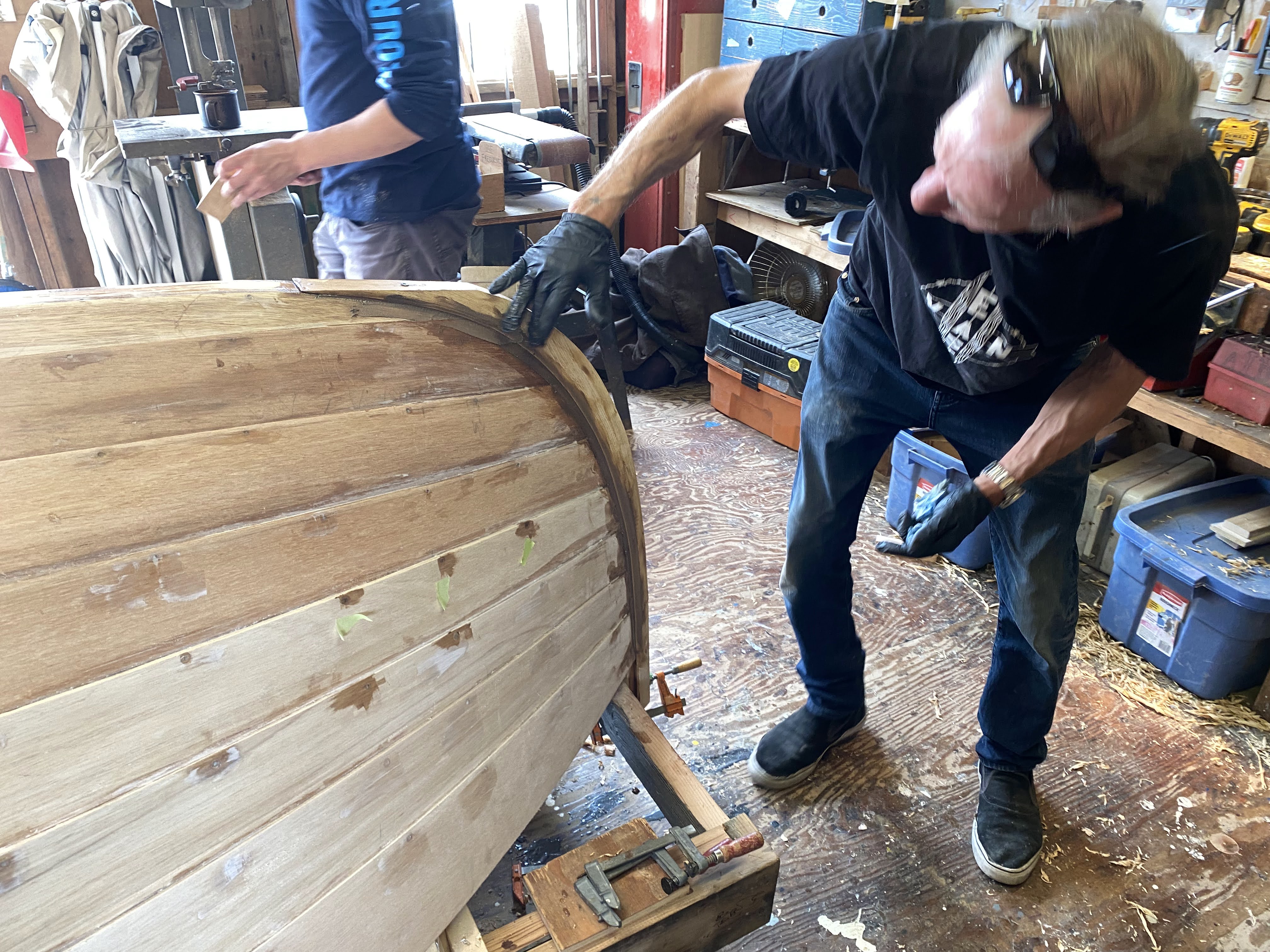 After the glue dried, the keel was trimmed and faired at the stem and transom. The centerboard slot gave a nice light to the interior of the hull, helping Pam do some cleanup inside!