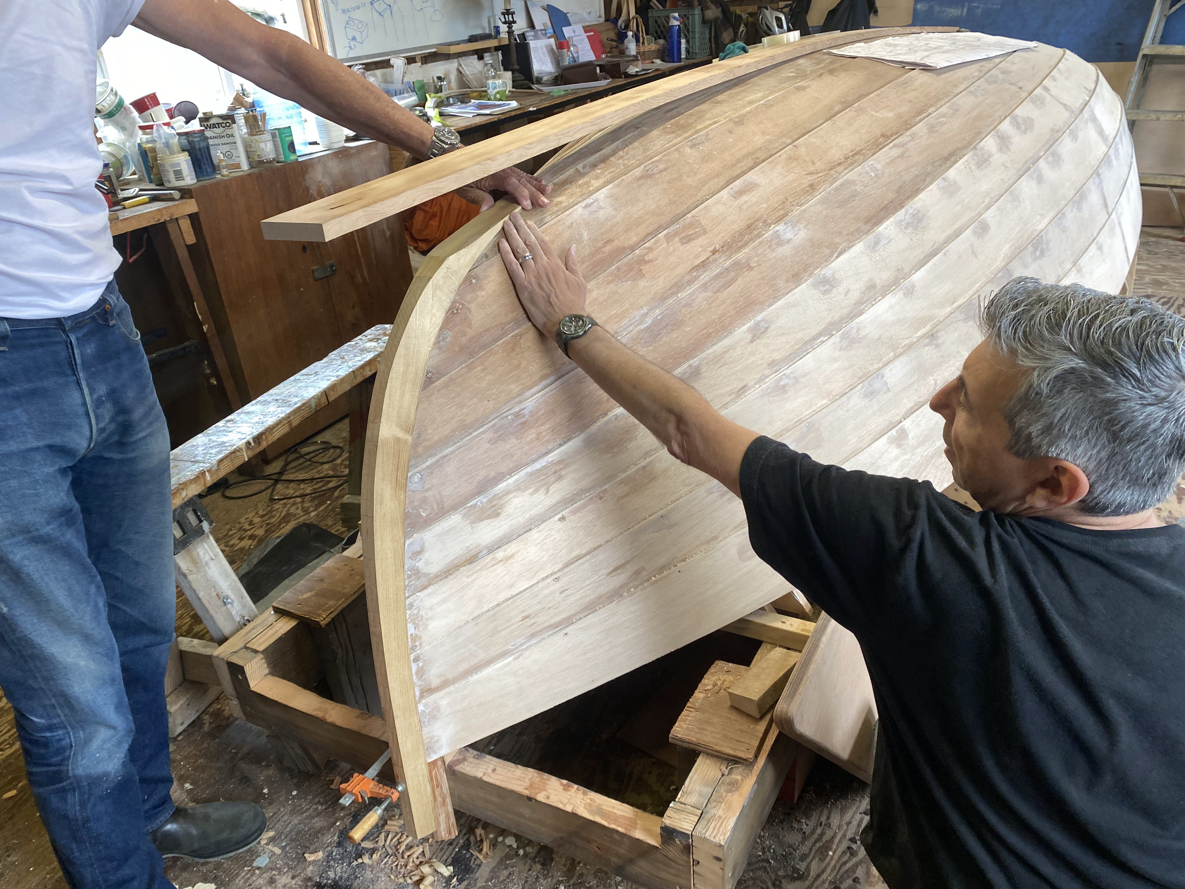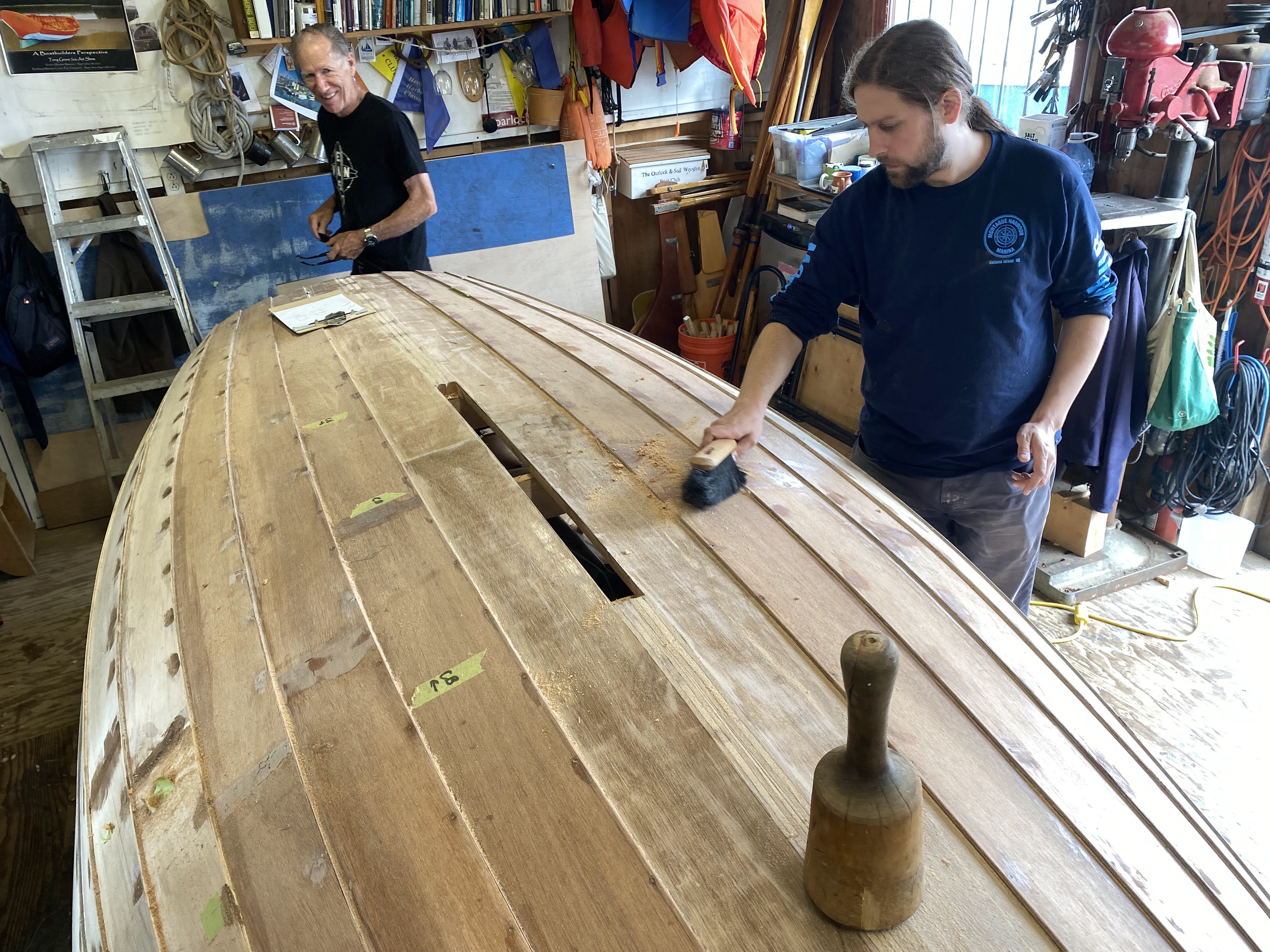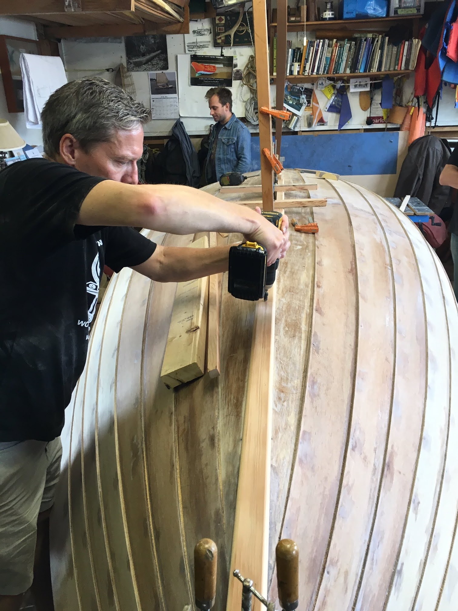 Our Gannet hull is nearly ready to flip over, and start work on the interior – just some sealing and filleting to do on the exterior. Hope you can come take a look in person!