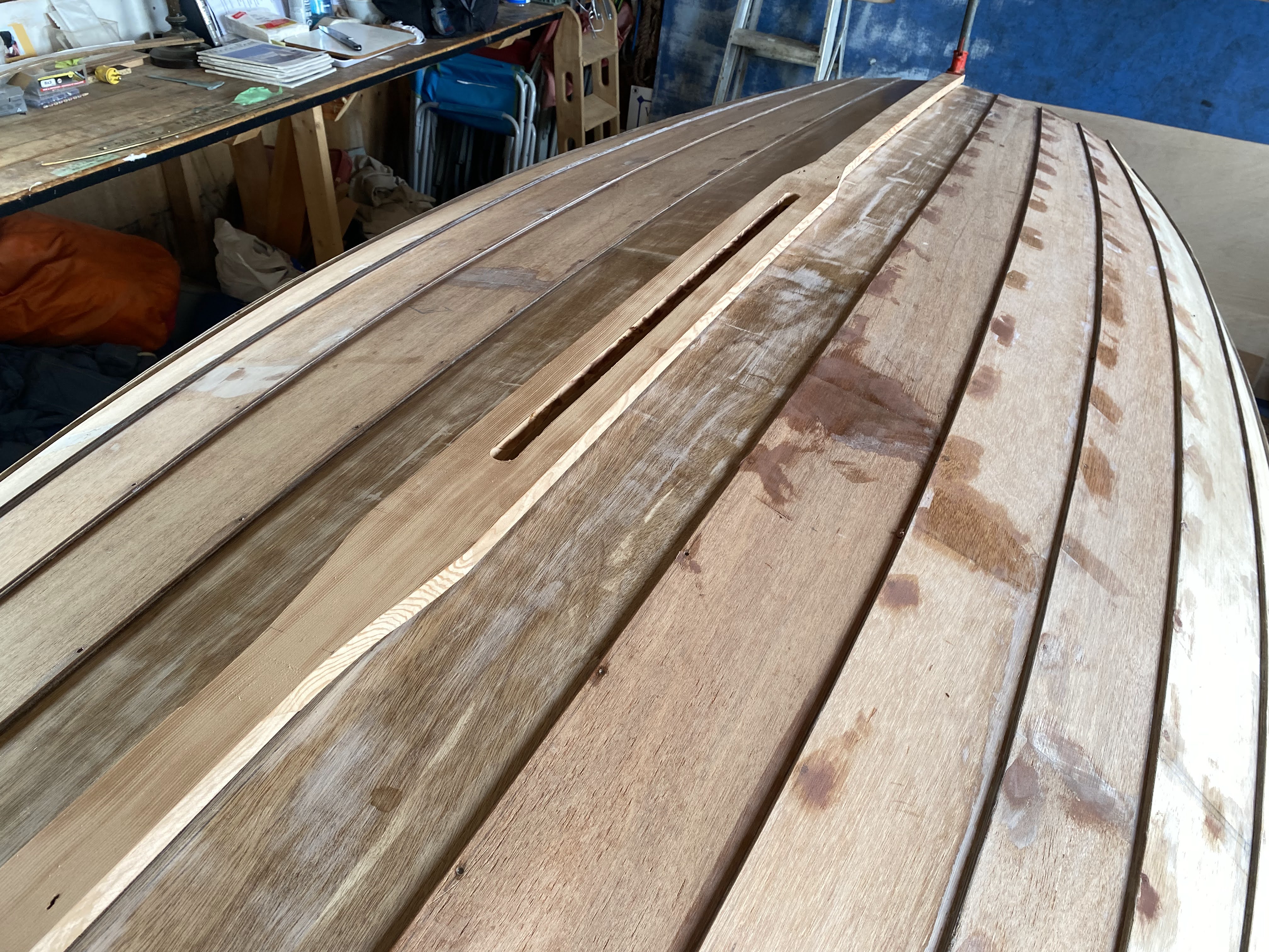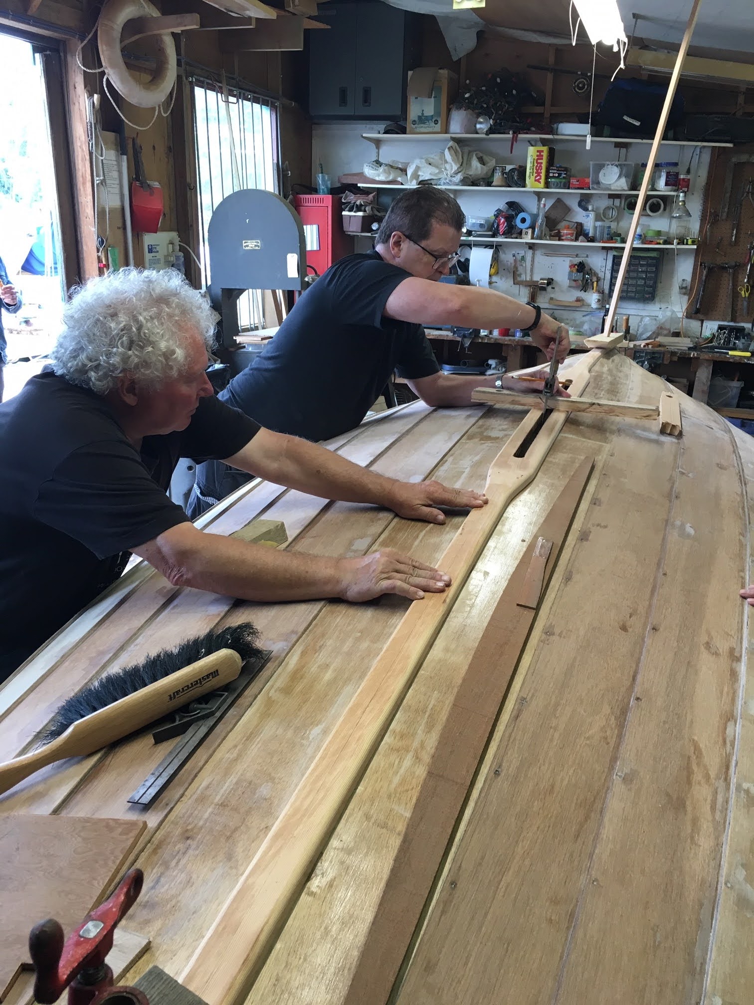 The keel was cut and shaped in one full-length piece, using gorgeous old fir from a reclaimed church pew (as was the keelson). We cut the slot slightly undersized, and will trim it to proper size later, once we’ve got the centerboard trunk installed. Gluing it to the hull included screws and sticks jammed between the ceiling and keel (there’s a name for them, but it escapes me…).