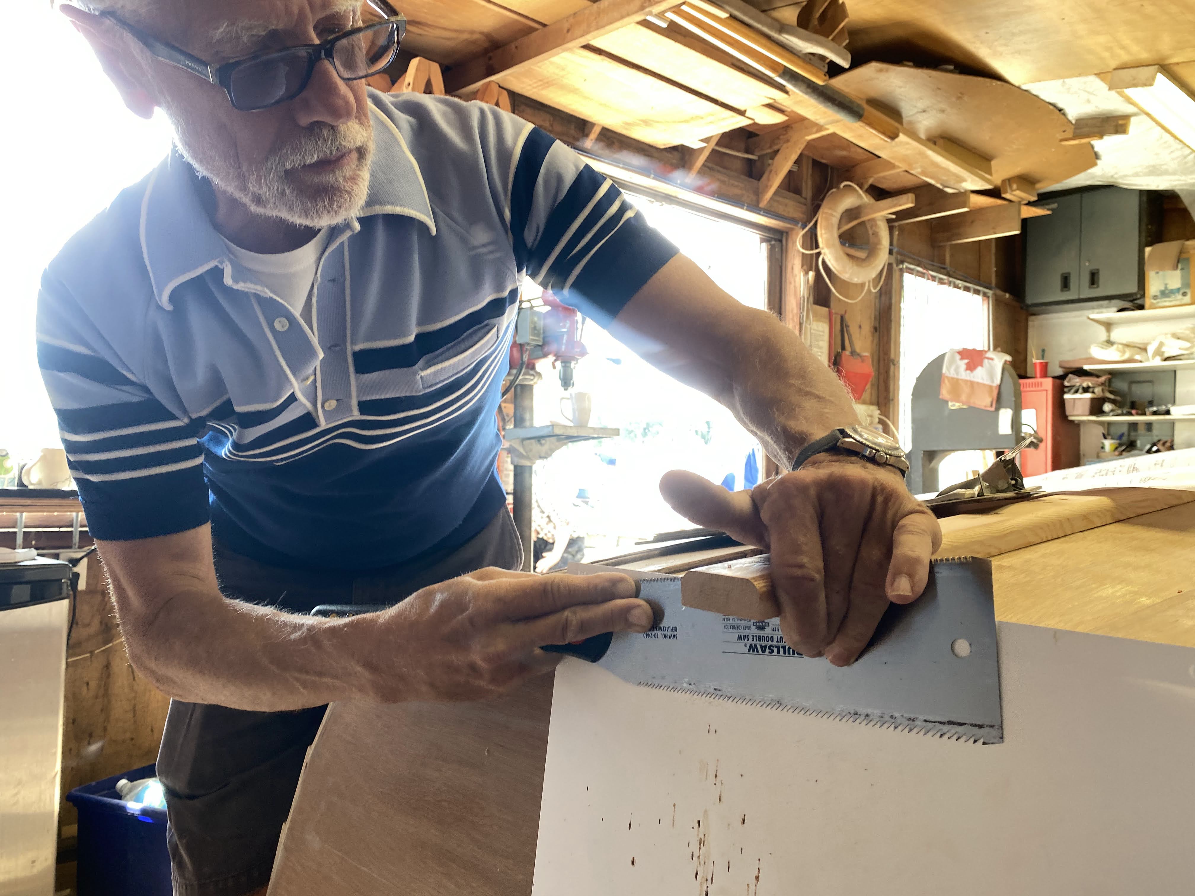 The cutting of the centerboard slot was a bit of a milestone – we built a nice (presumably) watertight hull, then cut a hole in it. We hope the multiple measurements were accurate enough, and when we build the centerboard trunk, the water will stay out, and the boat will float! The hole in the hull got cut using a platform/template for the circular saw, and it worked out very well – it was nice and stable.