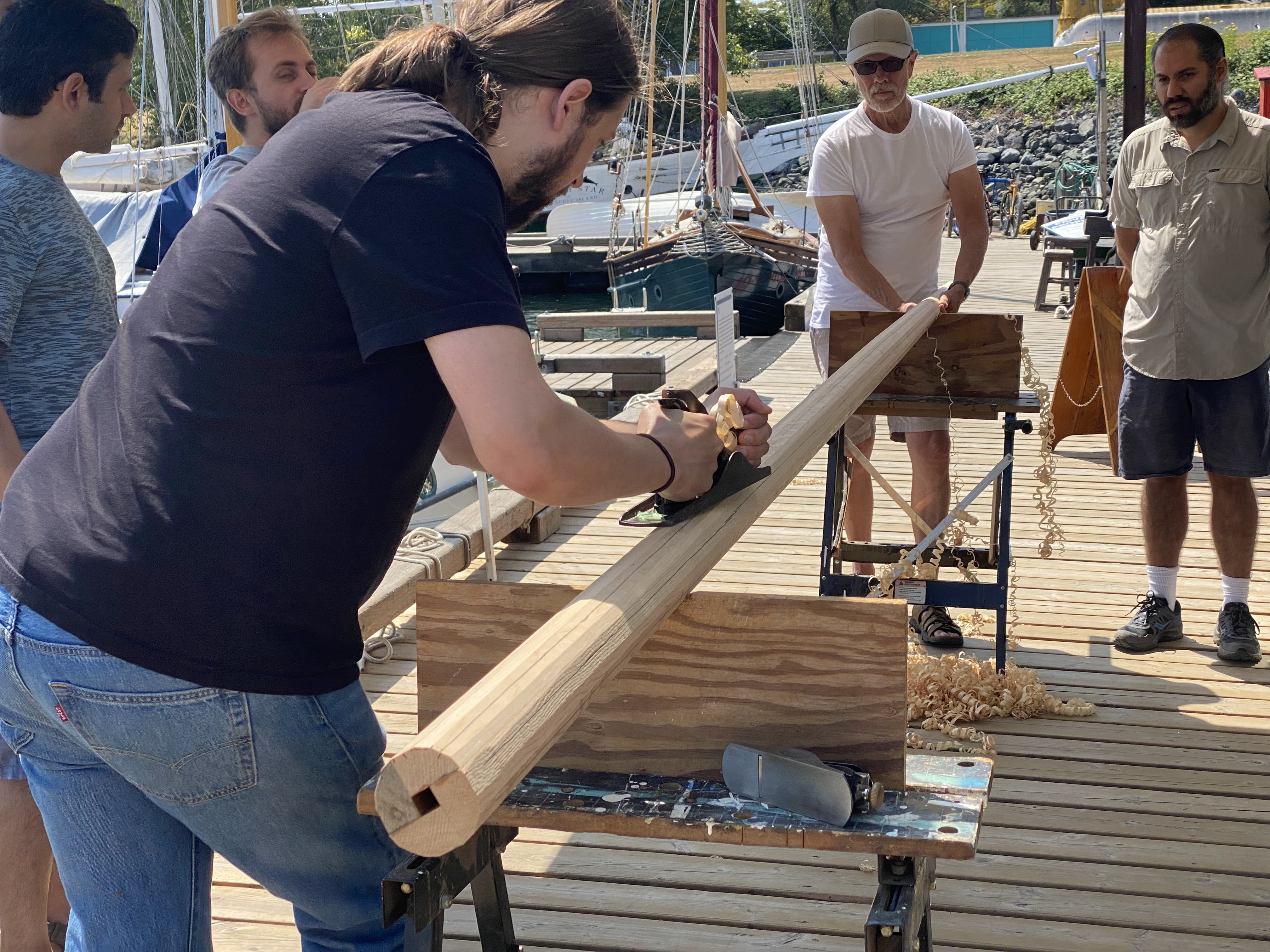 The mast has been rounded and smoothed, and looking good! We need to figure out the arrangement at the head of the mast for the halyards and shrouds before we start applying varnish.