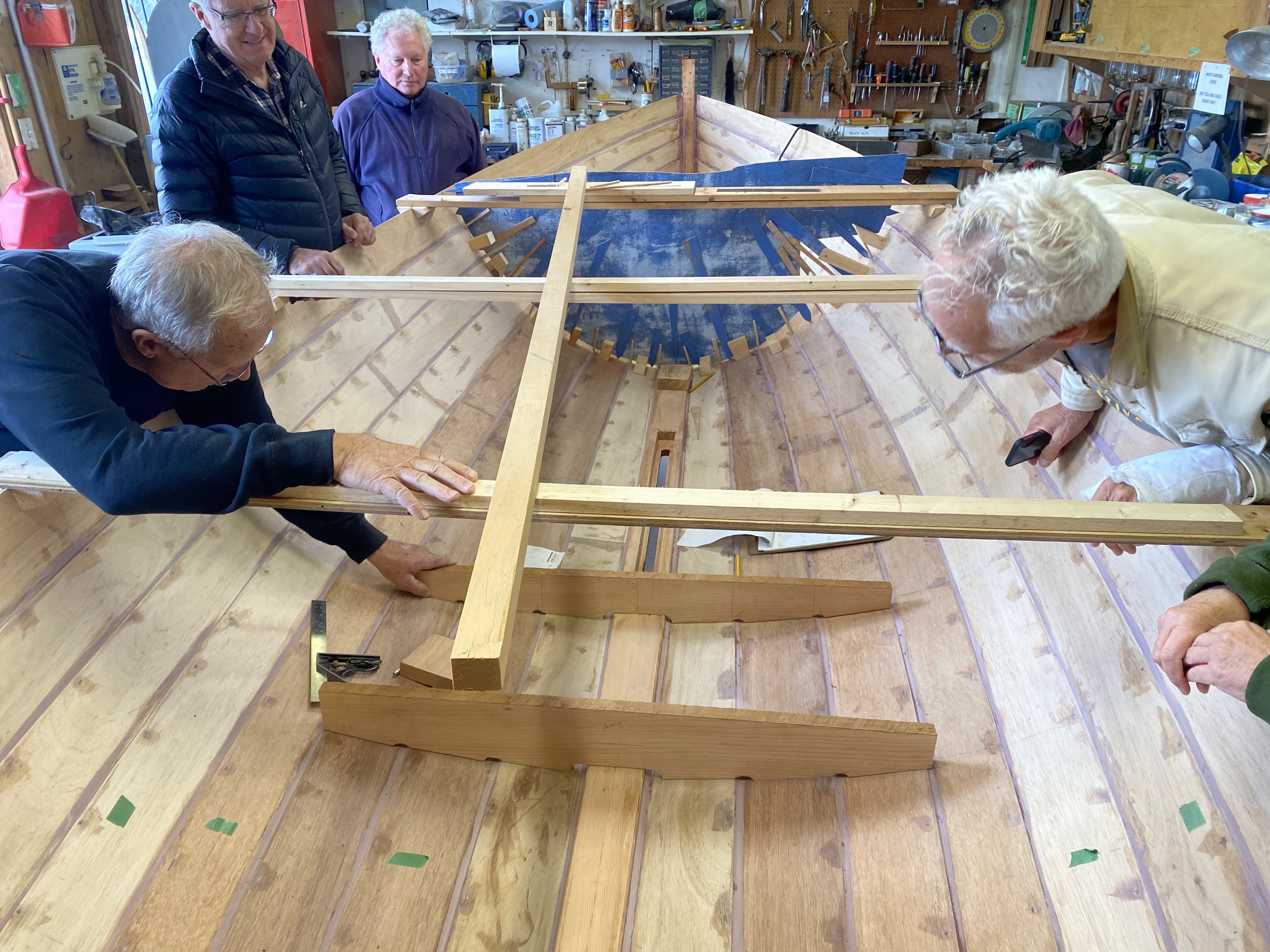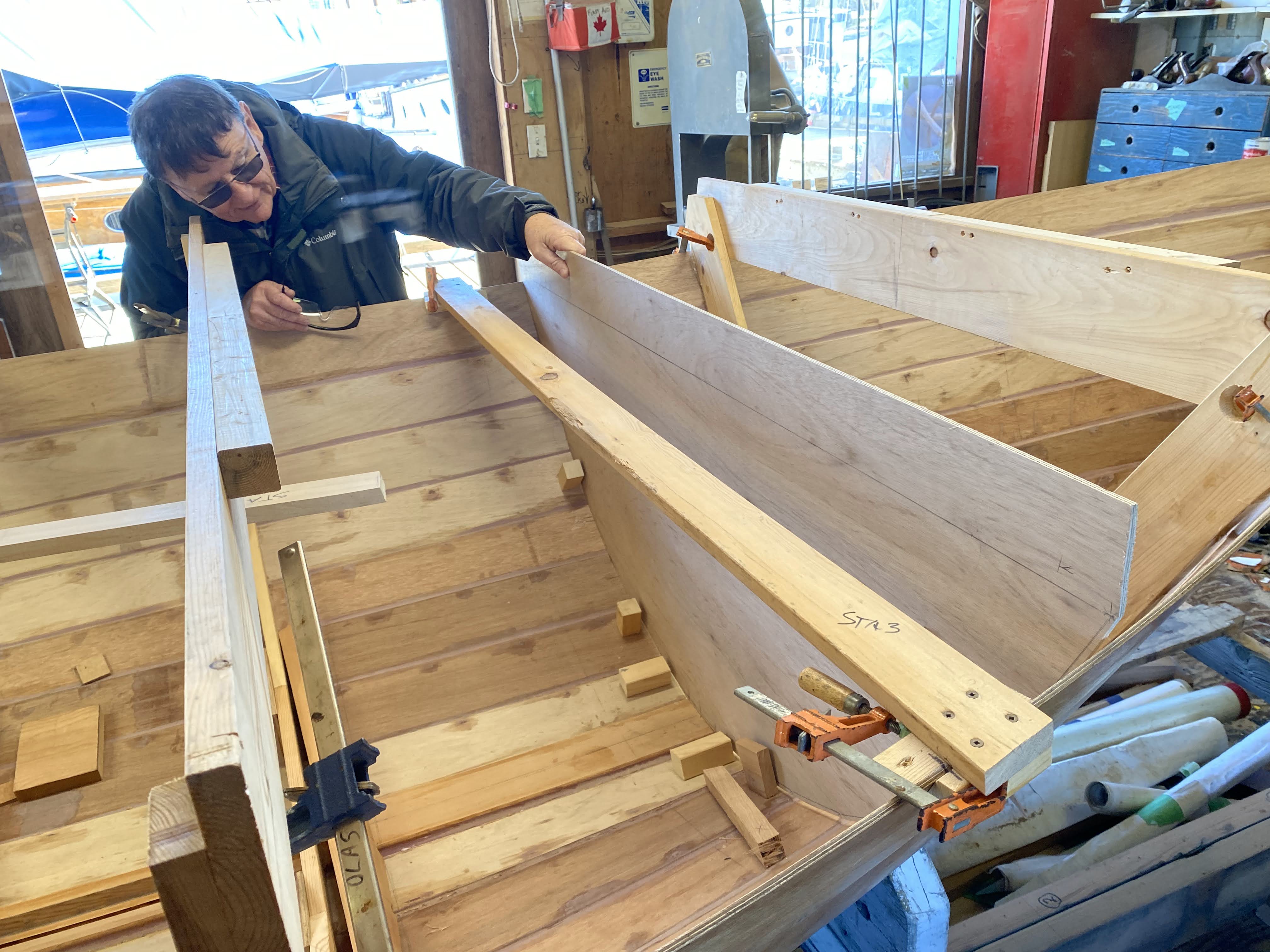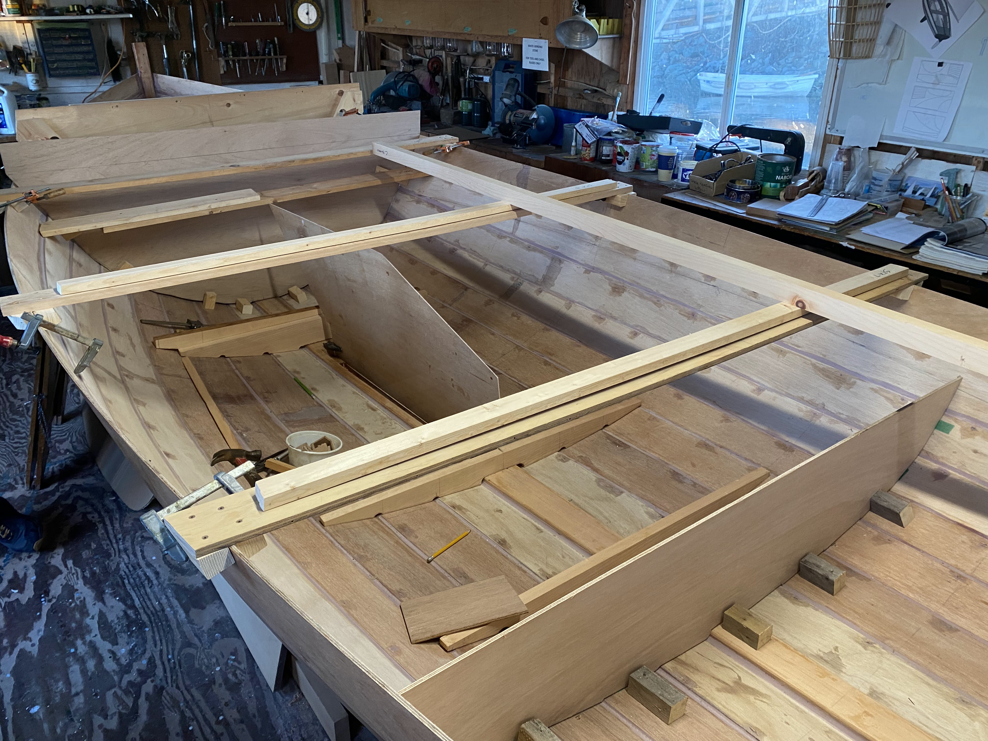 We’ve been hard at work (play) on the Gannet project, getting the interior plank fillets done and sanded, and moving on to floors and bulkheads patterned, cut, and fitted, nearly ready to glue in. The centerboard trunk pattern is well on its way too. The thing that slows us down is thinking it all through!!