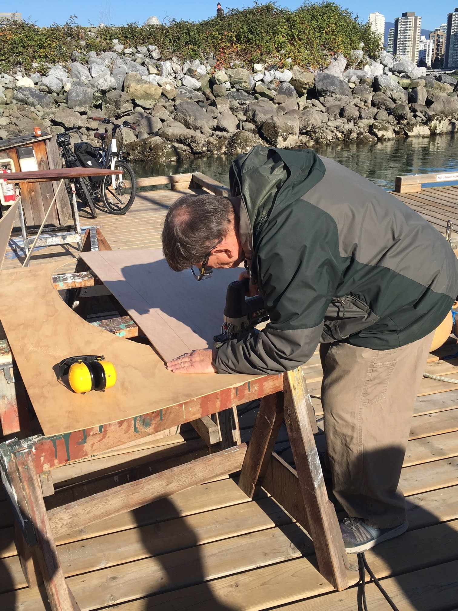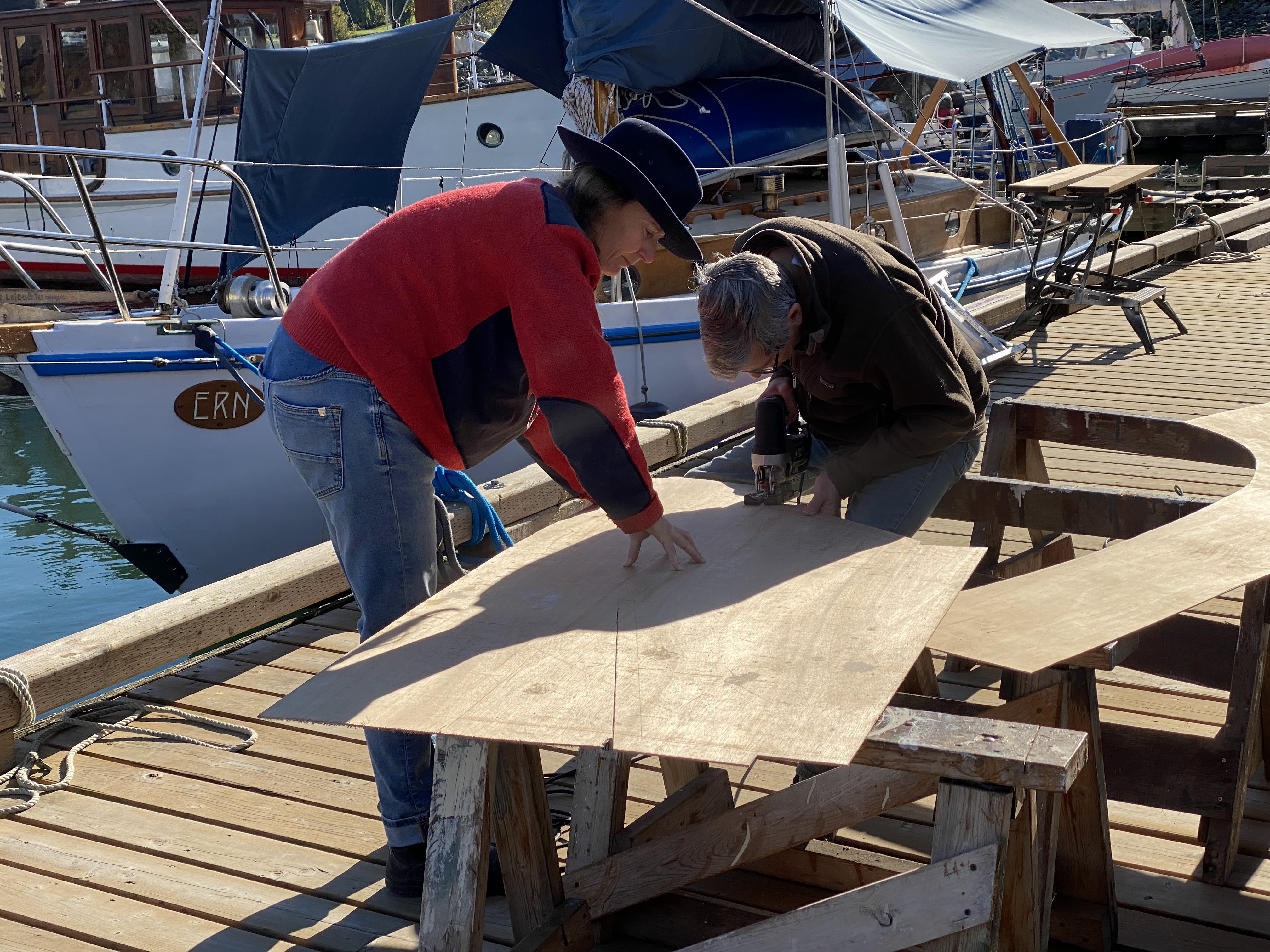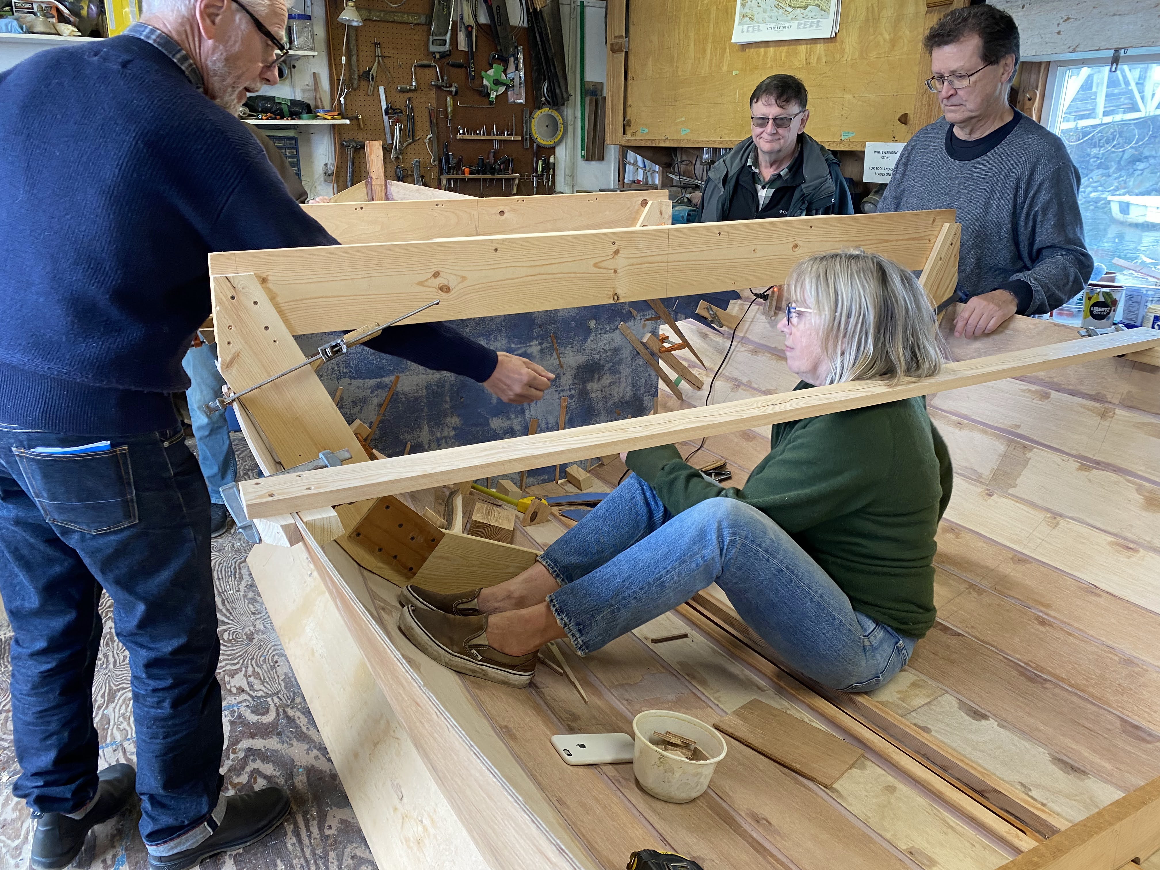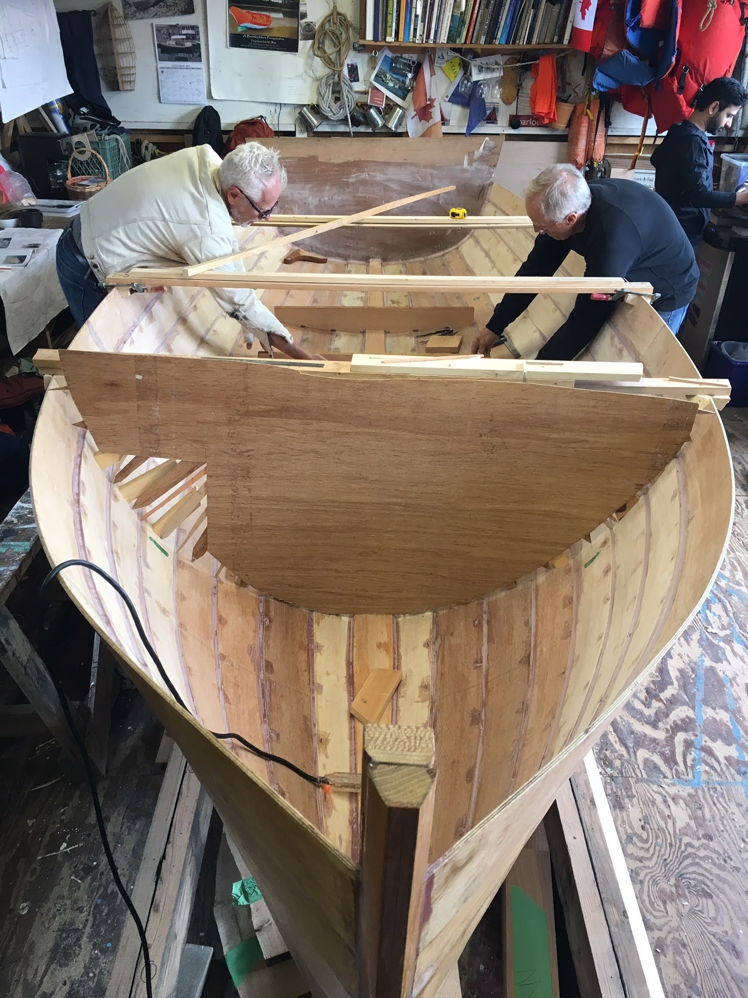 We’ve been hard at work (play) on the Gannet project, getting the interior plank fillets done and sanded, and moving on to floors and bulkheads patterned, cut, and fitted, nearly ready to glue in. The centerboard trunk pattern is well on its way too. The thing that slows us down is thinking it all through!!