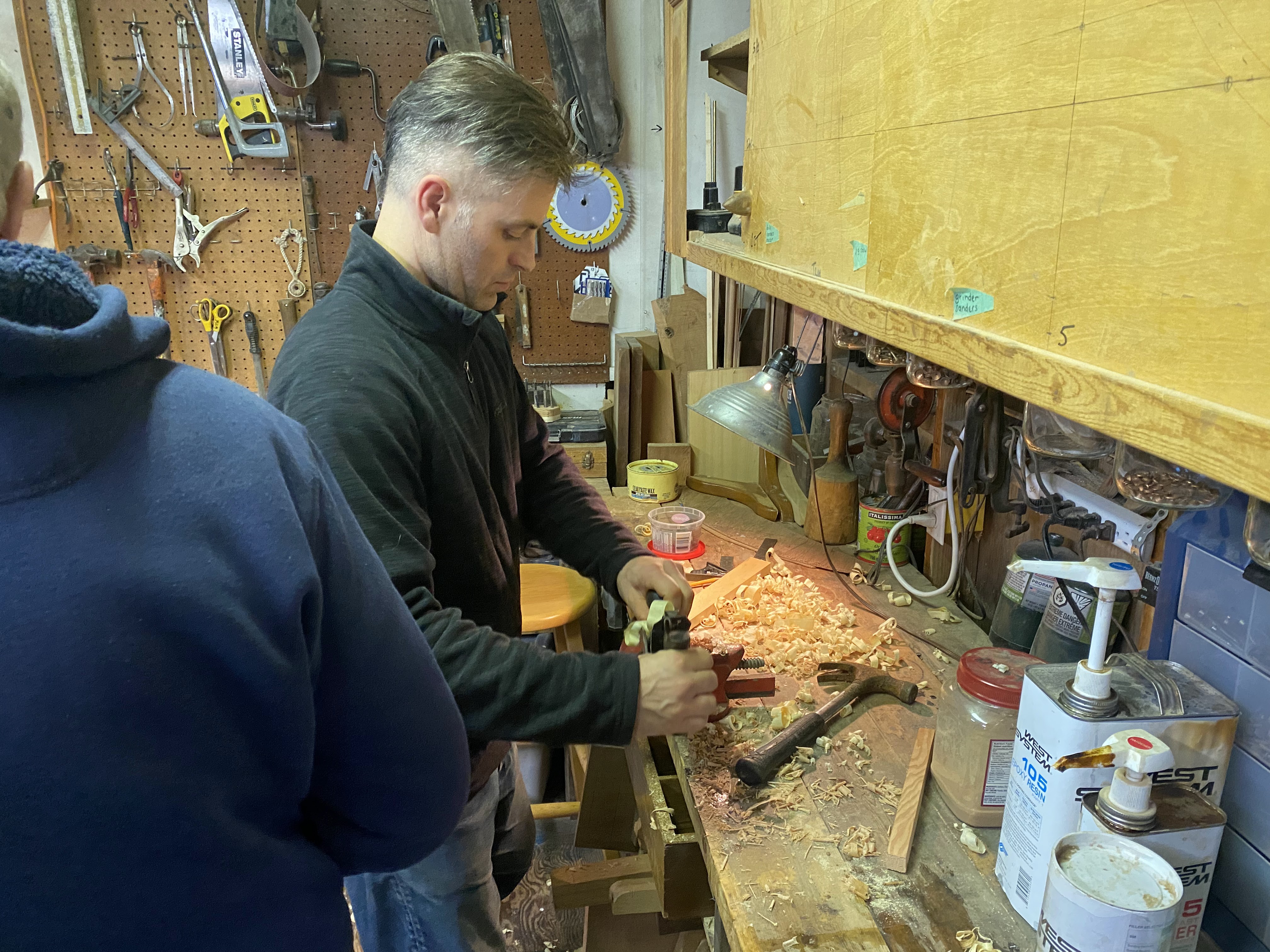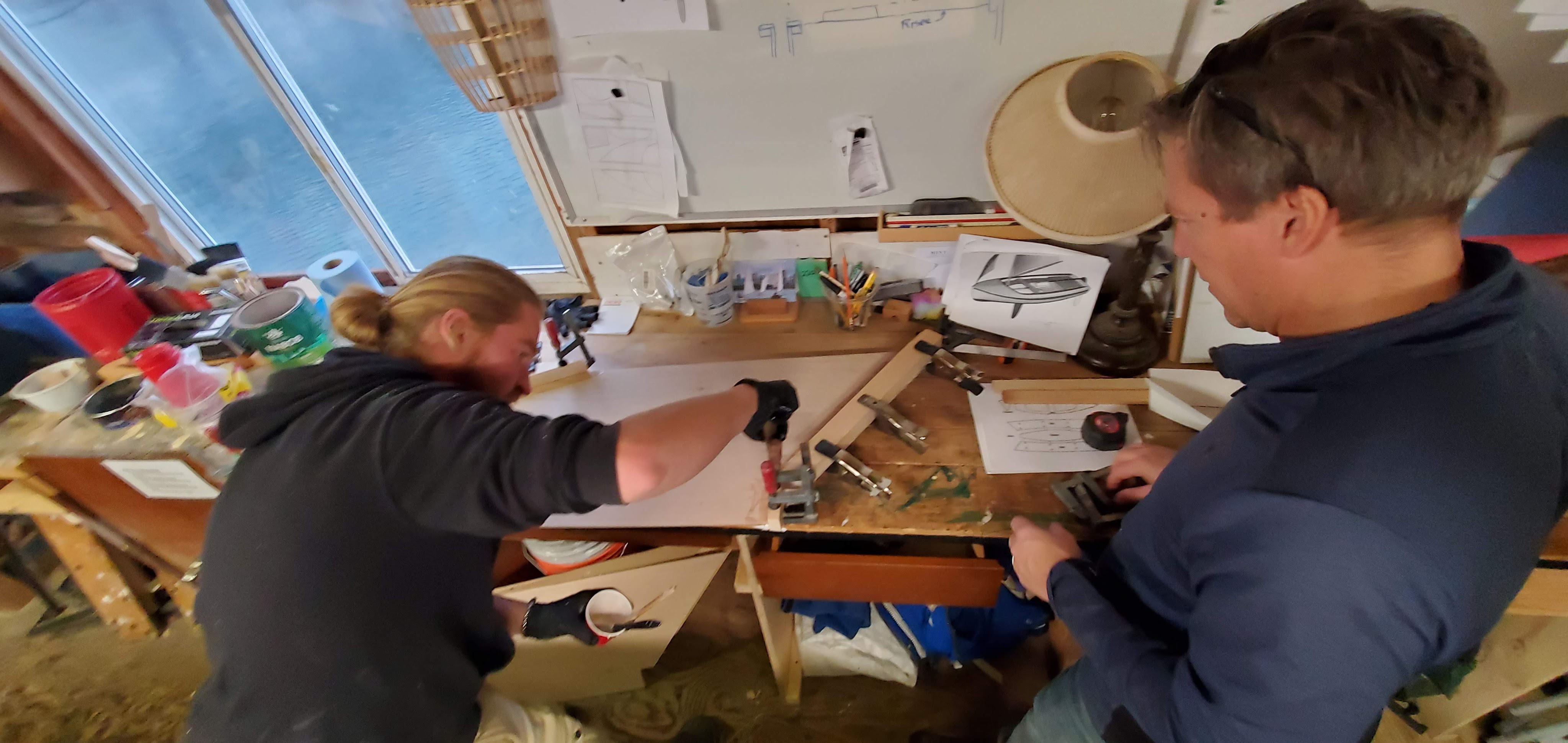 Out in our tent workshop, Enke got new oarlock pads, and got put back in the water. The tent got a floor, thanks to the donation of plywood from neighbours of Arnt & Valerie – and Arnt provided a portable workbench with a nice heavy top. This will make the tent much more useful, as we won’t have to worry as much about dropping tools through the rather large gaps between the boards, and we’ve got a bench that’s heavy enough to stand up to planing and sawing.