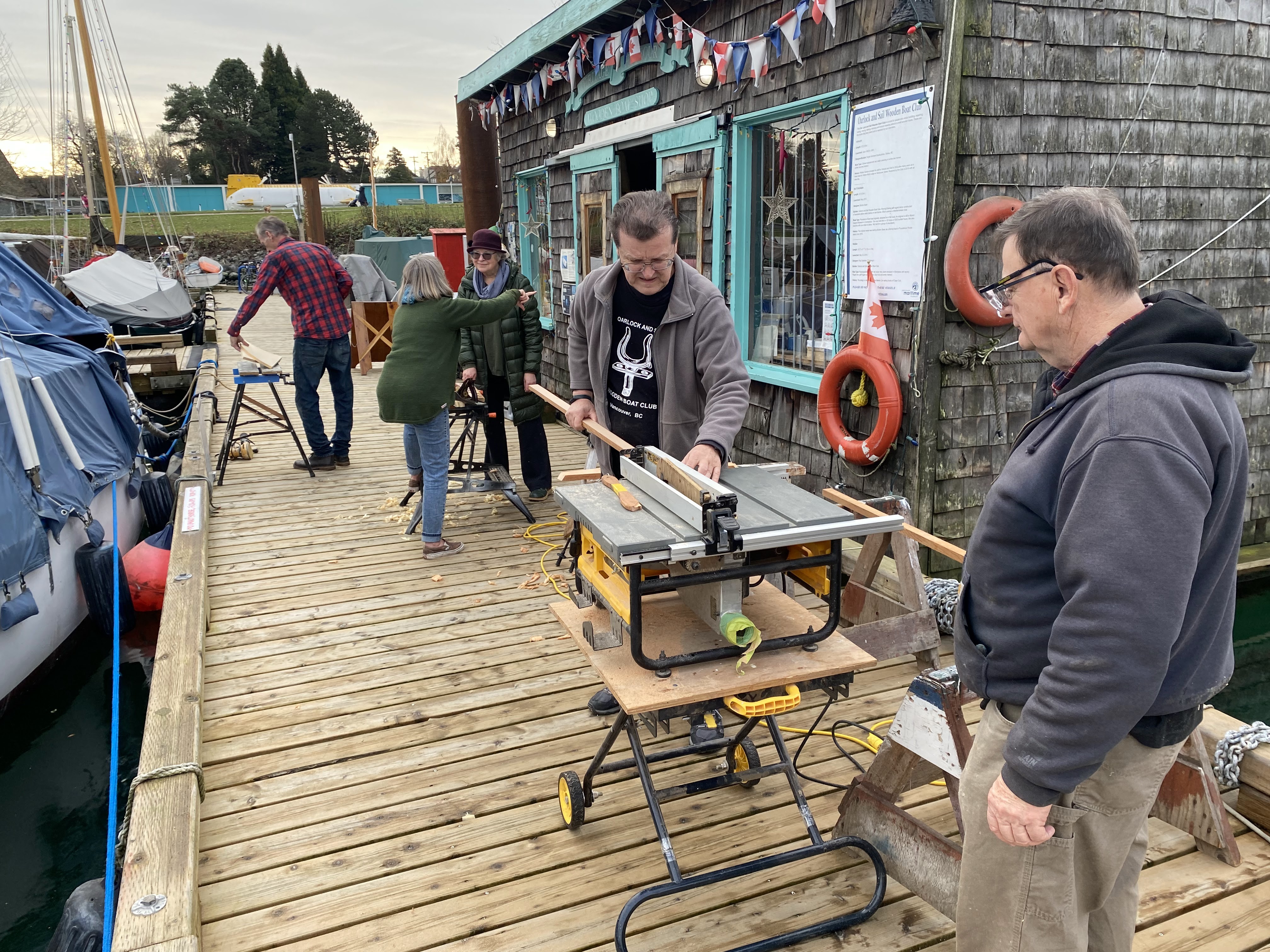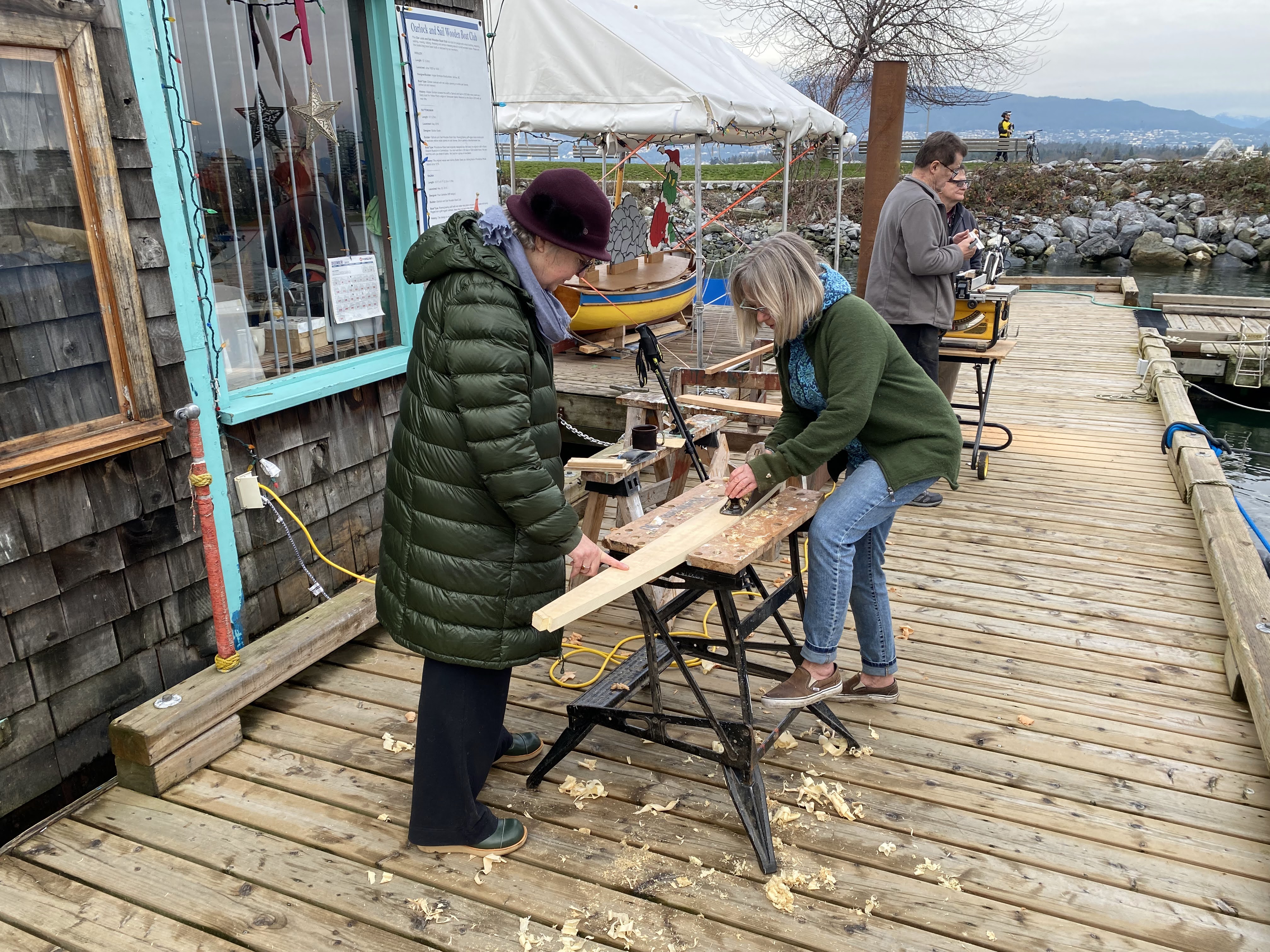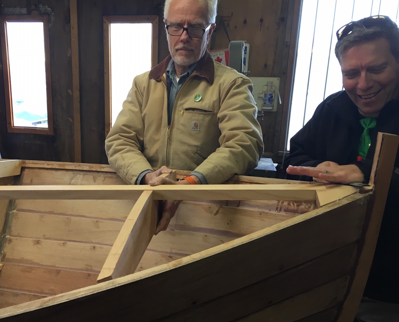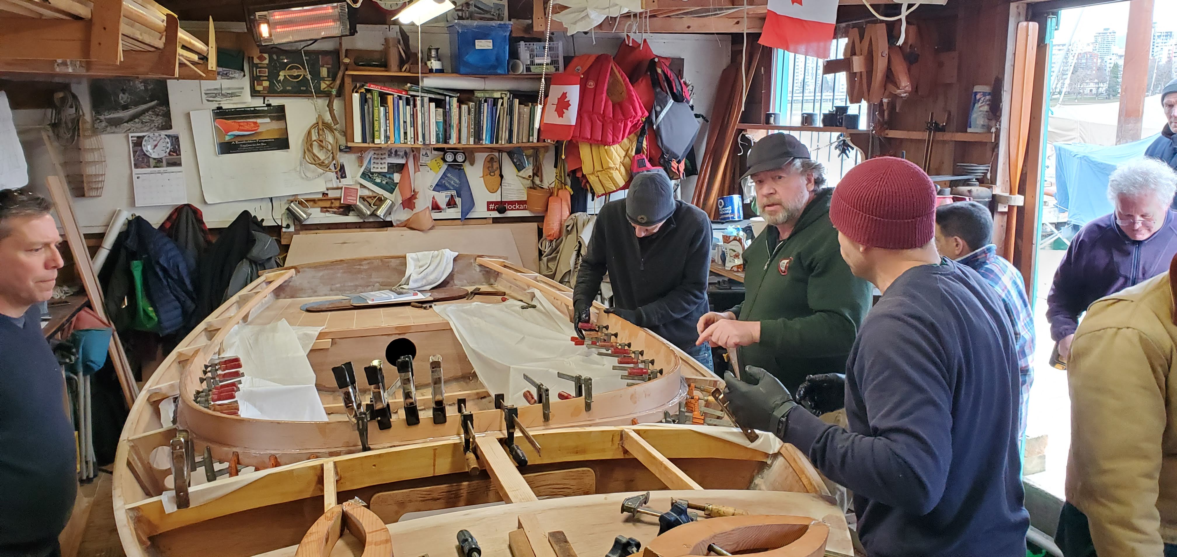 He was a prolific and well-respected designer of small boats, and popularised glued plywood lapstrake construction, which is the method we’re using for this boat. This photo shows him visiting our club when they were still meeting at Dave Bradford’s Alder Bay Boats on Granville Island in the club’s early days.