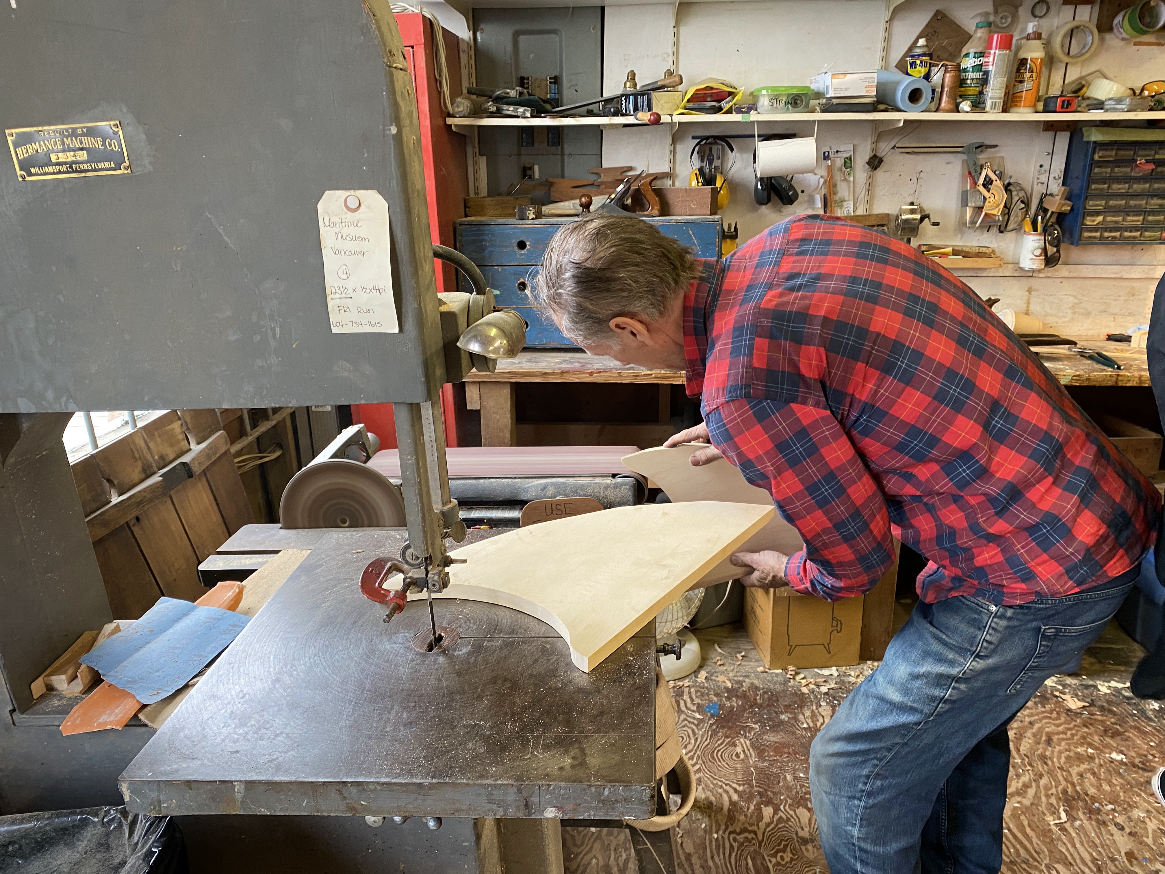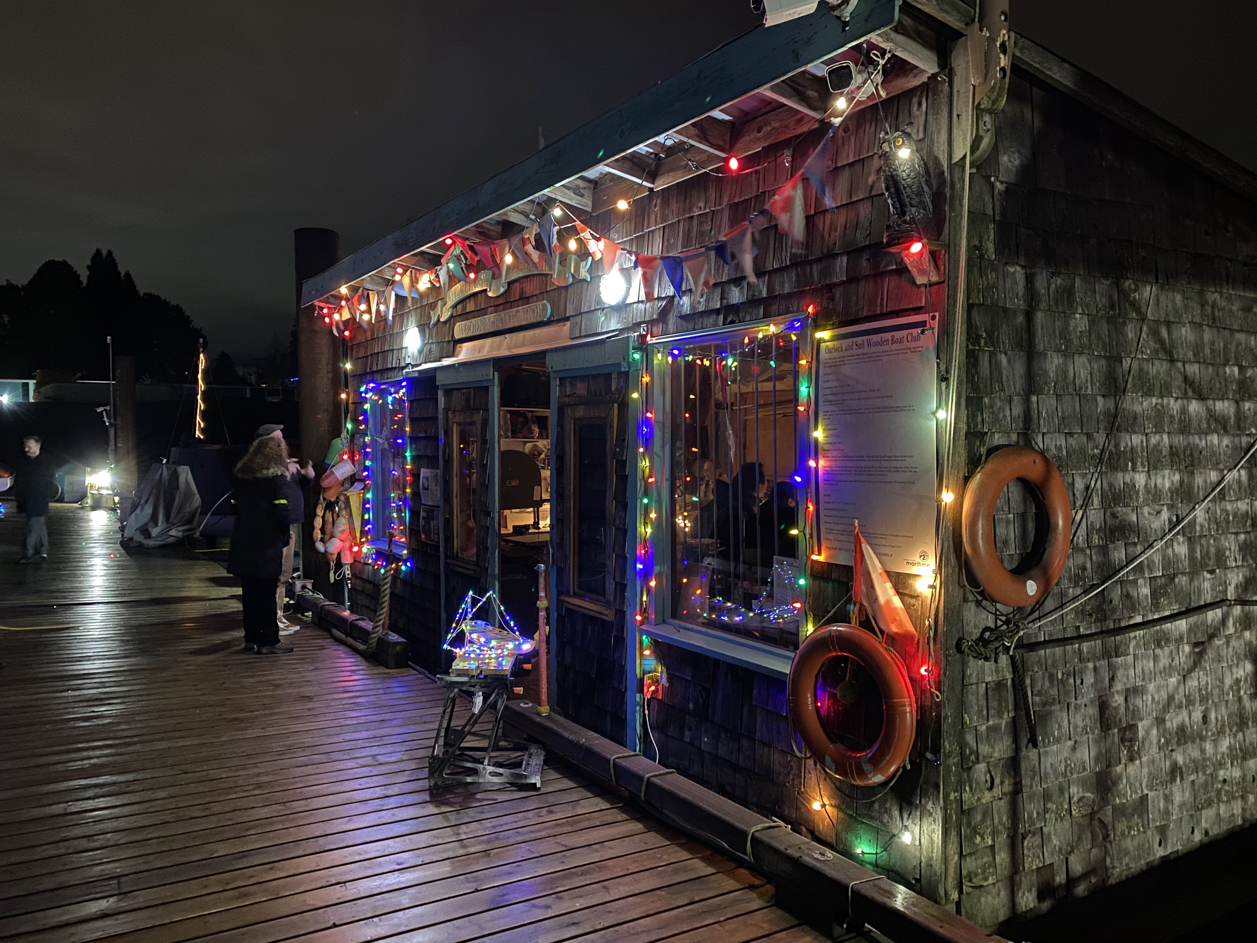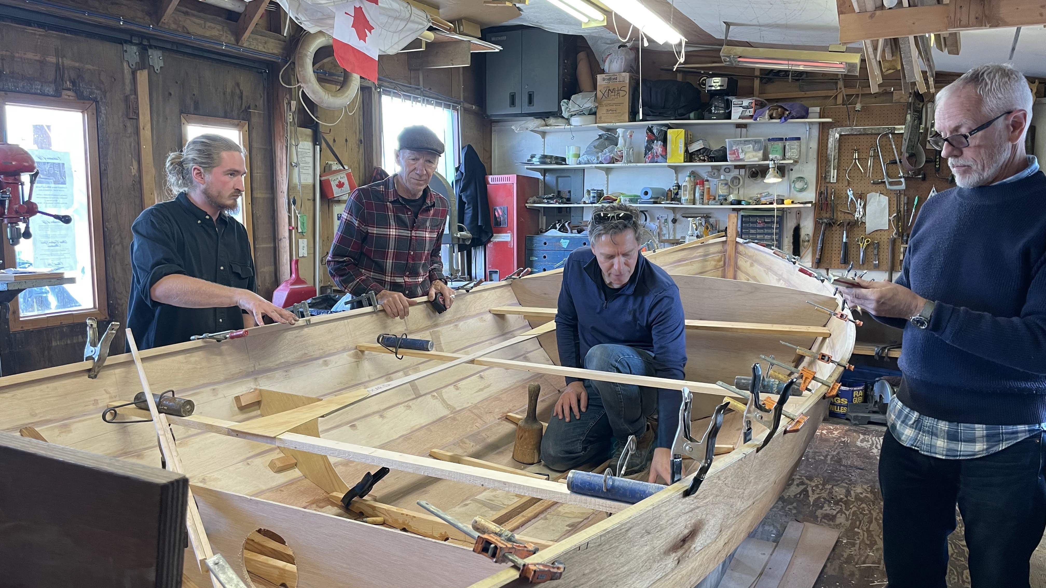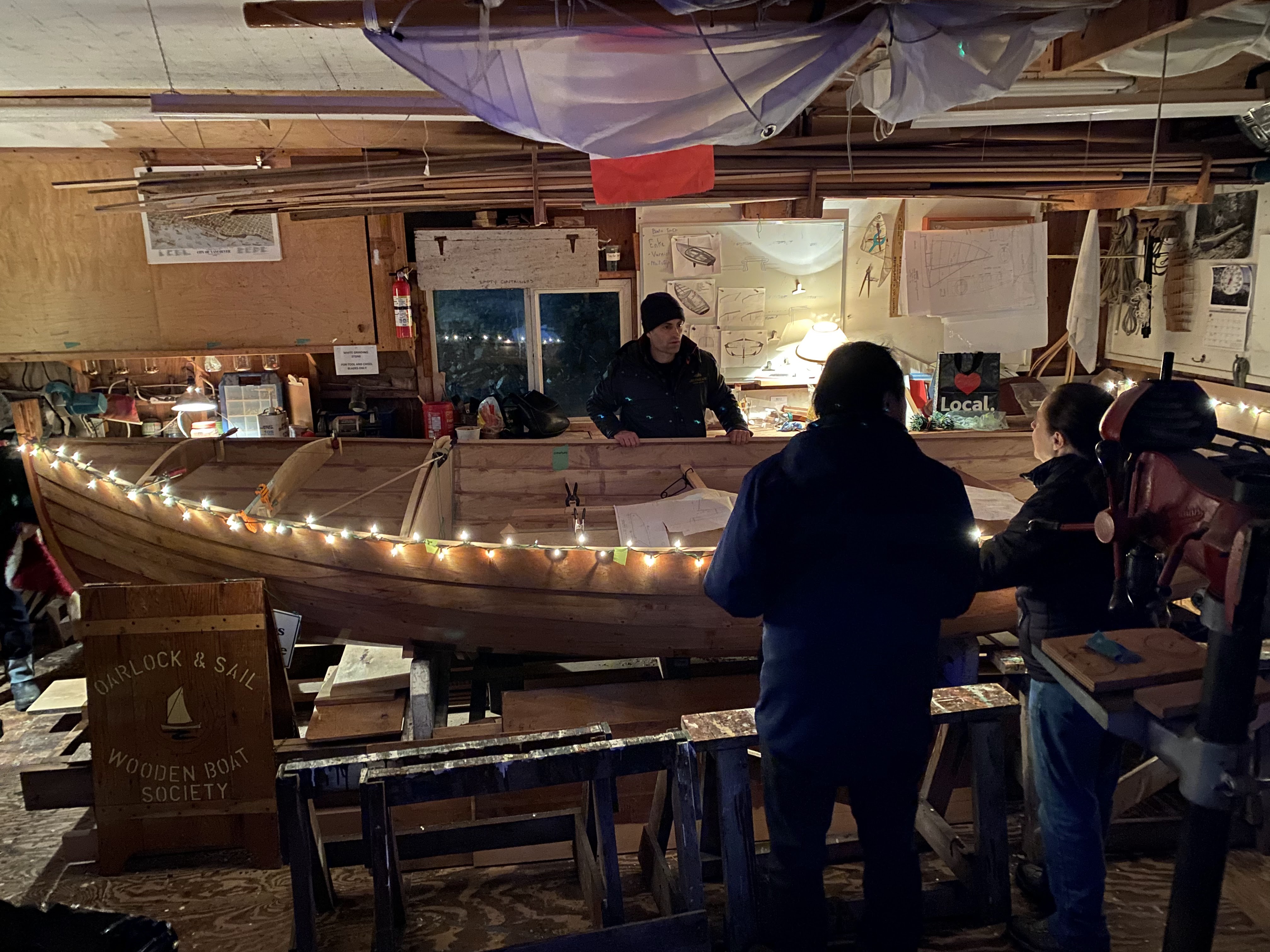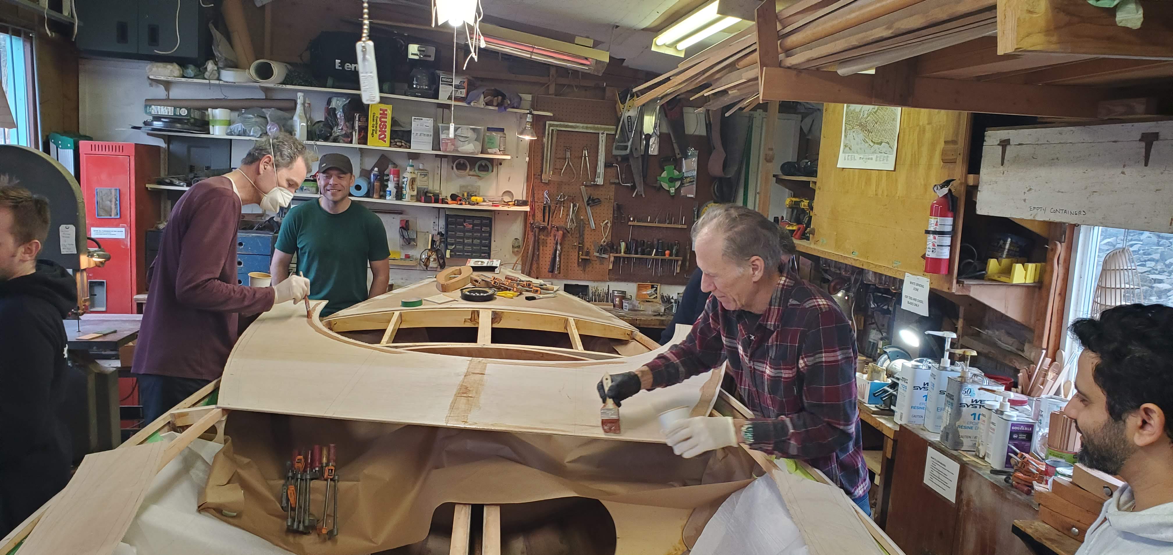 He was a prolific and well-respected designer of small boats, and popularised glued plywood lapstrake construction, which is the method we’re using for this boat. This photo shows him visiting our club when they were still meeting at Dave Bradford’s Alder Bay Boats on Granville Island in the club’s early days.