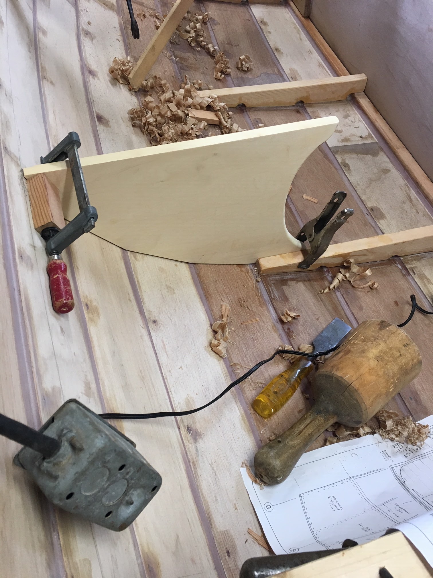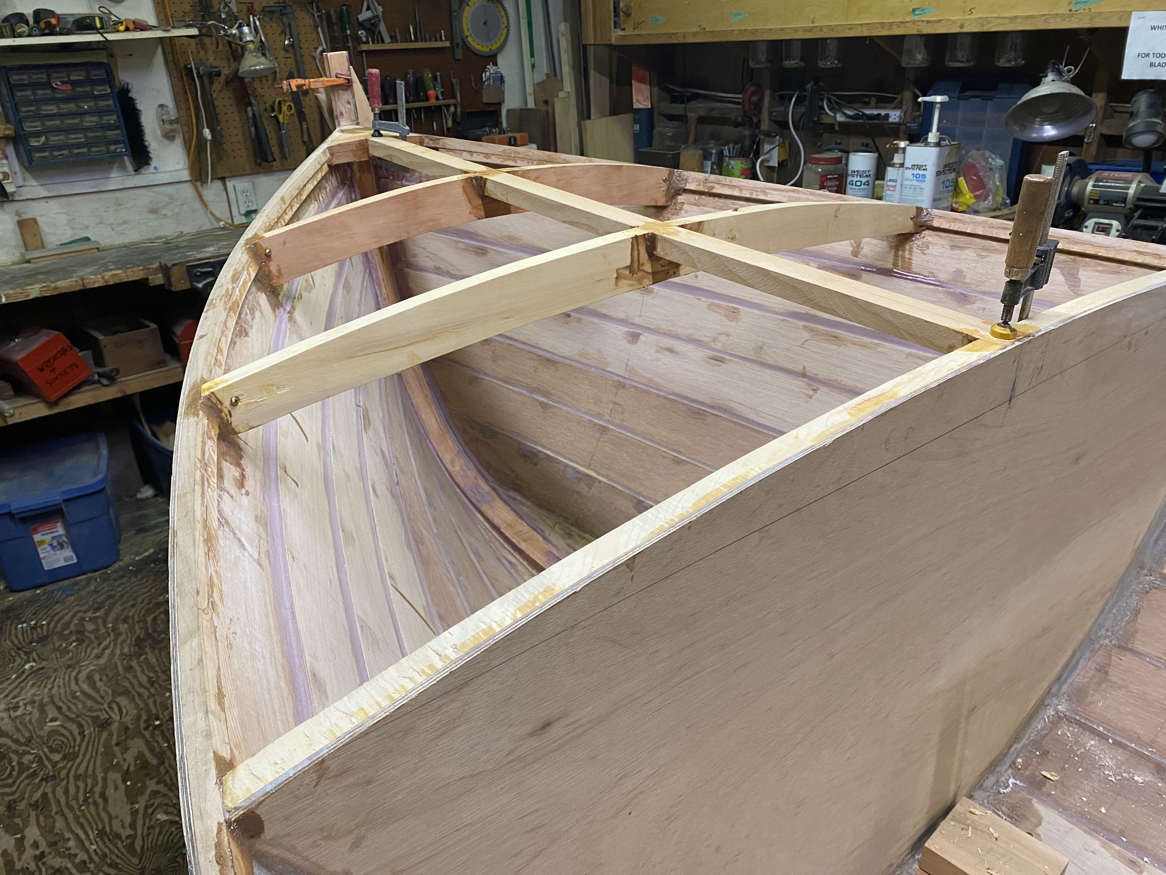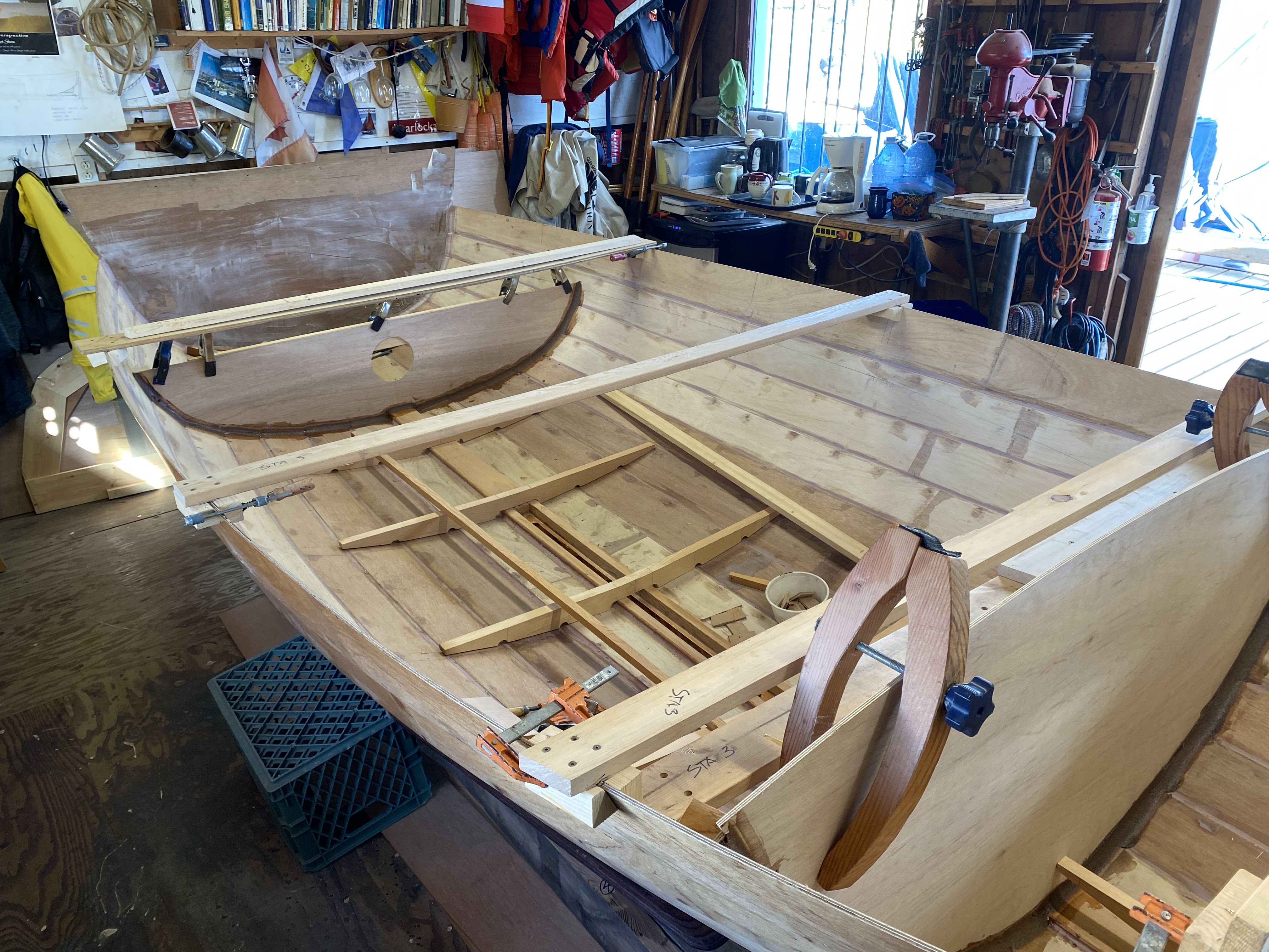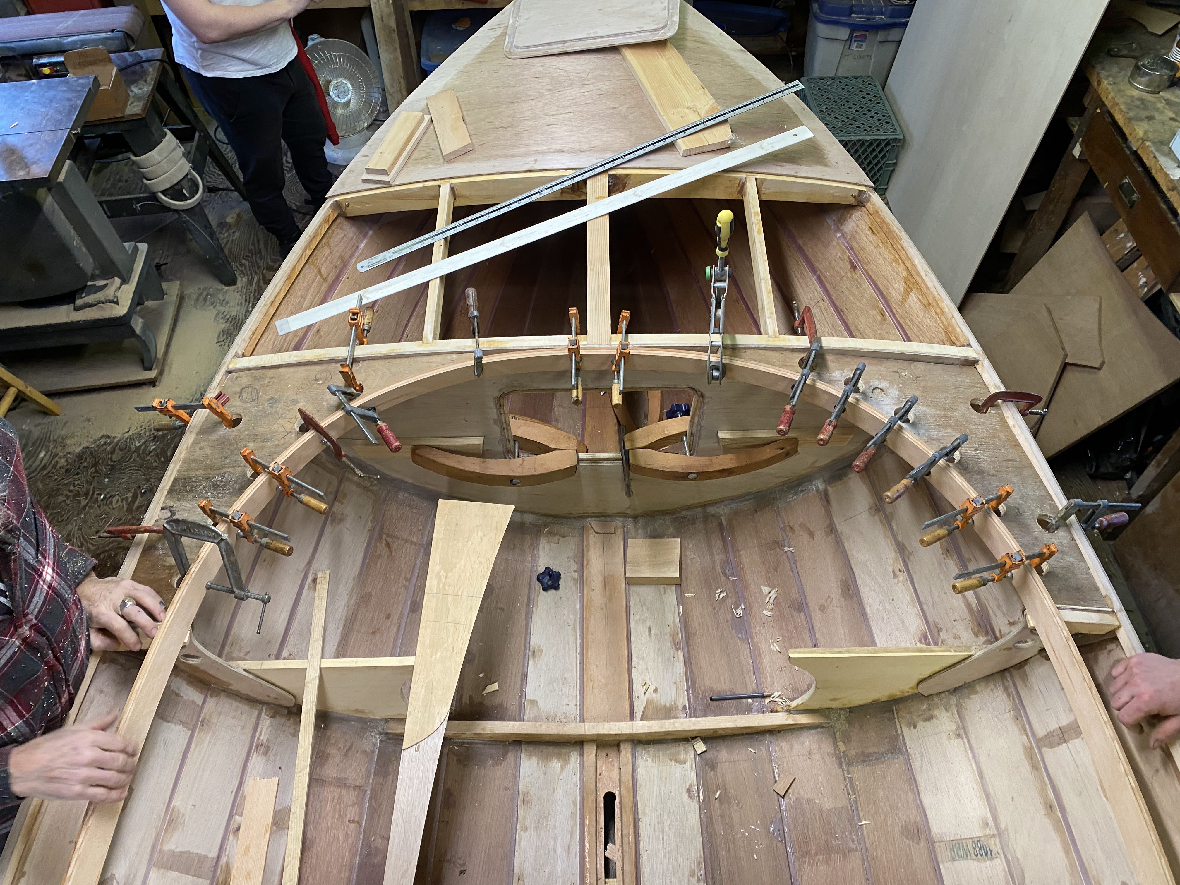 In our last post, we had installed most of the foredeck beams. Here, we mocked up the curve of the cockpit, and some suggested deck beams to support the edge of deck.