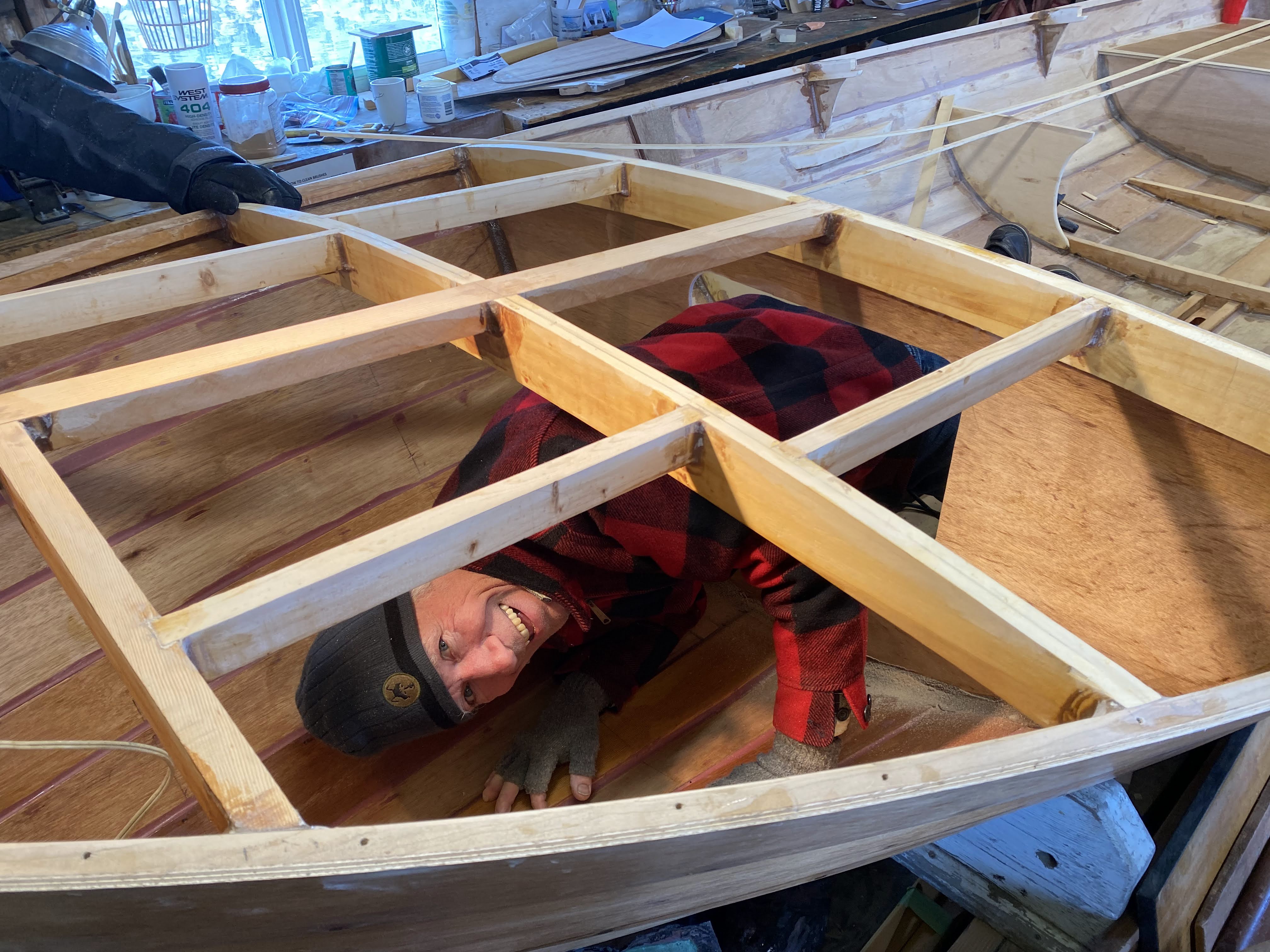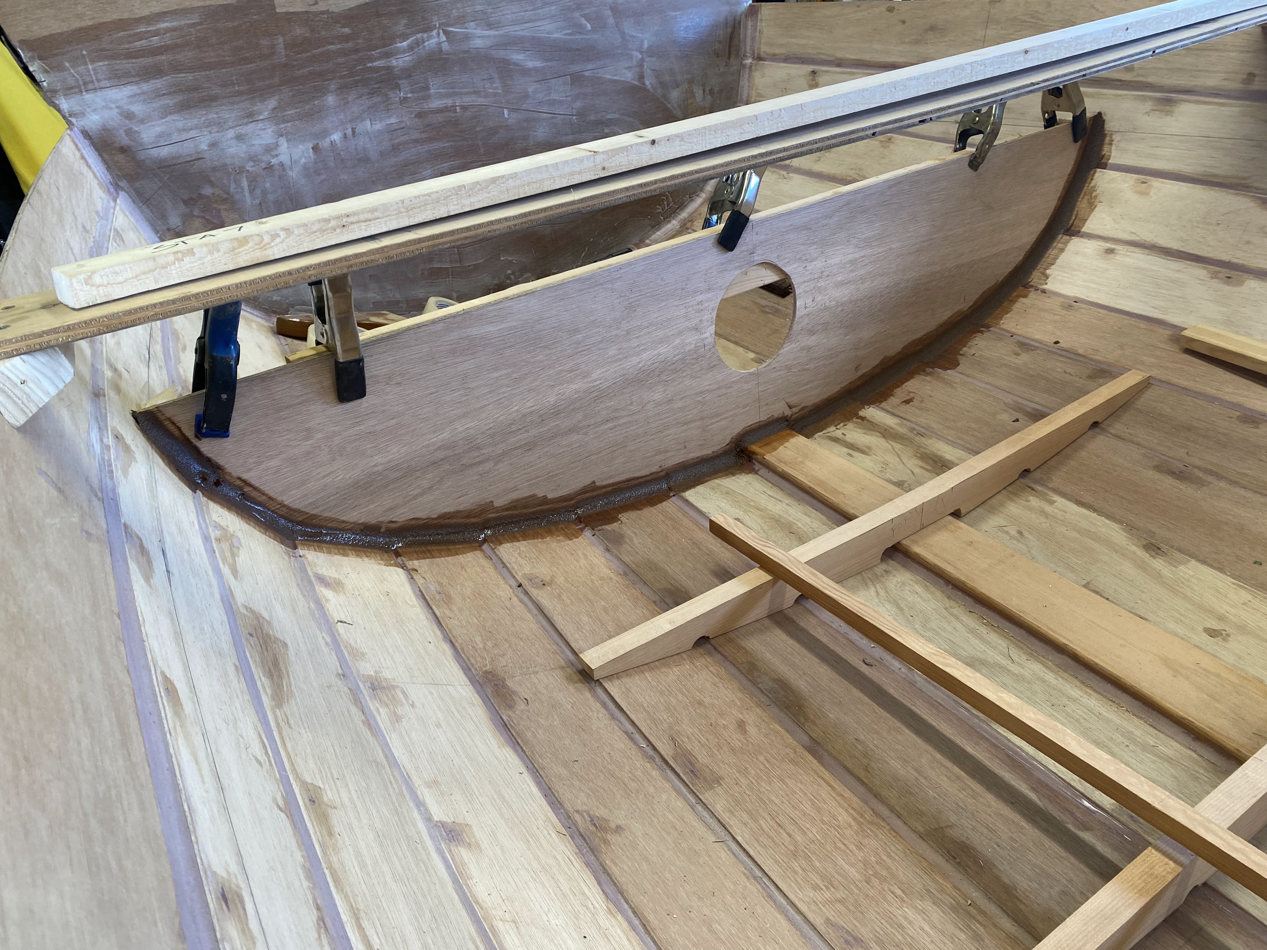 The forward bulkhead got an access hatch cut, which will allow us to store things in the dry compartment, and will give us access for inspection and repair – we had to test that someone could get in! That access will also be needed in order to apply epoxy sealer to the underside of the decking, something we neglected to do before gluing it on. Not the best workspace.