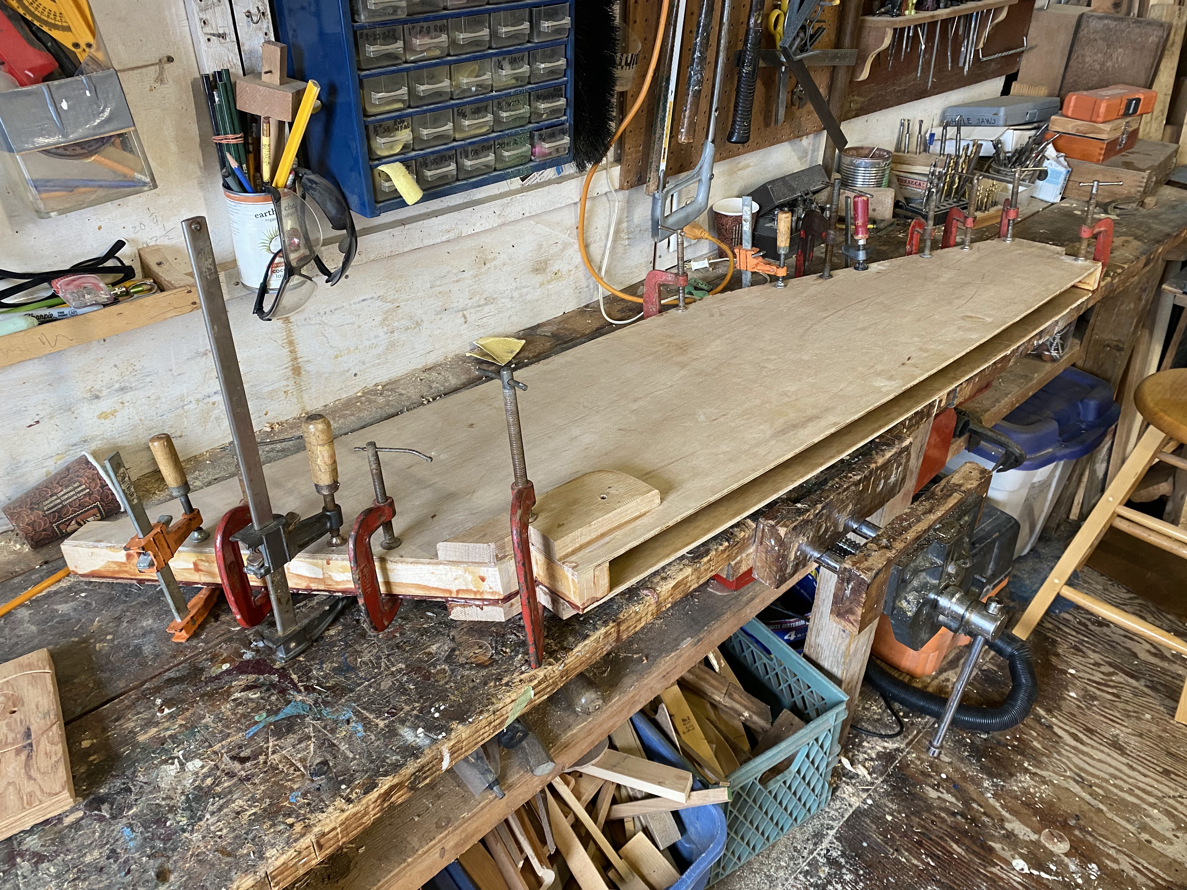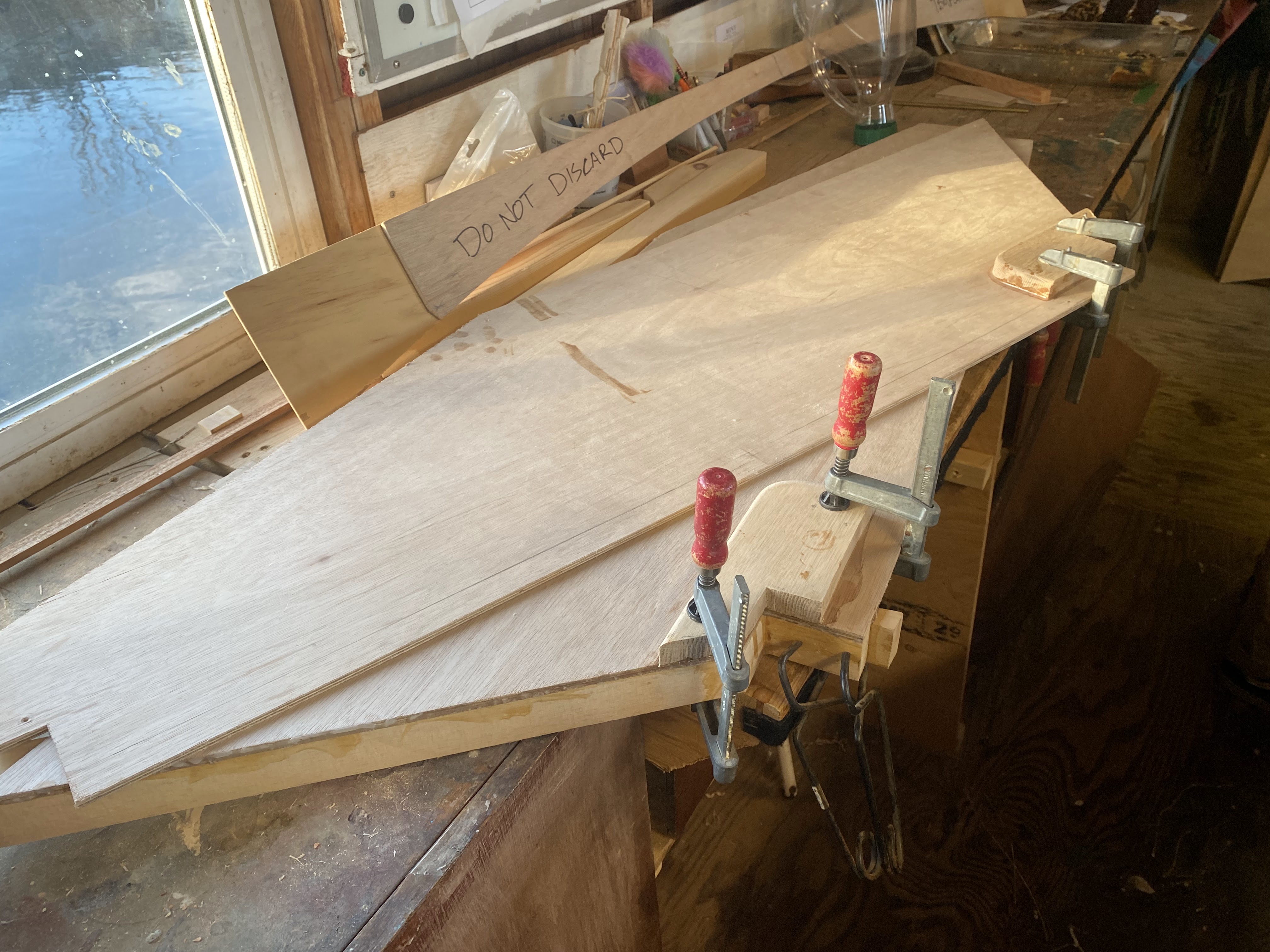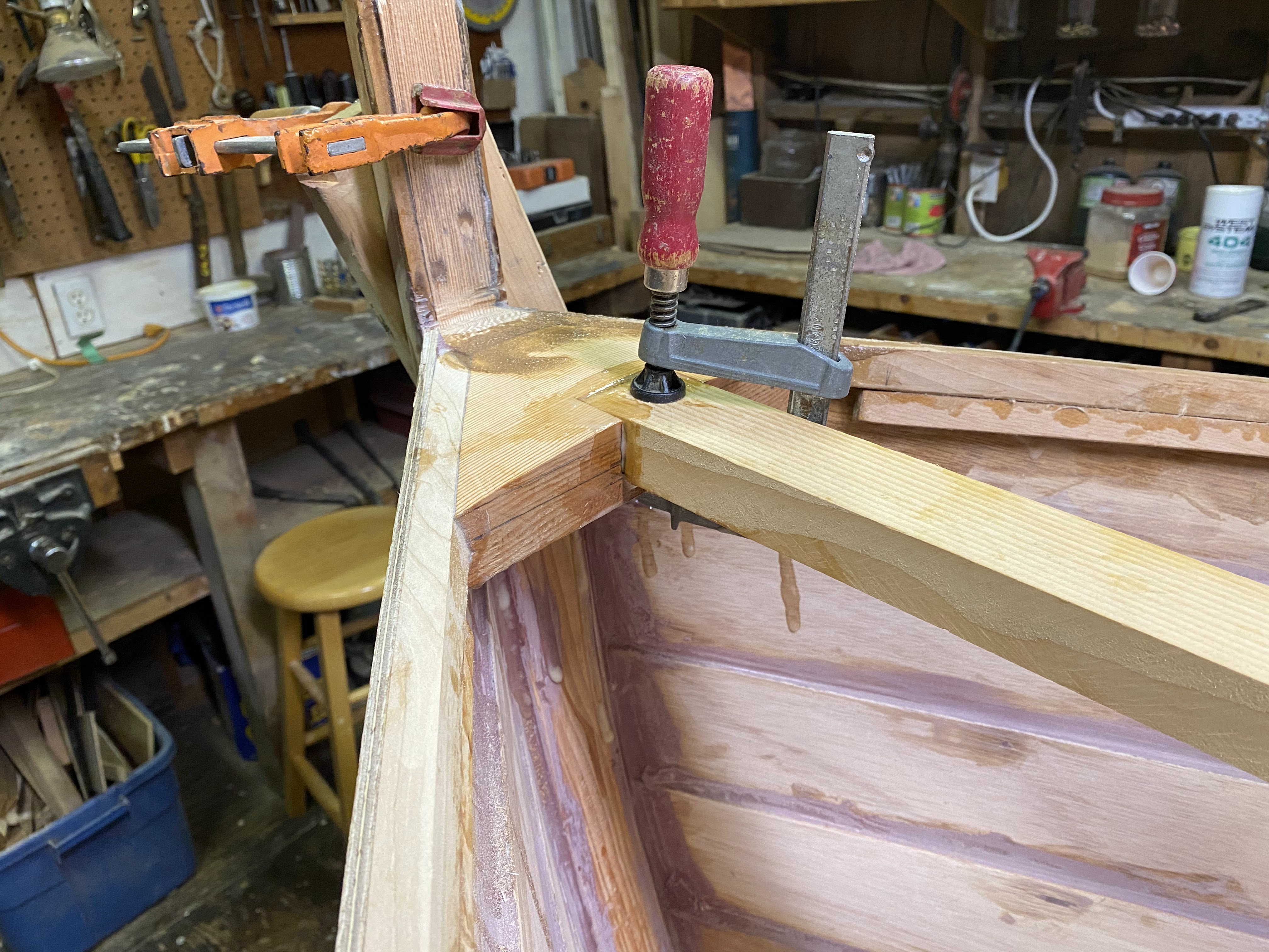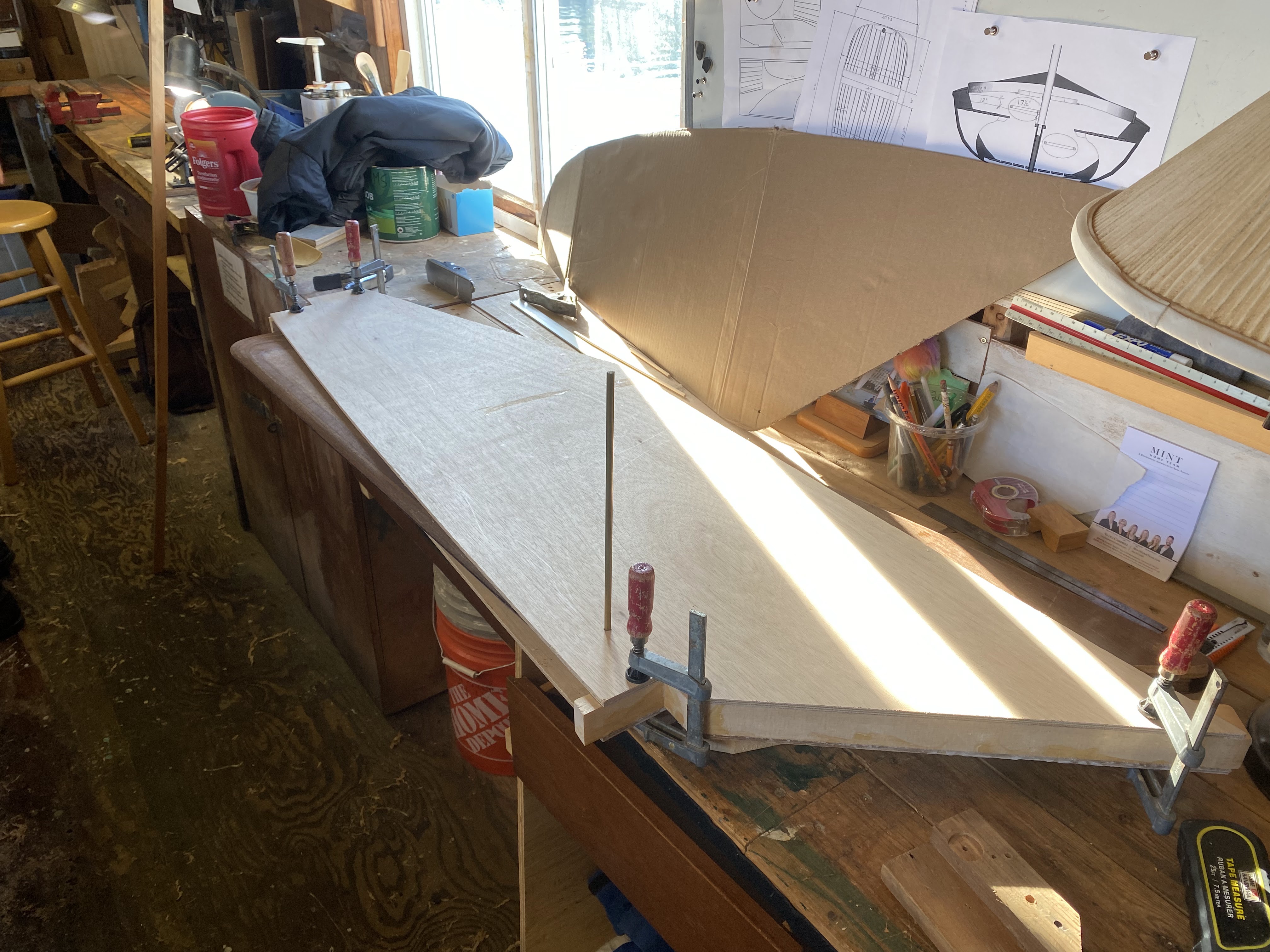 The deck carlin and the coaming got laminated next, creating the curved forward edge of the cockpit. This called for a lot of hands and clamps to get it in place and secured. The coaming was removed after the epoxy cured, to make way for the plywood deck.