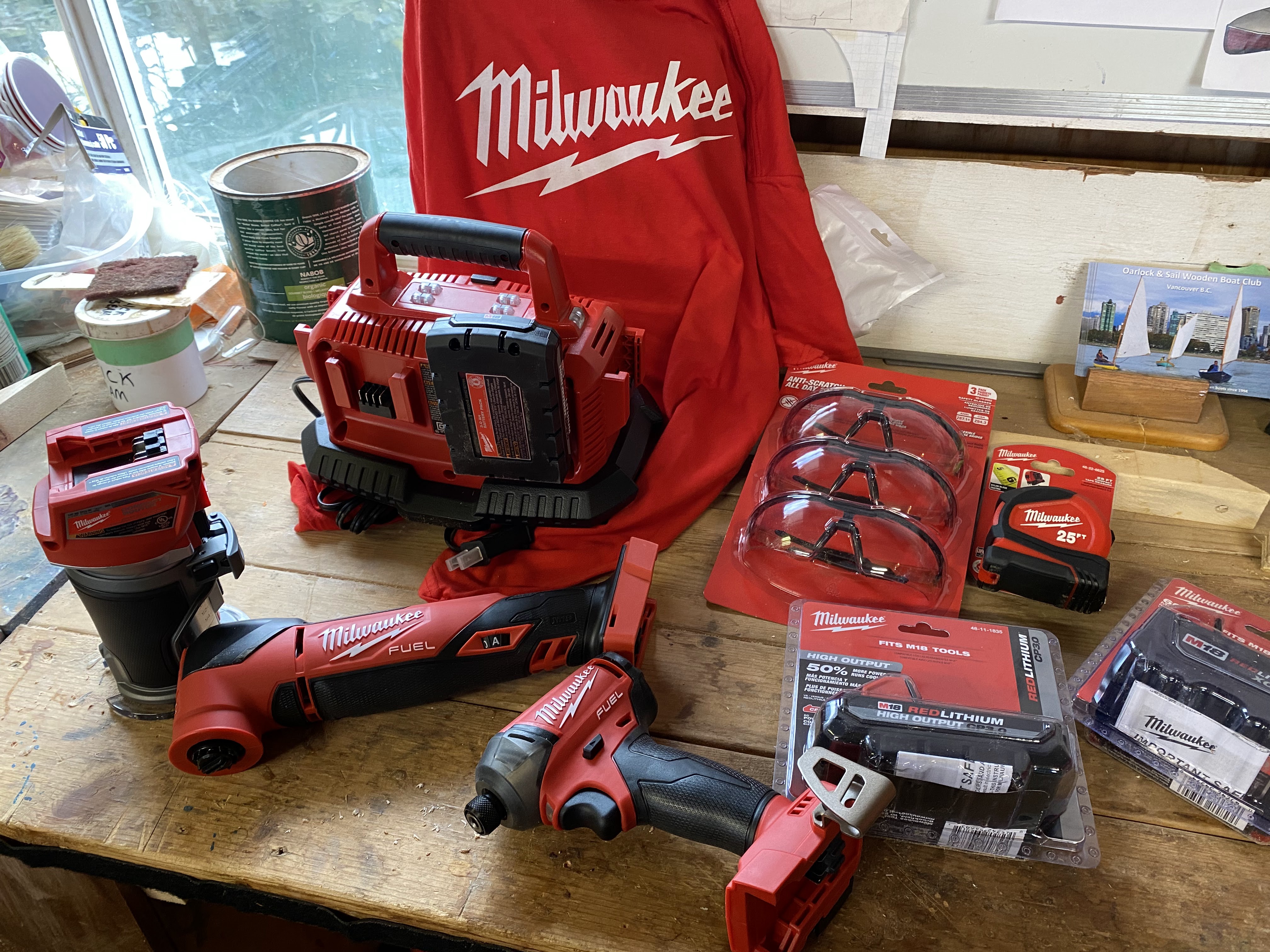 A few weeks ago, we had a visit from Faith at Milwaukee Tools Canada, bearing a bag of gifts! She provided us with battery operated router, multi-tool, and driver, along with 3 batteries and a charger, a tape measure, safety glasses, and t-shirts. The router was promptly put to work rounding over some corners – thanks Faith!!
