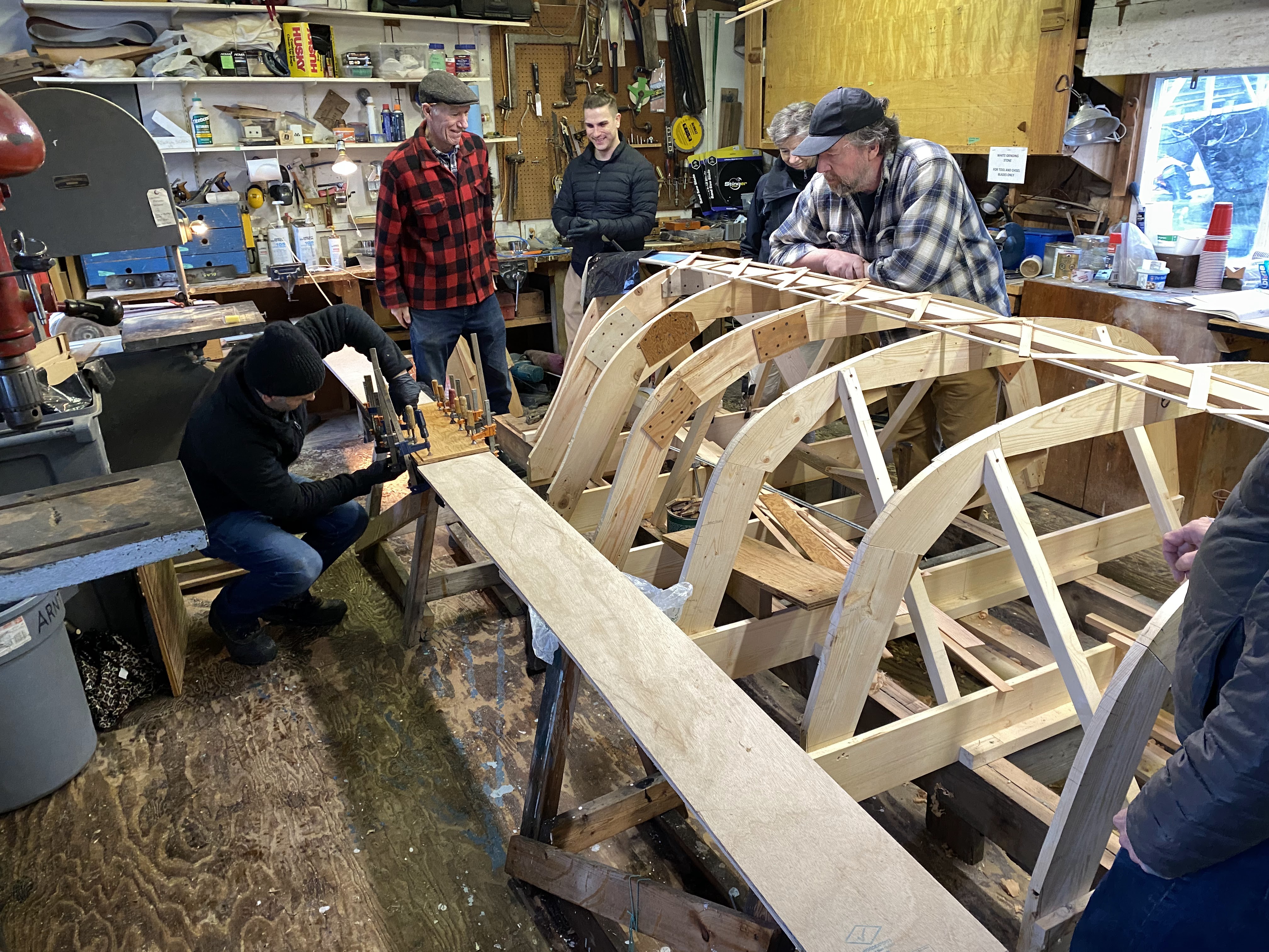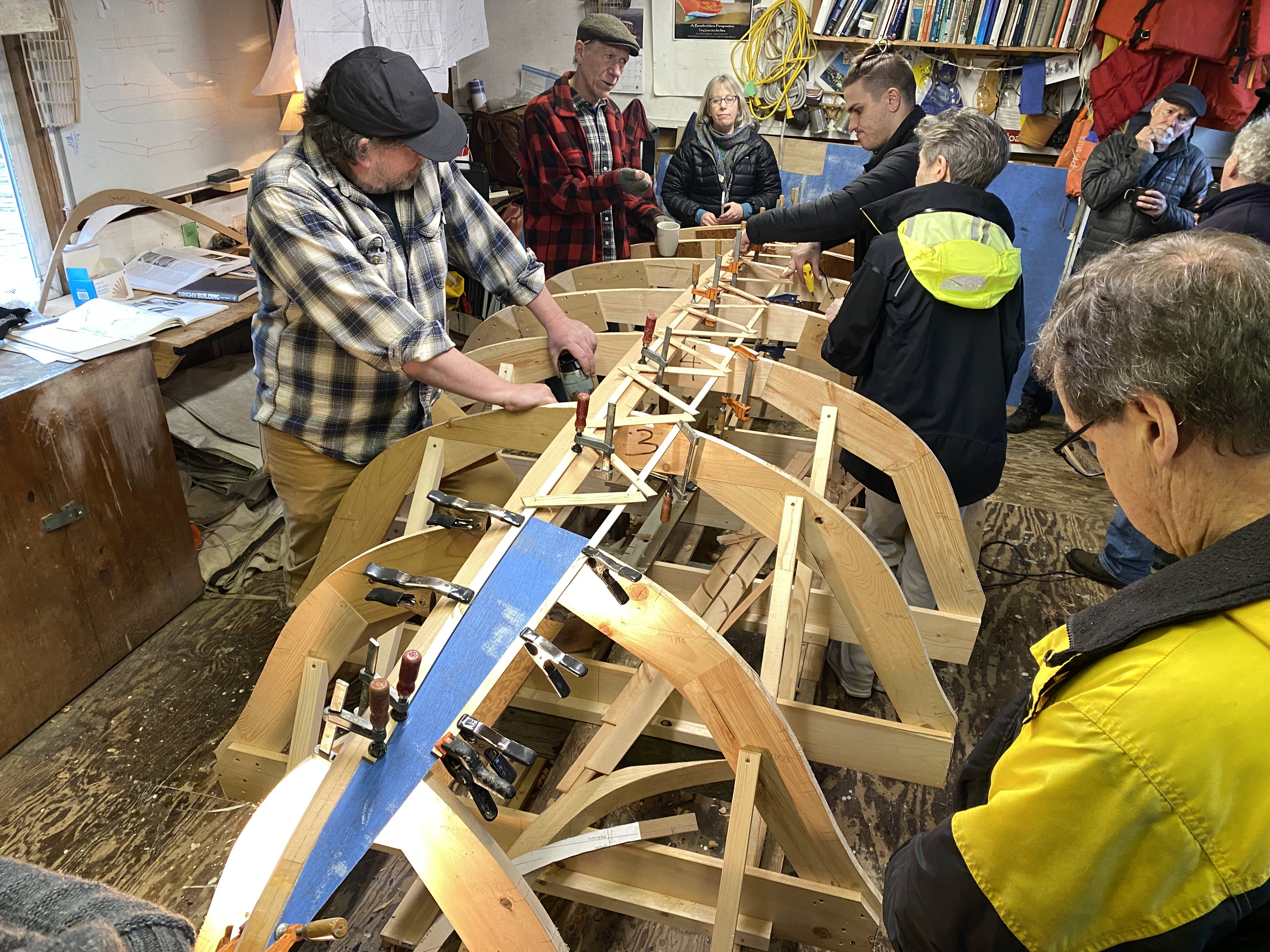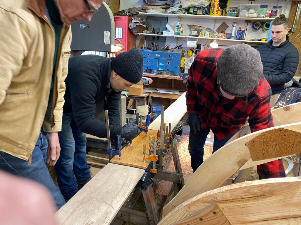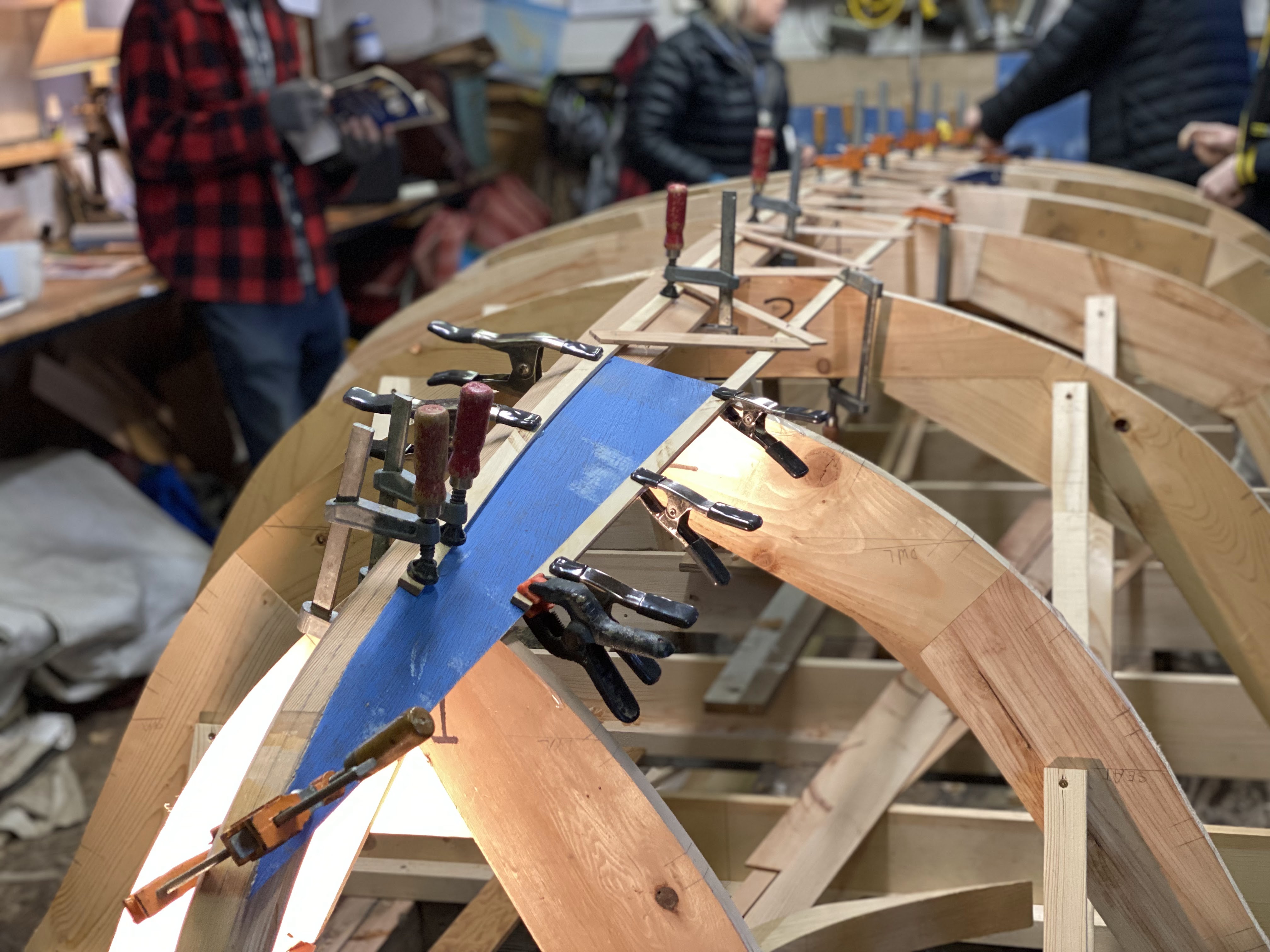 We then laid out the planks end-to-end (taking up much of the shop!), applied the epoxy, and clamped them together. The whole process went very smoothly, thanks to several of our members having experience with this type of construction, and it was a great educational experience for the rest of us!