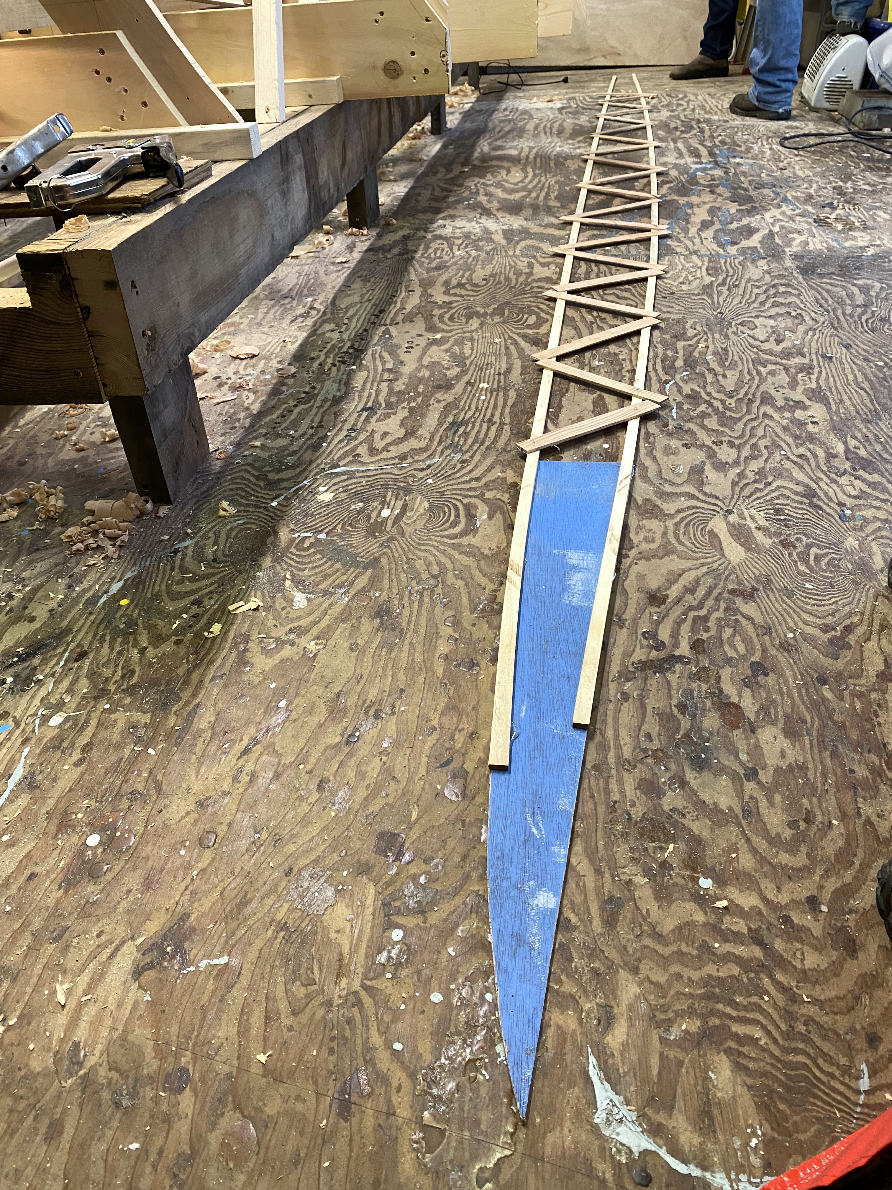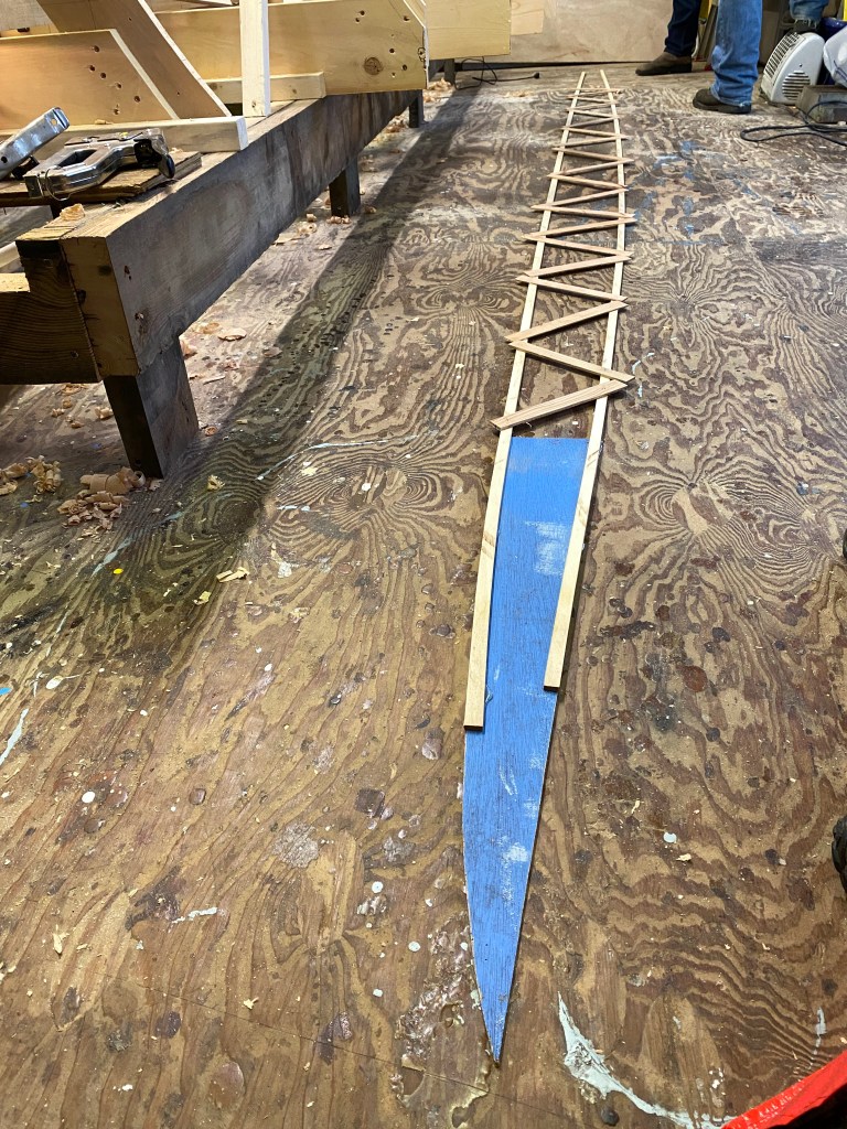 We tried out the method of patterning where we clamp or nail a thin batten in place where each edge of the plank will land, then hot-gluing short sticks across the gap, effectively creating a lattice truss. We also glued a piece of thin plywood at the stem to get the shape of the hood end. Taking the assembly off the hull, we laid it flat to determine the shape of the plank. Worked like a charm!