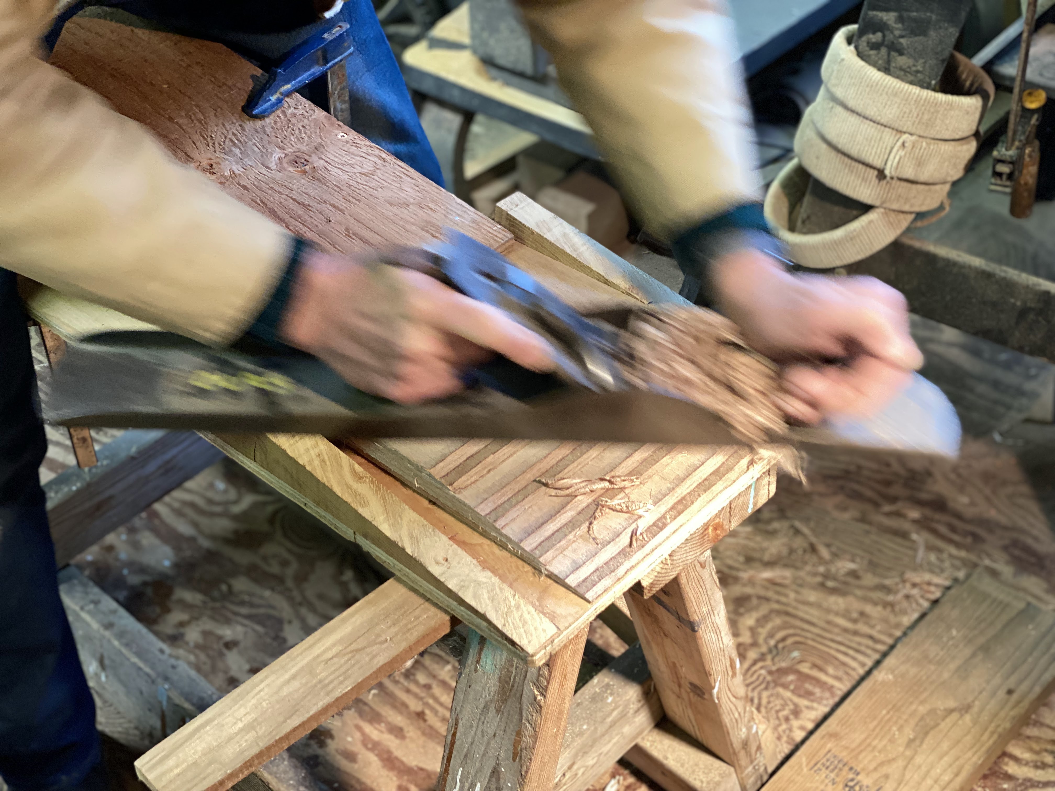 Next, we moved on to cutting a blank for the planks, and scarfing and gluing them to create a full-length plank. The boat is 14′-5″ long, and our plywood is 8′ long. We need to join two pieces end-to-end, and the way to do that is a scarf joint, which is an angle cut across the width of the material, and then epoxy-gluing them together. We made a jig to get the proper angle, stacked 4 blanks (2 for each side of the boat) and then used hand-planes to cut the sloped ends.