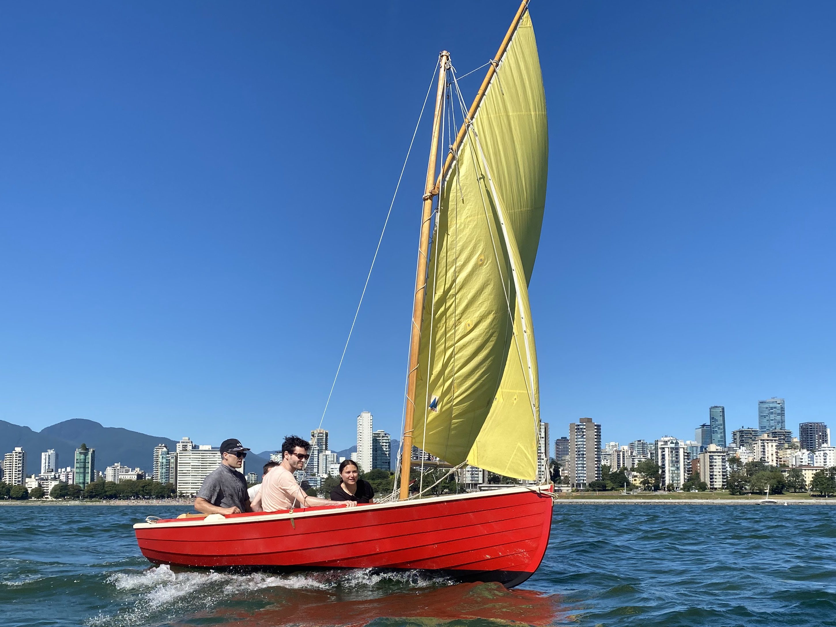 A Charles Mower “Buster” design, it is cedar planked on oak frames with mahogany trim. Sail is a sliding gunter rig. We re-launched December 2018 as Enke.