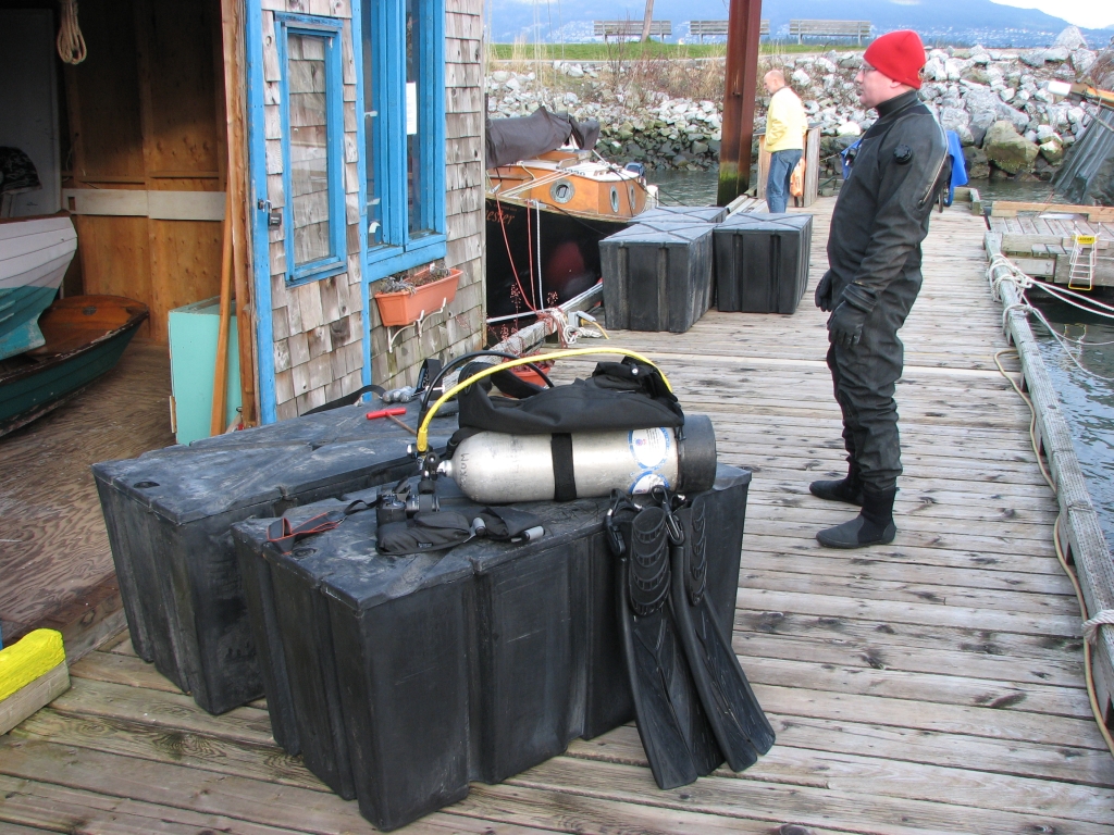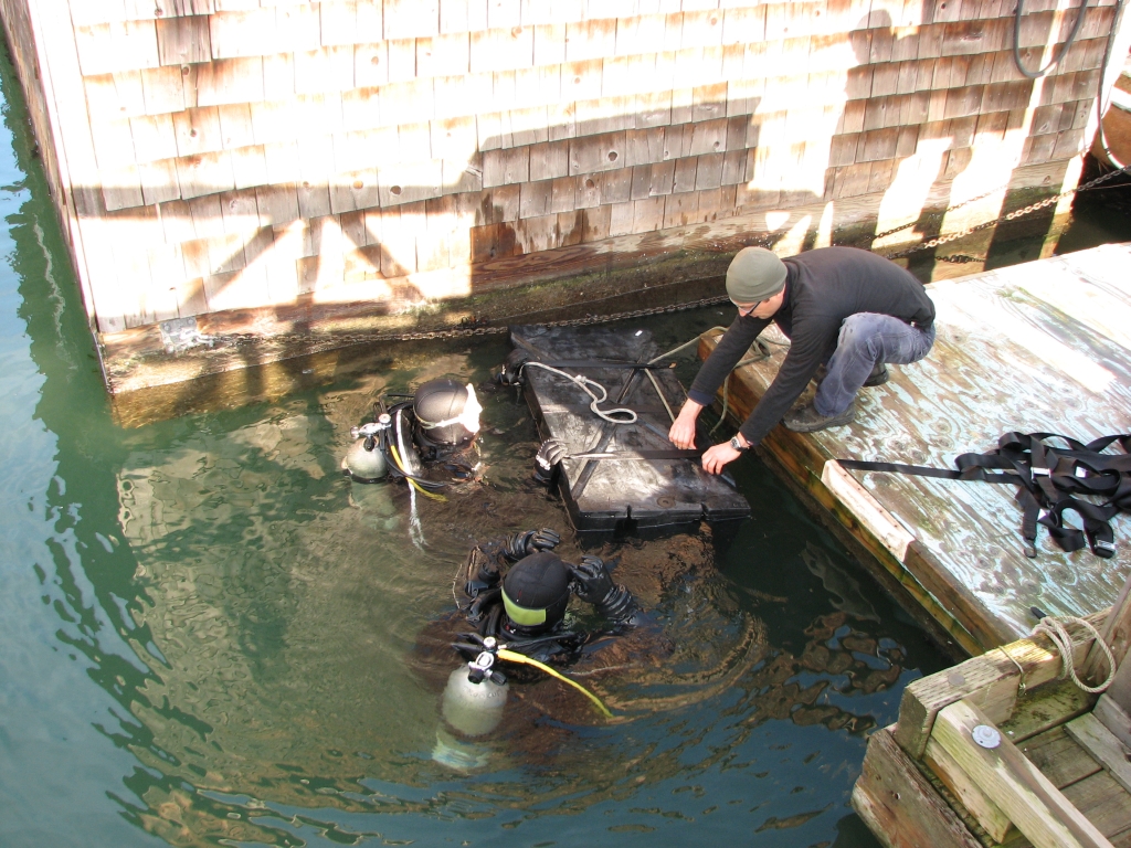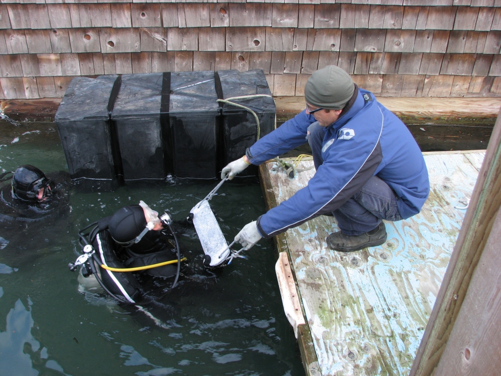We are pleased to announce that the new floatation has been installed in the Boat Shed today. The shed is now floating six or seven inches higher than before, and is very stable. Our Shed Committee, headed by Robert Buller, arranged for the purchase of six tough plastic bins filled with Styrofoam. Each of these bins provides approximately 800 pounds of flotation. Skookum Yacht Services from Granville Island donated their time to install the new floats. The installation was a challenging job, involving the attachment of 800 lbs of lead to each float, sinking the float into position and then transferring the 800 lbs of lead to the next float. The Skookum guys did a “skookum” job, and although a bit time consuming, the process went off without a hitch.