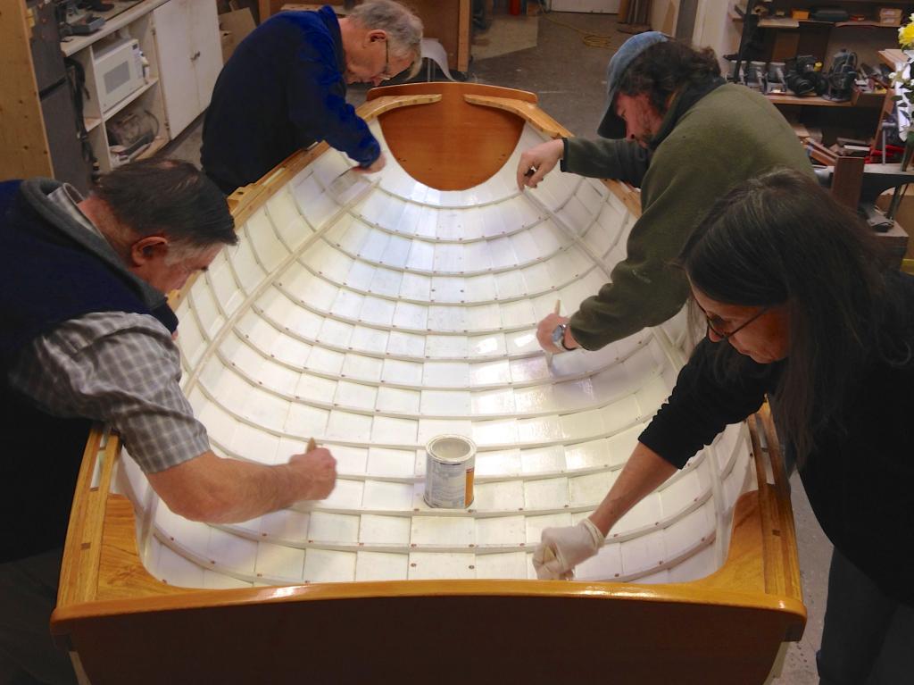 Well now, the pram is coming along swimmingly, and soon shall be swimming.  Painting and final fitting out is underway at Peter’s shop these past few weekends, so you won’t find us at the boat shed this saturday.